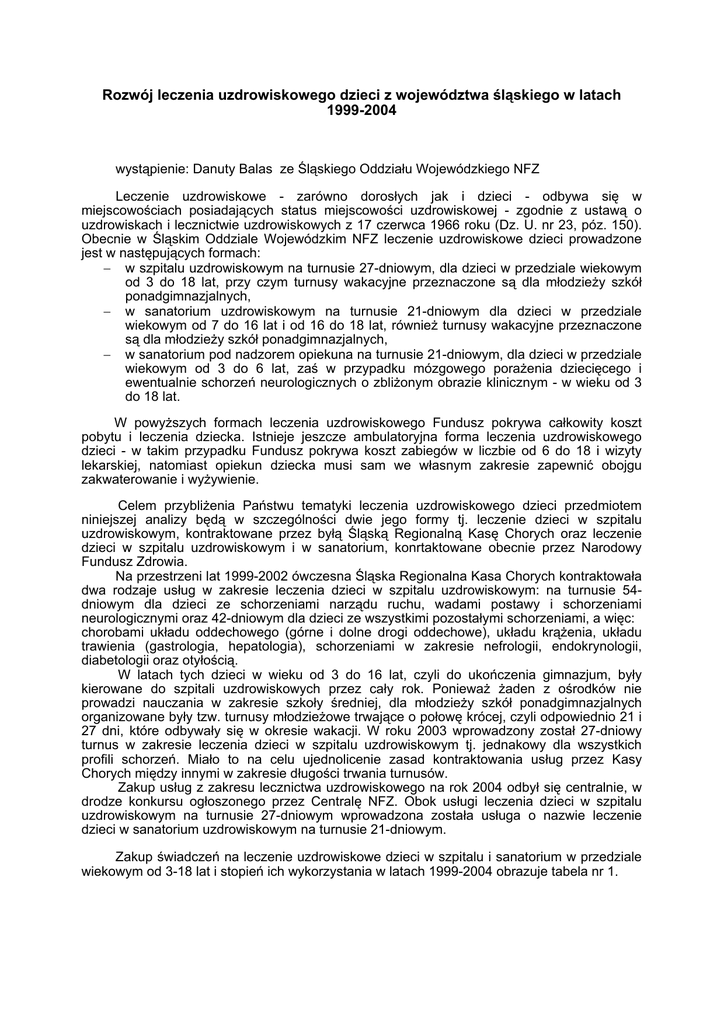 Rozwój leczenia uzdrowiskowego dzieci z województwa śląskiego w latach 1999-2004 wystąpienie: Danuty Balas ze Śląskiego Oddziału Wojewódzkiego NFZ Leczenie uzdrowiskowe - zarówno dorosłych jak i dzieci - odbywa się w miejscowościach posiadających status miejscowości uzdrowiskowej - zgodnie z ustawą o uzdrowiskach i lecznictwie uzdrowiskowych z 17 czerwca 1966 roku (Dz. U. nr 23, póz. 150). Obecnie w Śląskim Oddziale Wojewódzkim NFZ leczenie uzdrowiskowe dzieci prowadzone jest w następujących formach: − w szpitalu uzdrowiskowym na turnusie 27-dniowym, dla dzieci w przedziale wiekowym od 3 do 18 lat, przy czym turnusy wakacyjne przeznaczone są dla młodzieży szkół ponadgimnazjalnych, − w sanatorium uzdrowiskowym na turnusie 21-dniowym dla dzieci w przedziale wiekowym od 7 do 16 lat i od 16 do 18 lat, również turnusy wakacyjne przeznaczone są dla młodzieży szkół ponadgimnazjalnych, − w sanatorium pod nadzorem opiekuna na turnusie 21-dniowym, dla dzieci w przedziale wiekowym od 3 do 6 lat, zaś w przypadku mózgowego porażenia dziecięcego i ewentualnie schorzeń neurologicznych o zbliżonym obrazie klinicznym - w wieku od 3 do 18 lat. W powyższych formach leczenia uzdrowiskowego Fundusz pokrywa całkowity koszt pobytu i leczenia dziecka. Istnieje jeszcze ambulatoryjna forma leczenia uzdrowiskowego dzieci - w takim przypadku Fundusz pokrywa koszt zabiegów w liczbie od 6 do 18 i wizyty lekarskiej, natomiast opiekun dziecka musi sam we własnym zakresie zapewnić obojgu zakwaterowanie i wyżywienie. Celem przybliżenia Państwu tematyki leczenia uzdrowiskowego dzieci przedmiotem niniejszej analizy będą w szczególności dwie jego formy tj. leczenie dzieci w szpitalu uzdrowiskowym, kontraktowane przez byłą Śląską Regionalną Kasę Chorych oraz leczenie dzieci w szpitalu uzdrowiskowym i w sanatorium, konrtaktowane obecnie przez Narodowy Fundusz Zdrowia. Na przestrzeni lat 1999-2002 ówczesna Śląska Regionalna Kasa Chorych kontraktowała dwa rodzaje usług w zakresie leczenia dzieci w szpitalu uzdrowiskowym: na turnusie 54dniowym dla dzieci ze schorzeniami narządu ruchu, wadami postawy i schorzeniami neurologicznymi oraz 42-dniowym dla dzieci ze wszystkimi pozostałymi schorzeniami, a więc: chorobami układu oddechowego (górne i dolne drogi oddechowe), układu krążenia, układu trawienia (gastrologia, hepatologia), schorzeniami w zakresie nefrologii, endokrynologii, diabetologii oraz otyłością. W latach tych dzieci w wieku od 3 do 16 lat, czyli do ukończenia gimnazjum, były kierowane do szpitali uzdrowiskowych przez cały rok. Ponieważ żaden z ośrodków nie prowadzi nauczania w zakresie szkoły średniej, dla młodzieży szkół ponadgimnazjalnych organizowane były tzw. turnusy młodzieżowe trwające o połowę krócej, czyli odpowiednio 21 i 27 dni, które odbywały się w okresie wakacji. W roku 2003 wprowadzony został 27-dniowy turnus w zakresie leczenia dzieci w szpitalu uzdrowiskowym tj. jednakowy dla wszystkich profili schorzeń. Miało to na celu ujednolicenie zasad kontraktowania usług przez Kasy Chorych między innymi w zakresie długości trwania turnusów. Zakup usług z zakresu lecznictwa uzdrowiskowego na rok 2004 odbył się centralnie, w drodze konkursu ogłoszonego przez Centralę NFZ. Obok usługi leczenia dzieci w szpitalu uzdrowiskowym na turnusie 27-dniowym wprowadzona została usługa o nazwie leczenie dzieci w sanatorium uzdrowiskowym na turnusie 21-dniowym. Zakup świadczeń na leczenie uzdrowiskowe dzieci w szpitalu i sanatorium w przedziale wiekowym od 3-18 lat i stopień ich wykorzystania w latach 1999-2004 obrazuje tabela nr 1. ZAKUP ŚWIADCZEŃ NA LECZENIE UZDROWISKOWE DZIECI W SZPITALU I SANATORIUM W OKRESIE OD 1999 ROKU DO 2004 ROKU (W PRZEDZIALE WIEKOWYM OD 3 DO 18 LAT) l STOPIEŃ ICH WYKORZYSTANIA 1999 Rodzaje usług szpital dzieci 54 dni 2000 2001 2002 2003 1 2 1 2 1 2 1 2 6903 5741 2733 1600 2077 1737 1964 2002 3666 3510 2950 3230 3272 3188 84 80 170 232 260 276 145 194 280 166 szpital dzieci 42 dni szpital - turnus młodzieżowy 21 dni szpital - turnus młodzieżowy 27 dni szpital dzieci 27 dni 2004 1 2 1 2 6534 6518 5480 3690* 850 687* 6330 4377 sanatorium dzieci 21 dni Razem 6903 5741 6483 5190 5342 5393 TABELA NR 1 Uwaga: 1. oznacza liczbę skierowań zakupionych 2. oznacza liczbę skierowań wykorzystanych * wg stanu na 30.09.2004 r. 5776 5632 6534 6518 Jak wynika z tabeli, ani była Śląska Regionalna Kasa Chorych ani Śląski Oddział Wojewódzki NFZ nie zmniejszał zakupu liczby świadczeń z zakresu leczenia dzieci w szpitalu uzdrowiskowym. Tabela wskazuje, że w każdym roku stopień ich wykorzystania był niepełny, poza rokiem 2001 (niewielkie przekroczenie) kiedy udało się wysłać więcej młodzieży na leczenie uzdrowiskowe, aniżeli zostało zakontraktowane. Było to możliwe ze względu na istnienie w umowie zapisu pozwalającego na przesuwanie miejsc pomiędzy poszczególnymi kategoriami leczenia uzdrowiskowego pod warunkiem, że ogólna wartość umowy nie ulegnie zmianie, a świadczeniodawcy mieli możliwość przyjęcia większej liczby młodzieży. W związku z likwidacją Branżowej Kasy Chorych dla Służb Mundurowych zwiększyła się liczba dzieci ubezpieczonych w tutejszym Oddziale i w 2003 roku Śląski Oddział Wojewódzki Narodowego Funduszu Zdrowia zakupił 6534 skierowania tj. więcej niż w roku 2002. W roku bieżącym otrzymaliśmy z centralnego rozdzielnika 6330 miejsc; niestety nie jesteśmy w stanie zagospodarować dokonywanych zwrotów, ponieważ nie mamy skierowań oczekujących na potwierdzenie. Z tego samego powodu (brak skierowań) powstanie problem w obłożeniu turnusów rozpoczynających się po l stycznia 2005 r. Ogólnie w kraju obserwowana jest spadkowa tendencja we wpływie skierowań na leczenie uzdrowiskowe dzieci w poszczególnych oddziałach NFZ. Podobne zjawisko zauważa również Śląski ÓW NFZ. Wpływ skierowań na leczenie dzieci oraz 