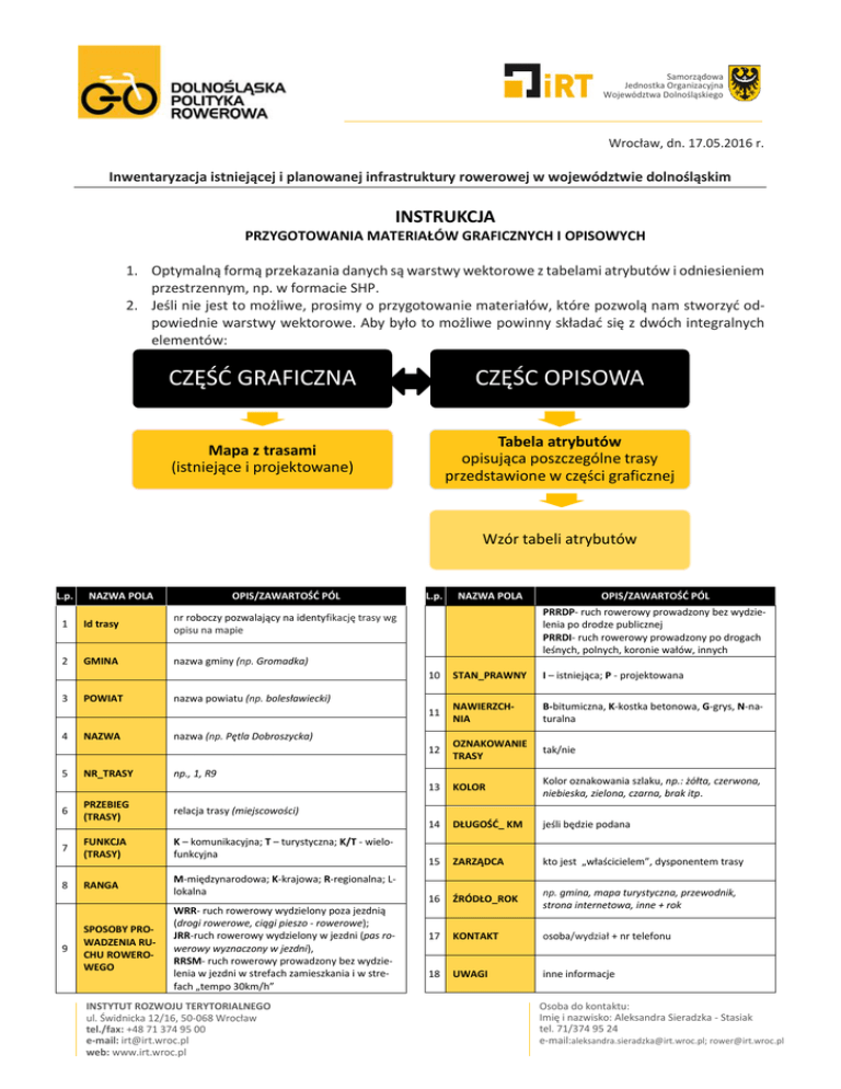 Samorządowa Jednostka Organizacyjna Województwa Dolnośląskiego Wrocław, dn. 17.05.2016 r. Inwentaryzacja istniejącej i planowanej infrastruktury rowerowej w województwie dolnośląskim INSTRUKCJA PRZYGOTOWANIA MATERIAŁÓW GRAFICZNYCH I OPISOWYCH 1. Optymalną formą przekazania danych są warstwy wektorowe z tabelami atrybutów i odniesieniem przestrzennym, np. w formacie SHP. 2. Jeśli nie jest to możliwe, prosimy o przygotowanie materiałów, które pozwolą nam stworzyć odpowiednie warstwy wektorowe. Aby było to możliwe powinny składać się z dwóch integralnych elementów: CZĘŚĆ GRAFICZNA CZĘŚC OPISOWA Mapa z trasami (istniejące i projektowane) Tabela atrybutów opisująca poszczególne trasy przedstawione w części graficznej Wzór tabeli atrybutów L.p. NAZWA POLA OPIS/ZAWARTOŚĆ PÓL 1 Id trasy nr roboczy pozwalający na identyfikację trasy wg opisu na mapie 2 GMINA nazwa gminy (np. Gromadka) 3 4 5 POWIAT NAZWA NR_TRASY STAN_PRAWNY I – istniejąca; P - projektowana 11 NAWIERZCHNIA B-bitumiczna, K-kostka betonowa, G-grys, N-naturalna 12 OZNAKOWANIE TRASY tak/nie 13 KOLOR Kolor oznakowania szlaku, np.: żółta, czerwona, niebieska, zielona, czarna, brak itp. 14 DŁUGOŚĆ_ KM jeśli będzie podana 15 ZARZĄDCA kto jest „właścicielem”, dysponentem trasy 16 ŹRÓDŁO_ROK np. gmina, mapa turystyczna, przewodnik, strona internetowa, inne + rok 17 KONTAKT osoba/wydział + nr telefonu 18 UWAGI inne informacje np., 1, R9 relacja trasy (miejscowości) 7 FUNKCJA (TRASY) K – komunikacyjna; T – turystyczna; K/T - wielofunkcyjna RANGA M-międzynarodowa; K-krajowa; R-regionalna; Llokalna SPOSOBY PROWADZENIA RUCHU ROWEROWEGO WRR- ruch rowerowy wydzielony poza jezdnią (drogi rowerowe, ciągi pieszo - rowerowe); JRR-ruch rowerowy wydzielony w jezdni (pas rowerowy wyznaczony w jezdni), RRSM- ruch rowerowy prowadzony bez wydzielenia w jezdni w strefach zamieszkania i w strefach „tempo 30km/h” INSTYTUT ROZWOJU TERYTORIALNEGO ul. Świdnicka 12/16, 50-068 Wrocław tel./fax: +48 71 374 95 00 e-mail: [email protected] web: www.irt.wroc.pl OPIS/ZAWARTOŚĆ PÓL 10 nazwa (np. Pętla Dobroszycka) PRZEBIEG (TRASY) 9 NAZWA POLA PRRDP- ruch rowerowy prowadzony bez wydzielenia po drodze publicznej PRRDI- ruch rowerowy prowadzony po drogach leśnych, polnych, koronie wałów, innych nazwa powiatu (np. bolesławiecki) 6 8 L.p. Osoba do kontaktu: Imię i nazwisko: Aleksandra Sieradzka - Stasiak tel. 71/374 95 24 e-mail:[email protected]; [email protected]