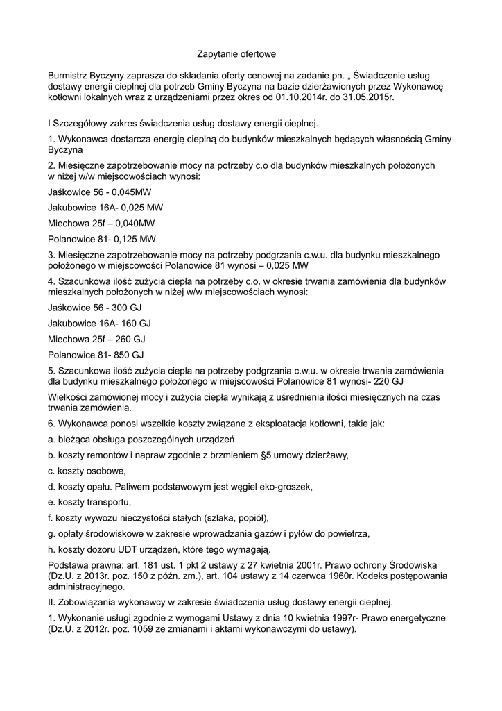 Zapytanie ofertowe Burmistrz Byczyny zaprasza do składania oferty cenowej na zadanie pn. „ Świadczenie usług dostawy energii cieplnej dla potrzeb Gminy Byczyna na bazie dzierŜawionych przez Wykonawcę kotłowni lokalnych wraz z urządzeniami przez okres od 01.10.2014r. do 31.05.2015r. I Szczegółowy zakres świadczenia usług dostawy energii cieplnej. 1. Wykonawca dostarcza energię cieplną do budynków mieszkalnych będących własnością Gminy Byczyna 2. Miesięczne zapotrzebowanie mocy na potrzeby c.o dla budynków mieszkalnych połoŜonych w niŜej w/w miejscowościach wynosi: Jaśkowice 56 - 0,045MW Jakubowice 16A- 0,025 MW Miechowa 25f – 0,040MW Polanowice 81- 0,125 MW 3. Miesięczne zapotrzebowanie mocy na potrzeby podgrzania c.w.u. dla budynku mieszkalnego połoŜonego w miejscowości Polanowice 81 wynosi – 0,025 MW 4. Szacunkowa ilość zuŜycia ciepła na potrzeby c.o. w okresie trwania zamówienia dla budynków mieszkalnych połoŜonych w niŜej w/w miejscowościach wynosi: Jaśkowice 56 - 300 GJ Jakubowice 16A- 160 GJ Miechowa 25f – 260 GJ Polanowice 81- 850 GJ 5. Szacunkowa ilość zuŜycia ciepła na potrzeby podgrzania c.w.u. w okresie trwania zamówienia dla budynku mieszkalnego połoŜonego w miejscowości Polanowice 81 wynosi- 220 GJ Wielkości zamówionej mocy i zuŜycia ciepła wynikają z uśrednienia ilości miesięcznych na czas trwania zamówienia. 6. Wykonawca ponosi wszelkie koszty związane z eksploatacja kotłowni, takie jak: a. bieŜąca obsługa poszczególnych urządzeń b. koszty remontów i napraw zgodnie z brzmieniem §5 umowy dzierŜawy, c. koszty osobowe, d. koszty opału. Paliwem podstawowym jest węgiel eko-groszek, e. koszty transportu, f. koszty wywozu nieczystości stałych (szlaka, popiół), g. opłaty środowiskowe w zakresie wprowadzania gazów i pyłów do powietrza, h. koszty dozoru UDT urządzeń, które tego wymagają. Podstawa prawna: art. 181 ust. 1 pkt 2 ustawy z 27 kwietnia 2001r. Prawo ochrony Środowiska (Dz.U. z 2013r. poz. 150 z późn. zm.), art. 104 ustawy z 14 czerwca 1960r. Kodeks postępowania administracyjnego. II. Zobowiązania wykonawcy w zakresie świadczenia usług dostawy energii cieplnej. 1. Wykonanie usługi zgodnie z wymogami Ustawy z dnia 10 kwietnia 1997r- Prawo energetyczne (Dz.U. z 2012r. poz. 1059 ze zmianami i aktami wykonawczymi do ustawy). Załącznik nr 2 do umowy sprzedaŜy ciepła Oferta cenowa Dane Wykonawcy: Nazwa: ........................................................................................................................................... Siedziba: ......................................................................................................................................... Numer telefonu firmy: ..................................... Numer faxu firmy….......................................... Bank i numer konta ........................................................................................................................ Osoba do kontaktu z Zamawiającym : ........................................................................................ Nawiązując do zapytania ofertowego dotyczącego: świadczenia usługi dostawy energii cieplnej na potrzeby centralnego ogrzewania i podgrzania ciepłej wody uŜytkowej w budynkach mieszkalnych będących własnością Gminy Byczyna na bazie dzierŜawionych przez Wykonawcę kotłowni wraz z urządzeniami ,przez okres od 01.10.2014r do 31.05.2015r. składam niniejszą ofertę zgodnie z wymaganiami zapytania ofertowego: Przedmiot 1 Ilość w GJ Dostawa energii Cena jedn. Wartość netto/GJ netto Stawka VAT Wartość brutto 1570 cieplnej c.o. 2 Dostawa energii cieplnej na potrzeby c.w.u. Razem 220 1790 Wartość słownie netto: ……………………………………………………………………………………………. Wartość słownie brutto: …………………………………………………………………………………………... II. Oświadczamy, Ŝe w cenie usługi zostały ujęte wszystkie koszty związane z kompleksową realizacją przedmiotu zamówienia. III. Oświadczamy, Ŝe zapoznaliśmy się ze Szczegółowym Zakresem Świadczenia usługi dostawy energii cieplnej zapytania ofertowego i nie wnosimy do niej zastrzeŜeń oraz zdobyliśmy konieczne informacje do przygotowania oferty. IV. Oświadczamy, Ŝe zawarte w zapytaniu ofertowym projekty umów zostały przez nas zaakceptowane. V. Zobowiązujemy się, w przypadku przyznania nam zamówienia, do zawarcia umów na warunkach określonych w projektach umów. ……………………………………………………………………………………………… podpis osoby uprawnionej do składania oświadczeń woli w imieniu Wykonawcy ………………… dn. ………………………… Załącznik Nr 2 do umowy dzierŜawy DzierŜawa kotłowni wraz z urządzeniami 1. Podstawowe dane określające przedmiot dzierŜawy i opłat z tytułu dzierŜawy. Charakterystyka obiektu: 1.1 Jaśkowice 56 Powierzchnia kotłowni: 16,46 m2 wraz ze składem opału Kotłownia produkuje ciepło dla potrzeb centralnego ogrzewania dla budynku mieszkalnego, zlokalizowana jest w piwnicach budynku. Paliwem podstawowym jest węgiel eko-groszek Kubatura budynku wynosi: 2.711,30 m3 Powierzchnia ogrzewanych pomieszczeń wynosi: 383,17 m2. Szacowane zapotrzebowanie na energię cieplną w okresie trwania umowy wynosi: 300GJ, moc zamówiona 0,045MW. Budynek posiada: 8 lokali mieszkalnych. Charakterystyka stanu technicznego obiektu. Stan techniczny systemu energetyczno-cieplnego dobry umoŜliwiający dostawę energii cieplnej. 1.2 Jakubowice 16A Powierzchnia kotłowni: 6,56m2 Powierzchnia składu opału: 6,56m2 Kotłownia produkuje ciepło dla potrzeb centralnego ogrzewania dla budynku mieszkalnego, zlokalizowana jest w lokalu kotłowni. Paliwem podstawowym jest węgiel eko- groszek Kubatura budynku mieszkalnego wynosi 1.175,37m3 Powierzchnia ogrzewanych 