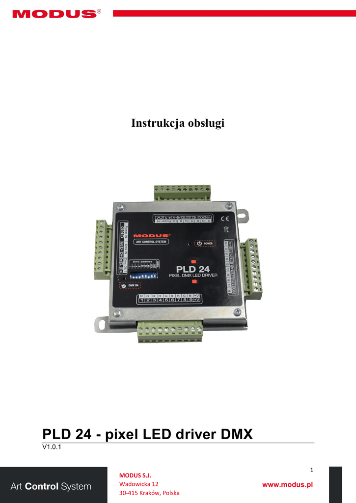 Instrukcja obsługi PLD 24 - pixel LED driver DMX V1.0.1 MODUS S.J. Wadowicka 12 30-415 Kraków, Polska 1 www.modus.pl Dziękujemy za zakup naszego urządzenia. Dołożyliśmy wszelkich starań, aby nasze produkty były najwyższej jakości i spełniły Państwa oczekiwania. Jeżeli macie Państwo jakiekolwiek uwagi i spostrzeżenia prosimy o przesłanie ich do nas. Będziemy wdzięczni za każde sugestie, które pomogą nam produkować urządzenia jeszcze lepsze i spełniające Państwa potrzeby. MODUS S.J. Wadowicka 12 30-415 Kraków, Polska 2 www.modus.pl Spis treści 1. Opis ogólny ...................................................................................................................................... 4 2. Podstawowe warunki bezpieczeństwa ............................................................................................ 4 3. Opis urządzenia ............................................................................................................................... 5 4. Schemat podłączeń.......................................................................................................................... 6 5. Ustawienia DIP SW (DMX mode, Stand-Alone Mode)..................................................................... 6 5.1. DMX mode ............................................................................................................................... 6 5.2. Stand alone mode.................................................................................................................... 7 6. Konserwacja i naprawy .................................................................................................................... 7 7. Parametry techniczne ...................................................................................................................... 8 8. Kontakt .........................................................................................Błąd! Nie zdefiniowano zakładki. MODUS S.J. Wadowicka 12 30-415 Kraków, Polska 3 www.modus.pl 1. Opis ogólny PIXEL DMX LED Driver jest 24 kanałowym urządzeniem przeznaczonym do sterowania diodami Led RGB ( taśmy Led, moduły itp.) Każde wyjście posiada obciążalność prądową wynoszącą 1000mA. Zasilany jest z bezpiecznego napięcia12VDC.Idealnie nadaje się do budowy wielokanałowych matryc-Pixeli Led RGB sterowanych za pomocą protokołu DMX 512. Polaryzacja drivera umożliwia podłączenie diod Led w układzie wspólnego plusa (common anode). Dzięki płaskiej metalowej obudowie możemy zamontować sterownik w trudnodostępnych miejscach. Zastosowany system rozłącznych złącz śrubowych, ułatwia montaż. Każde wyjście sterujące diodami Led jest zabezpieczone przeciw przeciążeniowo. Zabezpieczenia te chronią nie tylko sterownik, ale również instalacje Led przed uszkodzeniami. W przypadku przeciążenia zostaje wyłączony tylko ten kanał, w którym wystąpiła usterka. Po jej usunięciu driver wraca do poprawnej pracy. W urządzeniu zastosowano również zabezpieczenie przeciwzwarciowe i przeciwprzepięciowe linii sygnału DMX512. Driver posiada wbudowane programy testujące, umożliwiające w szybki sposób lokalizowanie ewentualnych pomyłek montażowych. Bardzo duża 16 bitowa rozdzielczość sterowania, oraz charakterystyka ściemniania dopasowana do wrażliwości oka ludzkiego powoduje, że wartość oświetlenia zmienia się w sposób liniowy i bardzo płynny. Wysoka częstotliwość odświeżania PWM wynosząca 1 KHz i zastosowana technologia “flicker free” powoduje, że driver idealnie nadaje się do stosowania w technice telewizyjnej (brak migotania obrazu w kamerach, aparatach fotograficznych). 2. Podstawowe warunki bezpieczeństwa PIXEL DMX LED Driver 24 x 1000mA jest urządzeniem zasilanym napięciem bezpiecznym 12V DC z wyspecjalizowanych zasilaczy, jednak podczas jego instalacji i użytkowania należy bezwzględnie przestrzegać podanych poniżej reguł: 1. Montaż modułu powinien być wykonany przez osobę posiadającą odpowiednie uprawnienia, zgodnie z opisem w instrukcji. 2. Urządzenie może być podłączone wyłącznie do napięcia stabilizowanego o obciążalności zgodnej z danymi technicznymi. 3. Moduł jest przeznaczony do użytku wewnętrznego. W przypadku zastosowań zewnętrznych należy zabezpieczyć moduł przed działaniem warunków atmosferycznych. 4. Należy chronić wszystkie przewody przed uszkodzeniami mechanicznymi i termicznymi. 5. Wszelkie naprawy mogą być wykonywane wyłącznie przy odłączonym zasilaniu. 6. Nie należy podłączać do zasilania urządzenia z widocznymi uszkodzeniami. 7. Należy bezwzględnie chronić PLD24 przed kontaktem z wodą i innymi płynami. 8. Unikać gwałtownych wstrząsów, a w szczególności upadków. 9. Nie włączać urządzeniach w pomieszczeniach o wilgotności powyżej 90%. 10. Urządzenia nie należy używać w pomieszczeniach o temperaturze niższej niż +2oC lub wyższej niż + 40oC. MODUS S.J. Wadowicka 12 30-415 Kraków, Polska 4 www.modus.pl 3. Opis urządzenia 1. Złącze zasilania(GND, +12V) i sygnału DMX 2. Złącza wyjściowe kanały 1-9 3. Złącza wyjściowe kanały 10-18 4. Złącze zasilania (+12V) i wyjściowe kanały 19-24 5. Kontrolka obecności zasilania 6. Kontrolka obecności sygnału DMX512 7. Dip Sw 10 ustawianie adresu DMX, oraz uruchamianie wbudowanych programów i scen testujących MODUS S.J. Wadowicka 12 30-415 Kraków, Polska 5 www.modus.pl 4. Schemat podłączeń Diody LED podłączane są do wyjść sterujących i zasilania w sposób przedstawiony na rysunku. Na każdej linii może znajdować się określona ilość źródeł światła, uzależniona od pobieranej mocy, a obciążalność każdej linii wynosi max. 1000mA. Dlatego po podłączeniu wszystkich odbiorników, należy zsumować wszystkie linie i dobrać zasilacz o odpowiedniej mocy. UWAGA!!! Obciążalność prądowa pojedynczego podłączenia zasilania nie może być w