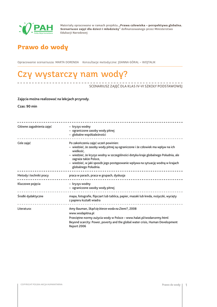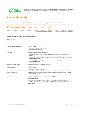 Materiały opracowane w ramach projektu „Prawa człowieka – perspektywa globalna. Scenariusze zajęć dla dzieci i młodzieży” dofinansowanego przez Ministerstwo Edukacji Narodowej Prawo do wody Opracowanie scenariusza: Marta Dorenda Konsultacje metodyczne: Joanna Góral – Wojtalik Czy wystarczy nam wody? Scenariusz zajęć dla klas IV-VI szkoły podstawowej Zajęcia można realizować na lekcjach przyrody. Czas: 90 min Główne zagadnienia zajęć – kryzys wodny – ograniczone zasoby wody pitnej – globalne współzależności Cele zajęć Po zakończeniu zajęć uczeń powinien: – wiedzieć, że zasoby wody pitnej są ograniczone i że człowiek ma wpływ na ich wielkość, – wiedzieć, że kryzys wodny w szczególności dotyka kraje globalnego Południa, ale zagraża także Polsce, – wiedzieć, w jaki sposób jego postępowanie wpływa na sytuację wodną w krajach globalnego Południa. Metody i techniki pracy praca w parach, praca w grupach, dyskusja Kluczowe pojęcia – kryzys wodny – ograniczone zasoby wody pitnej Środki dydaktycznemapa, fotografie, flipczart lub tablica, papier, mazaki lub kreda, nożyczki, wycięty z papieru kształt wiadra Literatura: Amy Bauman, Skąd się bierze woda na Ziemi?, 2008 www.wodapitna.pl Przeciętne normy zużycia wody w Polsce – www.halat.pl/wodanormy.html Beyond scarcity: Power, poverty and the global water crisis, Human Development Report 2006 Copyright Polska Akcja Humanitarna Prawo do wody Przebieg zajęć Czas Co trzeba zrobić? 5 min Rozpocznij zajęcia, przedstaw cele. 10 min Uczniowie pracują w parach. Zadaniem każdej pary jest znalezienie flipczart i mazaki dziedziny życia, w której niepotrzebna jest woda. Każda z par lub dyskutuje krótko nad trafnością swoich propozycji, a następnie tablica i kreda przedstawia na forum klasy wyniki swojej pracy. Propozycje uczniów zapisz na tablicy lub flipczarcie. 10 min Poproś każdego z uczniów, aby oszacował, ile wody zużywa każdego dnia, a obliczenia zapisał na kartce. Uczniowie prezentują pozostałym swoje obliczenia. Zapisuj podawane przez uczniów liczby na flipczarcie lub tablicy. Grupa wspólnie decyduje, czy ilość zużywanej wody oceniają jako dużą czy małą. Poproś uczniów, aby zachowali swoje obliczenia. papier, długopisy lub mazaki do notowania, tablica i kreda lub flipczart i mazaki Pamiętaj, aby zwrócić uwagę na czynności wymagające użycia dużej ilości wody: spłukiwanie wody w toalecie, pranie, zmywanie. 15 min Uczniowie pracują w parach. Poproś ich, by wyobrazili sobie, że wskutek kryzysu wodnego, który ich dotknął, są zmuszeni zmniejszyć ilość zużywanej wody o połowę. Do nich należy decyzja o tym, z czego zrezygnują lub które czynności będą wykonywać z mniejszym zużyciem wody. Przedstawiciele par prezentują wyniki pracy pozostałym osobom. papier, mazaki do notowania Wyniki pracy poszczególnych par zapewne będą się różnić. Podczas prezentacji można przeprowadzić dyskusję na temat racjonalnego użytkowania oraz oszczędzania wody. 15 min Zaprezentuj i objaśnij uczniom mapę pokazującą dostęp do wody słodkiej na świecie (dane z 2000 roku). Zwróć uwagę na sytuację, w jakiej znajduje się Polska. Podziel uczniów na 5 grup i poproś, aby rozdzielili 15 litrów wody – ilość, jaką dziennie dysponuje mieszkaniec Mozambiku – tak, aby zaspokoić potrzeby przeciętnego Europejczyka. Aby wykonać zadanie, każda z grup przypisuje części 15-litrowego wiadra z wodą odpowiednim czynnościom. Podczas omawiania zadania zwróć uwagę uczniów na fakt, iż nie jest to abstrakcyjna, wyimaginowana sytuacja, lecz przedstawienie realiów życia w krajach globalnego Południa. Podkreśl, iż uczniowie przez swoje postępowanie mają wpływ na te warunki. Materiał pomocniczy nr 1 – Mapa pokazująca dostęp do wody słodkiej na świecie w 2000 roku wycięty z papieru kształt wiadra, mazaki, nożyczki Aby podzielić wiadro, uczniowie mogą narysować na nim linie lub pociąć je na kawałki. 15 min Podziel uczniów na 5 grup. Każda z grup otrzymuje jedną fotografię. Zadaniem uczniów jest ustalenie co łączy ich z osobami przedstawionymi na fotografiach oraz znalezienie sposobu poprawienia ich sytuacji, możliwego do zrealizowania przez mieszkańców krajów globalnej Północy. Materiał pomocniczy W zależności od wieku nr 2 – fotografie, uczniów i stopnia zrozumienia tematu, mogą oni wyszukiwać papier, mazaki najprostsze powiązania (pomoc w czynnościach domowych) po złożone (związek kryzysu wodnego z analfabetyzmem wśród dzieci z krajów Południa) 15 min Podziel uczniów na 5 grup. Poinformuj ich, że sieć telefonii komórFlipczart, mazaki do kowej poprosiła ich, aby zredagowali SMS-owe przypomnienia notowania wysyłane użytkownikom telefonów komórkowych, dotyczące sposobów zapobiegania kryzysowi wodnemu. Każda z grup ma za zadanie zredagować jak najwięcej takich wiadomości w ciągu 7 minut i zapisać je na flipczarcie. Następnie wiadomości są prezentowane pozostałym uczniom i dyskutowane pod kątem trafności. 5 min Omówienie i zakończenie zajęć Prawo do wody Materiały Uwagi Jeśli uczniowie mają problem ze zrozumieniem zadania, możesz zaproponować jego uszczegółowienie, np. ułożenie haseł odpowiadających na pytanie „Jak oszczędzać wodę?” Copyright Polska Akcja Humanitarna Materiały pomocnicze dla nauczyciela Materiał pomocniczy nr 1 Materiał pomocniczy nr 2 Sri Lanka, grudzień 2004, Po fali Tsunami mieszkańcy wybrzeży potrzebowali bezpiecznej wody pitnej. Chłopiec trzyma butelkowaną wodę otrzymaną w ramach pomocy humanitarnej. Copyright Polska Akcja Humanitarna Prawo do wody Sudan Południowy 2006, Transport wody ze studni do domu Czeczenia 2004, Mieszkańcy Groznego czekają w kolejce po wodę pitną dostarczaną przez beczkowozy w ramach projektu wodnego realizowanego przez PAH Prawo do wody Copyright Polska Akcja Humanitarna 