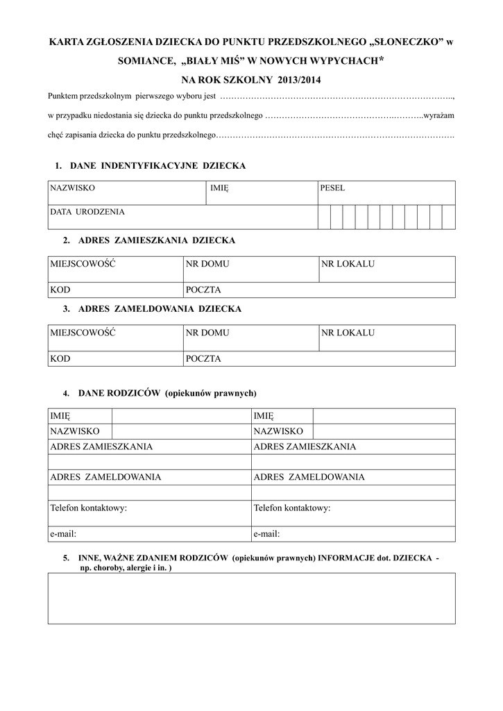KARTA ZGŁOSZENIA DZIECKA DO PUNKTU PRZEDSZKOLNEGO „SŁONECZKO” w SOMIANCE, „BIAŁY MIŚ” W NOWYCH WYPYCHACH* NA ROK SZKOLNY 2013/2014 Punktem przedszkolnym pierwszego wyboru jest ……………………………………………………………………….., w przypadku niedostania się dziecka do punktu przedszkolnego ……………………………………….………..wyrażam chęć zapisania dziecka do punktu przedszkolnego…………………………………………………………………………. 1. DANE INDENTYFIKACYJNE DZIECKA NAZWISKO IMIĘ PESEL DATA URODZENIA 2. ADRES ZAMIESZKANIA DZIECKA MIEJSCOWOŚĆ NR DOMU KOD POCZTA NR LOKALU 3. ADRES ZAMELDOWANIA DZIECKA MIEJSCOWOŚĆ NR DOMU KOD POCZTA 4. NR LOKALU DANE RODZICÓW (opiekunów prawnych) IMIĘ IMIĘ NAZWISKO NAZWISKO ADRES ZAMIESZKANIA ADRES ZAMIESZKANIA ADRES ZAMELDOWANIA ADRES ZAMELDOWANIA Telefon kontaktowy: Telefon kontaktowy: e-mail: e-mail: 5. INNE, WAŻNE ZDANIEM RODZICÓW (opiekunów prawnych) INFORMACJE dot. DZIECKA np. choroby, alergie i in. ) 6. KRYTERIA USTAWOWE PPRZYJĘCIA DO PUNKTU PRZEDSZKOLNEGO właściwą kratkę) ( wpisać x we Tak Nie 1. Dziecko samotnie wychowywane przez matkę lub ojca. 2. Dziecko matki lub ojca, wobec którego orzeczono znaczny lub umiarkowany stopień niepełnosprawności bądź całkowitą niezdolność do pracy lub niezdolność do samodzielnej egzystencji. 3. Dziecko umieszczone w rodzinie zastępczej. 7. DODATKOWE KRYTERIA PRZYJĘCIA DO PUNKTU PRZEDSZKOLNEGO ( wpisać x we właściwą kratkę ) Tak Nie 1. Dziecko w roku poprzednim uczęszczało do przedszkola „Słoneczko” lub „Biały Miś” 2. Dziecko obojga rodziców pracujących. 3. Dziecko, którego rodzeństwo ma orzeczony znaczny lub umiarkowany stopień niepełnosprawności. 4. Dziecko z rodziny wielodzietnej (troje i więcej dzieci). 8. OŚWIADCZENIE DOTYCZĄCE TREŚCI ZGŁOSZENIA I OCHRONY DANYCH OSOBOWYCH Wyrażam/y zgodę na zbieranie, przetwarzanie i wykorzystanie w celach związanych z przyjęciem i pobytem w punkcie przedszkolnym naszego dziecka, danych osobowych naszych i dziecka, zgodnie z ustawa z dnia 29 sierpnia 1997 r. o ochronie danych osobowych. Przyjmujemy do wiadomości, iż mogę zostać poproszony o okazanie dokumentów w celu weryfikacji danych podanych w karcie zgłoszenia. Miejscowość, data ........................... ………..………………………………… podpis matki (opiekuna prawnego) * zaznaczyć właściwe …....……………….……………………… podpis ojca (opiekuna prawnego)