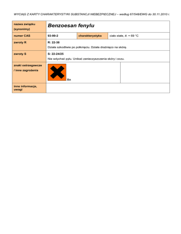 WYCIĄG Z KARTY CHARAKTERYSTYKI SUBSTANCJI NIEBEZPIECZNEJ – według 67/548/EWG do 30.11.2010 r. nazwa związku (synonimy) Benzoesan fenylu numer CAS 93-99-2 zwroty R R: 22-38 charakterystyka ciało stałe, tt. = 69 °C Działa szkodliwie po połknięciu. Działa drażniąco na skórę. zwroty S S: 22-24/25 Nie wdychać pyłu. Unikać zanieczyszczenia skóry i oczu. znaki ostrzegawcze / inne zagrożenia Xn inne informacje, uwagi WYCIĄG Z KARTY CHARAKTERYSTYKI SUBSTANCJI NIEBEZPIECZNEJ – zgodnie z GHS i CLP od 01.12.2010 r. nazwa związku (synonimy) Benzoesan fenylu numer CAS 93-99-2 charakterystyka zwroty H H 315 - działa drażniąco na skórę ciało stałe, tt. = 69 °C H 302 - działa szkodliwie po połknięciu zwroty P piktogramy i hasło ostrzegawcze Działanie drażniące na skórę (Kat. 2) / inne zagrożenia UWAGA! inne informacje, uwagi Opracował: Grzegorz Zając