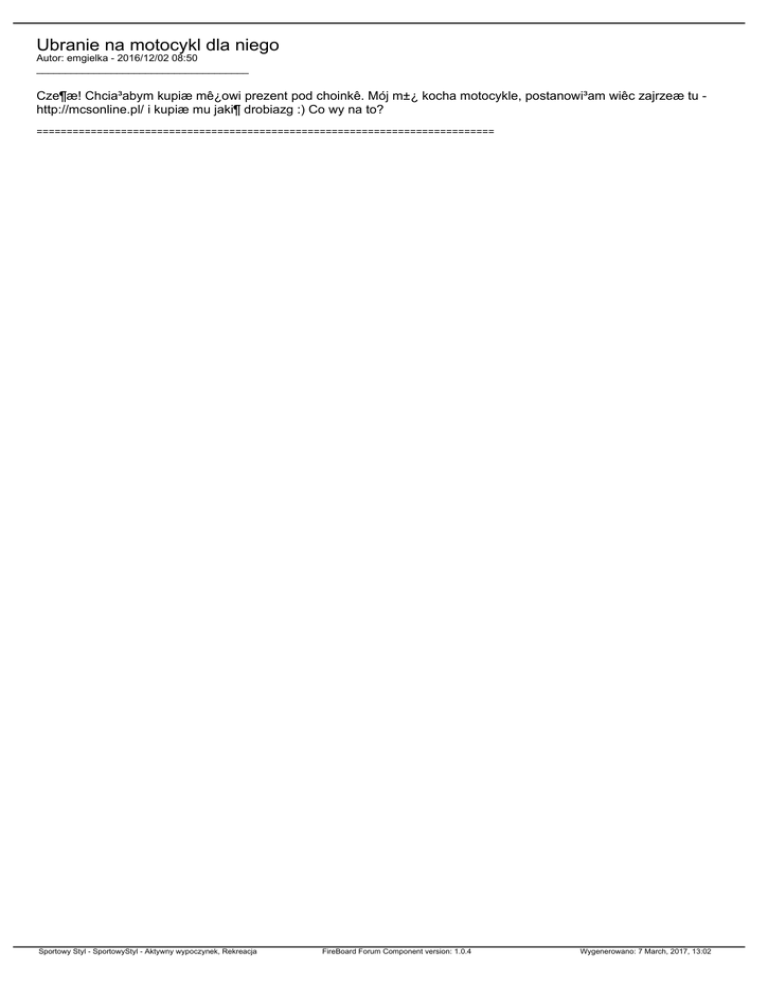 Ubranie na motocykl dla niego Autor: emgielka - 2016/12/02 08:50 _____________________________________ Cze¶æ! Chcia³abym kupiæ mê¿owi prezent pod choinkê. Mój m±¿ kocha motocykle, postanowi³am wiêc zajrzeæ tu http://mcsonline.pl/ i kupiæ mu jaki¶ drobiazg :) Co wy na to? ============================================================================ Sportowy Styl - SportowyStyl - Aktywny wypoczynek, Rekreacja FireBoard Forum Component version: 1.0.4 Wygenerowano: 7 March, 2017, 13:02