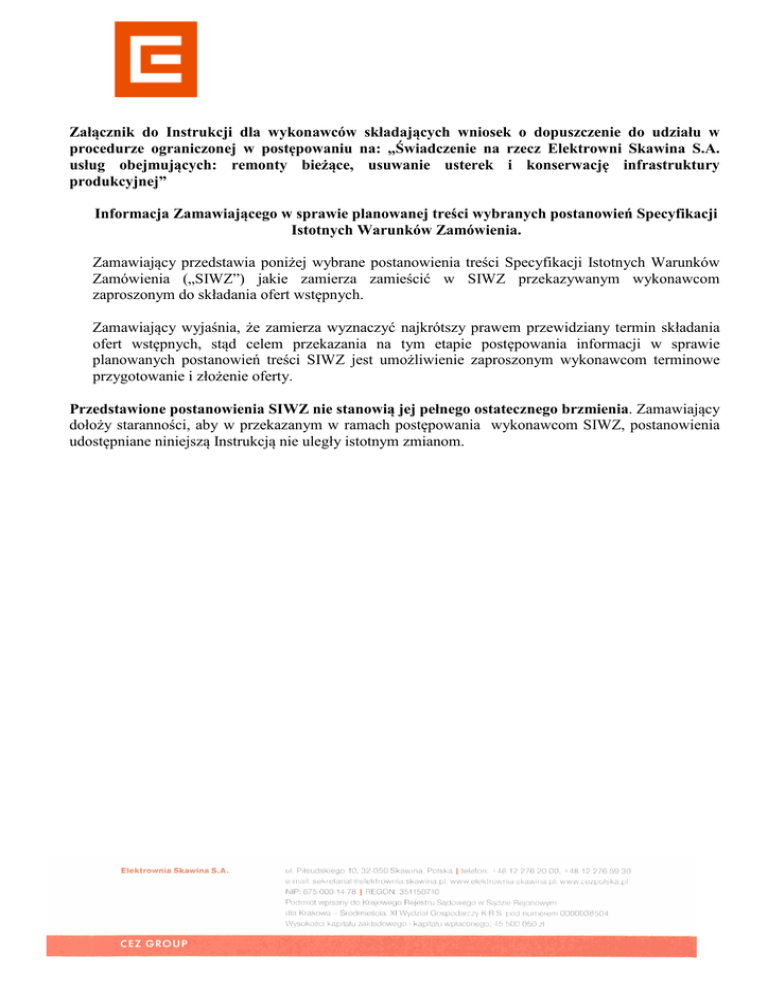 Załącznik do Instrukcji dla wykonawców składających wniosek o dopuszczenie do udziału w procedurze ograniczonej w postępowaniu na: „Świadczenie na rzecz Elektrowni Skawina S.A. usług obejmujących: remonty bieżące, usuwanie usterek i konserwację infrastruktury produkcyjnej” Informacja Zamawiającego w sprawie planowanej treści wybranych postanowień Specyfikacji Istotnych Warunków Zamówienia. Zamawiający przedstawia poniżej wybrane postanowienia treści Specyfikacji Istotnych Warunków Zamówienia („SIWZ”) jakie zamierza zamieścić w SIWZ przekazywanym wykonawcom zaproszonym do składania ofert wstępnych. Zamawiający wyjaśnia, że zamierza wyznaczyć najkrótszy prawem przewidziany termin składania ofert wstępnych, stąd celem przekazania na tym etapie postępowania informacji w sprawie planowanych postanowień treści SIWZ jest umożliwienie zaproszonym wykonawcom terminowe przygotowanie i złożenie oferty. Przedstawione postanowienia SIWZ nie stanowią jej pełnego ostatecznego brzmienia. Zamawiający dołoży staranności, aby w przekazanym w ramach postępowania wykonawcom SIWZ, postanowienia udostępniane niniejszą Instrukcją nie uległy istotnym zmianom. SPECYFIKACJA ISTOTNYCH WARUNKÓW ZAMÓWIENIA dla zamówienia udzielonego w procedurze ograniczonej na realizację zadania: Strona 2 z 136 „Świadczenie na rzecz Elektrowni Skawina S.A. usług obejmujących: remonty bieżące, usuwanie usterek i konserwację infrastruktury produkcyjnej” SPECYFIKACJA ISTOTNYCH WARUNKÓW ZAMÓWIENIA dla zamówienia udzielonego w procedurze ograniczonej na realizację zadania: „Świadczenie na rzecz Elektrowni Skawina S.A. usług obejmujących: remonty bieżące, usuwanie usterek i konserwację infrastruktury produkcyjnej” (ZAMÓWIENIE SEKTOROWE) Zawartość specyfikacji: Cześć I Część II Część III Część IV Zapisy formalno – prawne Opis przedmiotu Zamówienia Formularz oferty Istotne dla Zamawiającego postanowienia Umowy SPIS TREŚCI SPIS TREŚCI CZĘŚĆ I – ZAPISY FORMALNO PRAWNE 1. Definicje 2. Informacje ogólne 3. Nazwa i adres Zamawiającego 4. Tryb udzielenia zamówienia 5. Przedmiot Zamówienia 6. Termin realizacji przedmiotu zamówienia 7. Opis sposobu przygotowania ofert 8. Opis sposobu udzielania wyjaśnień treści SIWZ 9. Opis sposobu obliczania ceny oferty 10. Wymagania dotyczące wadium 11. Miejsce i termin składania ofert 12. Termin związania z ofertą 13. Otwarcie i ocena ofert 14. Kryteria wyboru najkorzystniejszej oferty 15 Zabezpieczenie należytego wykonania umowy 16. Udzielenie zamówienia 17. Zamówienia dodatkowe 18. Pouczenie o środkach ochrony prawnej CZĘŚĆ II OPIS PRZEDMIOTU ZAMÓWIENIA CZĘŚĆ III FORMULARZ OFERTY CZĘŚĆ IV ISTOTNE DLA ZAMAWIAJĄCEGO POSTANOWIENIA UMOWY Skawina, grudzień 2013 3 4 5 6 6 6 7 13 14 16 16 17 18 19 19 20 21 22 23 23 25 33 37 SPECYFIKACJA ISTOTNYCH WARUNKÓW ZAMÓWIENIA dla zamówienia udzielonego w procedurze ograniczonej na realizację zadania: „Świadczenie na rzecz Elektrowni Skawina S.A. usług obejmujących: remonty bieżące, usuwanie usterek i konserwację infrastruktury produkcyjnej” CZĘŚĆ I ZAPISY FORMALNO – PRAWNE Strona 4 z 136 SPECYFIKACJA ISTOTNYCH WARUNKÓW ZAMÓWIENIA dla zamówienia udzielonego w procedurze ograniczonej na realizację zadania: Strona 5 z 136 „Świadczenie na rzecz Elektrowni Skawina S.A. usług obejmujących: remonty bieżące, usuwanie usterek i konserwację infrastruktury produkcyjnej” 1. DEFINICJE Zamawiający Elektrownia Skawina S.A. ul. Piłsudskiego 10 32-050 Skawina Strona internetowa - www.cezpolska.pl Zamawiającego Wykonawca rozumie się Wykonawcę w myśl zapisów art. 11 ust. 1 oraz ust.2 Dyrektywy 2004/17/WE z dnia 31 marca 2004r. - koordynacja procedury udzielania zamówień przez podmioty działające w sektorach gospodarki wodnej, energetyki, transportu i usług pocztowych Dyrektywa Dyrektywa 2004/17/WE z dnia 31 marca 2004 r. koordynacja procedury udzielania zamówień przez podmioty działające w sektorach gospodarki wodnej, energetyki, transportu i usług pocztowych (Dz. U. UE L z dnia 30 kwietnia 2004 r.) Cena należy przez to rozumieć cenę w rozumieniu art. 3 ust. 1 pkt 1 - ustawy z dnia 5 lipca 2001r. o cenach (Dz.U. Nr 97, poz. 1050 z późn. zm.) - specyfikacja istotnych warunków zamówienia SIWZ Postępowanie - postępowanie o udzielanie zamówienia Komisja Przetargowa należy przez to rozumieć komisję wyłonioną zgodnie Procedurą udzielania zamówień przez spółki Grupy CEZ w Polsce przy zastosowaniu Dyrektywy 2004/17/WE oraz Załącznika nr 2 KC - Kodeks Cywilny 2. INFORMACJE OGÓLNE 1. Wykonawca winien uważnie zapoznać się z treścią niniejszej SIWZ. 2. Wykonawca przedstawi ofertę, której treść będzie zgodna z wymogami niniejszej SIWZ. 3. Zamawiający dołożył wszelkich starań, aby treść niniejszej SIWZ spełniała wymagania zapisów Dyrektywy. 4. W sprawach nieuregulowanych w niniejszej SIWZ zastosowanie mają przepisy KC. SPECYFIKACJA ISTOTNYCH WARUNKÓW ZAMÓWIENIA dla zamówienia udzielonego w procedurze ograniczonej na realizację zadania: Strona 6 z 136 „Świadczenie na rzecz Elektrowni Skawina S.A. usług obejmujących: remonty bieżące, usuwanie usterek i konserwację infrastruktury produkcyjnej” 3. NAZWA I ADRES ZAMAWIAJĄCEGO 3.1. Elektrownia Skawina S.A. ul. Piłsudskiego 10, 32-050 Skawina Telefon: + 48 (012) 277 80 81 Faks: +48 (012) 277 85 55 e-mail: [email protected] 3.2. Zamawiający wskazuje następujący adres do korespondencji: Elektrownia Skawina S.A. ul. Piłsudskiego 10, 32-050 Skawina Telefon: + 48 (012) 277 80 81 Faks: +48 (012) 277 85 55 4. TRYB UDZIELENIA ZAMÓWIENIA 1. Postępowanie o udzielenie zamówienia prowadzone jest w procedurze ograniczonej na podstawie Dyrektywy. 2. Wartość zamówienia przekracza równowartość 400 000 euro. 3. Wszelkie informacje przedstawione w niniejszej SIWZ służyć mają wyłącznie przygotowaniu oferty i w żadnym w