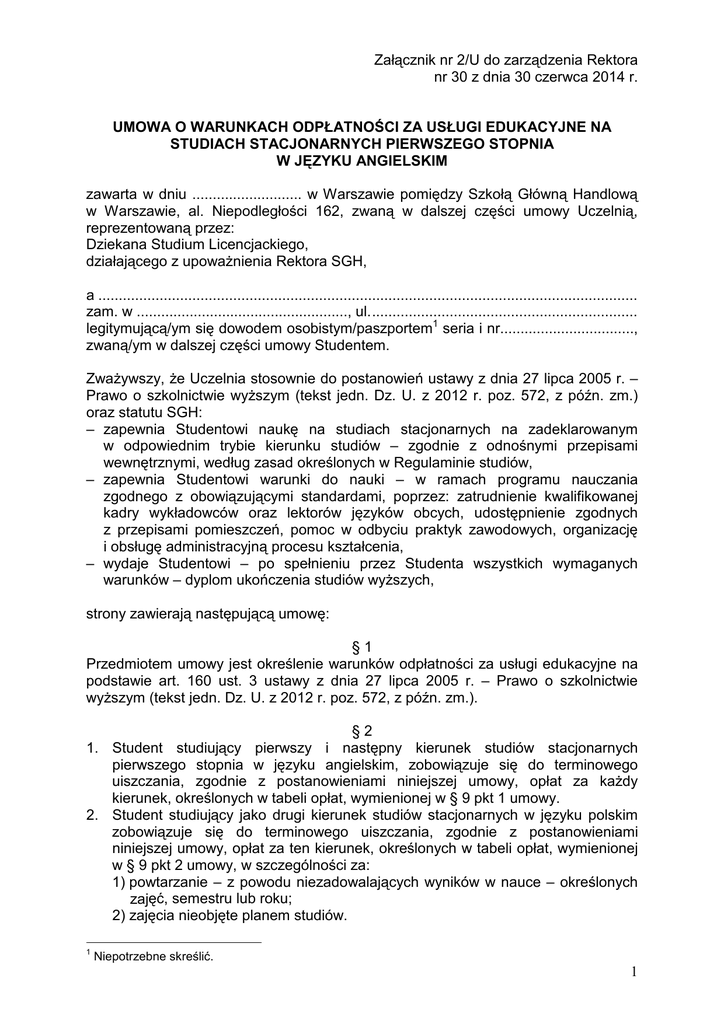 Załącznik nr 2/U do zarządzenia Rektora nr 30 z dnia 30 czerwca 2014 r. UMOWA O WARUNKACH ODPŁATNOŚCI ZA USŁUGI EDUKACYJNE NA STUDIACH STACJONARNYCH PIERWSZEGO STOPNIA W JĘZYKU ANGIELSKIM zawarta w dniu ........................... w Warszawie pomiędzy Szkołą Główną Handlową w Warszawie, al. Niepodległości 162, zwaną w dalszej części umowy Uczelnią, reprezentowaną przez: Dziekana Studium Licencjackiego, działającego z upowaŜnienia Rektora SGH, a .................................................................................................................................... zam. w ...................................................., ul. ................................................................. legitymującą/ym się dowodem osobistym/paszportem1 seria i nr................................., zwaną/ym w dalszej części umowy Studentem. ZwaŜywszy, Ŝe Uczelnia stosownie do postanowień ustawy z dnia 27 lipca 2005 r. – Prawo o szkolnictwie wyŜszym (tekst jedn. Dz. U. z 2012 r. poz. 572, z późn. zm.) oraz statutu SGH: – zapewnia Studentowi naukę na studiach stacjonarnych na zadeklarowanym w odpowiednim trybie kierunku studiów – zgodnie z odnośnymi przepisami wewnętrznymi, według zasad określonych w Regulaminie studiów, – zapewnia Studentowi warunki do nauki – w ramach programu nauczania zgodnego z obowiązującymi standardami, poprzez: zatrudnienie kwalifikowanej kadry wykładowców oraz lektorów języków obcych, udostępnienie zgodnych z przepisami pomieszczeń, pomoc w odbyciu praktyk zawodowych, organizację i obsługę administracyjną procesu kształcenia, – wydaje Studentowi – po spełnieniu przez Studenta wszystkich wymaganych warunków – dyplom ukończenia studiów wyŜszych, strony zawierają następującą umowę: §1 Przedmiotem umowy jest określenie warunków odpłatności za usługi edukacyjne na podstawie art. 160 ust. 3 ustawy z dnia 27 lipca 2005 r. – Prawo o szkolnictwie wyŜszym (tekst jedn. Dz. U. z 2012 r. poz. 572, z późn. zm.). §2 1. Student studiujący pierwszy i następny kierunek studiów stacjonarnych pierwszego stopnia w języku angielskim, zobowiązuje się do terminowego uiszczania, zgodnie z postanowieniami niniejszej umowy, opłat za kaŜdy kierunek, określonych w tabeli opłat, wymienionej w § 9 pkt 1 umowy. 2. Student studiujący jako drugi kierunek studiów stacjonarnych w języku polskim zobowiązuje się do terminowego uiszczania, zgodnie z postanowieniami niniejszej umowy, opłat za ten kierunek, określonych w tabeli opłat, wymienionej w § 9 pkt 2 umowy, w szczególności za: 1) powtarzanie – z powodu niezadowalających wyników w nauce – określonych zajęć, semestru lub roku; 2) zajęcia nieobjęte planem studiów. 1 Niepotrzebne skreślić. 1 3. Student studiujący drugi kierunek studiów stacjonarnych w języku polskim i niespełniający kryteriów, o których mowa w art. 170a ust. 4 ustawy z dnia 27 lipca 2005 r. – Prawo o szkolnictwie wyŜszym (tekst jedn. Dz. U. z 2012 r. poz. 572, z późn. zm.), zobowiązuje się do terminowego uiszczania, zgodnie z postanowieniami niniejszej umowy, opłat określonych w tabeli opłat, wymienionej w § 9 pkt 3 umowy. 4. Student, który na I roku studiów studiował drugi kierunek zgodnie z ust. 2 i nie spełnił kryteriów, o których mowa w art. 170a ust. 4 ustawy z dnia 27 lipca 2005 r. – Prawo o szkolnictwie wyŜszym (tekst jedn. Dz. U. z 2012 r. poz. 572, z późn. zm.), zobowiązuje się do wniesienia, niezaleŜnie od opłat naleŜnych na podstawie tabeli wymienionej w § 9 pkt 2, opłat za I rok studiów, określonych w poz. 4–7 tabeli opłat, wymienionej w § 9 pkt 3 umowy, w terminie jednego miesiąca od dnia, w którym został zawiadomiony o niespełnieniu ww. kryteriów, a w przypadku rozłoŜenia płatności na raty w terminie określonym we właściwej tabeli albo w decyzji Rektora. 5. Student studiujący trzeci lub kolejny kierunek studiów w języku polskim zobowiązuje się do terminowego uiszczania, zgodnie z postanowieniami niniejszej umowy, opłat określonych w tabeli opłat, wymienionej w § 9 pkt 3 umowy. 6. Poza opłatami, o których mowa w ust. 1-5, Student zobowiązany jest wnosić opłaty, których wysokość i warunki wnoszenia określa zarządzenie Rektora nr 15 z dnia 25 kwietnia 2014 r. w sprawie odpłatności za niektóre dokumenty z przebiegu studiów wydawane w Szkole Głównej Handlowej w Warszawie. 7. Student zobowiązuje się do pokrywania kosztów korespondencji prowadzonej z nim przez Uczelnię w sprawach indywidualnych związanych z egzekwowaniem jego obowiązków wynikających z Regulaminu studiów oraz niniejszej umowy, doręczanej za potwierdzeniem odbioru, w wysokości ryczałtowej 5,60 zł za przesyłkę. §3 1. Opłaty, o których mowa w § 2 ust. 1–5 i 7, z zastrzeŜeniem ust. 2, obowiązują przez czas trwania umowy. 2. W przypadku zmian kosztów uruchomienia i prowadzenia studiów, wynikających z przyczyn od Uczelni niezaleŜnych, Uczelnia zastrzega sobie prawo odpowiedniego dostosowania – z początkiem kolejnego semestru – wysokości opłat określonych w § 2 ust. 1–5, w tym do ich podwyŜszenia. Nie obejmuje to kwot opłaconych z góry. 3. Zmiana wysokości opłat, o których mowa w ust. 2, nie stanowi zmiany niniejszej umowy i dla swojej skuteczności wymaga poinformowania Studenta z miesięcznym wyprzedzeniem. 4. Opłata za naukę na studiach, o których mowa w § 2 ust. 1–5, odzwierciedla koszt przygotowania i realizacji programu studiów. W przypadku realizacji programu studiów w okresie krótszym niŜ planowy, opłata podlega uiszczeniu w całości. 5. W uzasadnionych sytuacjach, na pisemny wniosek Studenta, Rektor SGH moŜe wyrazić zgodę na rozłoŜenie płatności na raty lub odroczenie terminu płatności. 6. Student zobowiązany jest do okazania dowodu wniesienia opłaty na wezwanie upowaŜnionych pracowników Uczelni. 7. Za datę wniesienia opłaty uwaŜa s