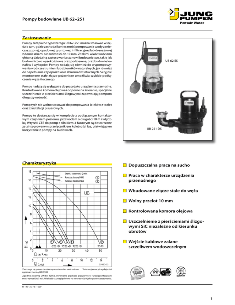 Pompy budowlane UB 62–251 Zastosowanie Pompy zatapialne typoszeregu UB 62-251 można stosować wszędzie tam, gdzie zachodzi konieczność pompowania wody zanieczyszczonej, opadowej, gruntowej, infiltracyjnej lub drenażowej z domieszkami o ziarnistości do 10 mm. Z takimi właściwościami główną dziedziną zastosowania stanowi budownictwo, takie jak budownictwo wysokościowe oraz podziemne, oraz budowie kanałów i wykopów. Pompy nadają się również do wypompowywania wody ze strumieni lub zbiorników naturalnych, jak również do napełniania czy opróżniania zbiorników sztucznych. Seryjnie montowane stałe złącze pożarnicze umożliwia szybkie podłączenie węża tłocznego. UB 62 ES Pompy nadają się wyłącznie do pracy jako urządzenia przenośne. Kontrolowana komora olejowa i odporne na ścieranie, specjalne uszczelnienie z pierścieniami ślizgowymi zapewniają pompom długą żywotność. Pomp tych nie wolno stosować do pompowania ścieków z toalet oraz z instalacji pisuarowych. Pompy te dostarcza się w komplecie z podłączonym kontaktowym czujnikiem poziomu, przewodem o długości 10 m i wtyczką. Wtyczki CEE do pomp z silnikiem 3-fazowym są dostarczane ze zintegrowanym przełącznikiem kolejności faz, ułatwiającym korzystanie z pompy na budowach. Charakterystyka UB 251 DS Dopuszczalna praca na sucho Granica stosowania Q min. Rurociąg tłoczny DN40 Rurociąg tłoczny DN50 Praca w charakterze urządzenia przenośnego Wbudowane złącze stałe do węża Wolny przelot 10 mm Kontrolowana komora olejowa Uszczelnienie z pierścieniami ślizgo- wymi SiC niezależne od kierunku obrotów Wejście kablowe zalane szczeliwem wodoszczelnym 25860-02 Zastrzega się prawo do dokonywania zmian zastrzeżone zgodna z normą ISO 9906 Tolerancja mocy i wydajności Zgodnie z normą DIN EN 12056, minimalna prędkość przepływu w rurociągu tłocznym musi wynosić 0,7 m/s. Wielkość tą uwzględniono na wykresie Q-H jako granicę stosowania. D 119–3.3 PL–1009 1 Pompy budowlane UB 62–251 Pompy budowlane UB 62-251 Typ Maksymalne wymiary Wys. x szer. x głęb. Pompy z wyłącznikiem automatycznym UB 62 ES 380 x 180 x 305 mm UB 62 DS* 380 x 180 x 305 mm UB102 ES 410 x 180 x 305 mm UB102 DS* 410 x 180 x 305 mm UB152 ES 435 x 180 x 305 mm UB152 DS** 435 x 180 x 305 mm UB251 DS* 360 x 220 x 410 mm Króciec tłoczny Wolny Typ przewodu Złącze stałe C przelot H07RN-F- Długość przewodu Masa ok. DN 40 DN 40 DN 40 DN 40 DN 40 DN 40 DN 50 10 m 10 m 10 m 10 m 10 m 10 m 10 m 13,5 kg 14,0 kg 15,5 kg 16,0 kg 18,0 kg 19,5 kg 30,5 kg 10 mm 10 mm 10 mm 10 mm 10 mm 10 mm 10 mm 3G1,0 4G1,0 3G1,0 4G1,0 3G1,0 4G1,0 6G1,5 Nr art. JP 09818 JP 09819 JP 09283 JP 00534 JP 09439 JP 09440 JP 09298 Parametry Typ Wysokość tłoczenia H [m] UB 62 ES UB 62 DS UB 102 ES/DS UB 152 ES UB 152 DS UB 251 DS 1 17 19 24 26 27 49 2 15 18 22 24 25 48 3 13 15 21 23 24 46 4 11 13 19 21 22 45 5 9 11 17 19 20 43 6 8 9 15 17 19 41 7 6 8 13 16 17 39 8 4 6 11 14 15 37 9 2 4 9 11 13 34 10 11 12 13 14 16 Wydajność [m3/h] 7 9 11 32 5 7 9 28 2 5 7 26 2 5 22 2 19 10 Dane elektryczne Typ UB 62 ES UB 62 DS UB 102 ES UB 102 DS UB 152 ES UB 152 DS UB 251 DS Rodzaj prądu prąd przemienny prąd 3-fazowy prąd przemienny prąd 3-fazowy prąd przemienny prąd 3-fazowy prąd 3-fazowy * Wtyk zabezpieczający silnik 2 Napięcie Volt 1/N/PE~230 3/PE~400 1/N/PE~230 3/PE~400 1/N/PE~230 3/PE~400 3/N/PE~400 Moc silnika kW P1 P2 0,83 0,50 0,85 0,60 1,37 0,98 1,36 1,06 1,60 1 1,70 1,41 2,60 2,10 Prędkość obrotowa min-1 2510 2800 2700 2740 2814 2815 2860 Prąd Amper 3,9 1,4 6,0 2,4 7,5 3,1 4,4 Zabezpieczenie silnika zintegrowane zintegrowane zintegrowane zintegrowane zintegrowane zintegrowane zintegrowane Wtyczka styk zabezpieczający CEEstyk zabezpieczający CEEstyk zabezpieczający* CEE-* CEE-* Pompy budowlane UB 62–251 Osprzęt Nr art. 62 ES 62 DS 102 ES 102 DS 152 ES 152 DS 251 DS Syntetyczny wąż tłoczny 15 m, wielkość C, 52 mm z wbudowanymi złączami tłocznymi z metali lekkich JP 00336 • • • • • • • Zabezpieczenie węża tłocznego przed zgnieceniem dla węza tłocznego JP 25707 • • • • • • • Klucz do złącza JP 25708 • • • • • • • Łańcuch z ogniwami pierścieniowymi DIN 766, 2,5 m, 320 kg JP 19189 • • • • • • • Szekla A 0,6 JP 13402 • • • • • • • Przykład zabudowy UB 251 DS Włącz Wyłącz 25586-00 3 Pompy budowlane UB 62–251 Dane techniczne Pompa Pionowa, jednostopniowa, zatapialna, obudowa pierścieniowa albo spiralna z pionowym króćcem tłocznym ze złączem pożarniczym stałym typy C, wirnik otwarty, stopa sitowa z wolnym przelotem 10 mm. Łożyskowanie Wał wspólny pompy i silnika, na łożyskach kulkowych bezobsługowych, ze smarem na cały okres eksploatacji, łożyska kulkowe z komorą smarową (UB 251 łożyska kulkowe skośne). Uszczelnienie Uszczelnienie na pierścieniach ślizgowych z węglika krzemu, komora olejowa i podwójne uszczelnienie wału po stronie komory silnika, dopuszczalna praca na sucho, możliwość podłączenia urządzenia do kontroli uszczelnień Silnik Całkowicie zatapialny, stopień ochrony IP 68, klasa izolacji B albo F, termostaty uzwojeniowe do zabezpieczenia silnika przed przegrzaniem, załączanie za pomocą wbudowanego wyłącznika lub kulowego wyłącznika zanurzeniowego, wysokość załączania ustawiana bezstopniowo. Wymiary główne UB 62 do UB 152 (mm) Materiały Obudowa pierścieniowa lub spiralna z żeliwa szarego GG, wąż gumowy UB 62, UB 102 i UB 152: Osłona tablicy rozdzielczej, otwarty wirnik, pokrywa obudowy pierścieniowej i stopa sitowa z GFK, obudowa silnika i wał ze stali nierdzewnej. UB 251: Obudowa silnika i przepust kablowy z żeliwa szarego GG, płyta ścierna gumowana, wał ze stali C45 zamknięty, wirnik otwarty i stopa sitowa z GFK. Montaż Pompę należy zamontować w pozycji stojącej, przewidziano złącze do węża typu C. Dostawa Pompa gotowa do podłączenia, zgodna 