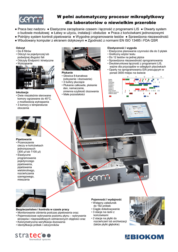 W pełni automatyczny procesor mikropłytkowy dla laboratoriów o niewielkim przerobie ● Praca bez nadzoru ● Elastyczne zarządzanie czasem i łączność z programami LIS ● Otwarty system o budowie modułowej ● Łatwy w użyciu, instalacji i obsłudze ● Praca z końcówkami jednorazowymi ● Potrójny system kontroli pipetowania ● Wygodne programowanie testów ● Sprawdzona niezawodność ● Wbudowany komputer z ekranem dotykowym ● Zgodność z normami EN ISO 13485 i FDA QSR Odczyt • Do 8 filtrów • Odczyt na pojedynczej lub podwójnej długości fali • Odczyty Endpoint i kinetyczne • Wytrząsanie Inkubacja • Dwie niezależnie sterowane komory ogrzewane do 45°C, z możliwością wytrząsania • 3 komory o temperaturze otoczenia Płukanie • Głowica 8-kanałowa (odsysanie i dozowanie) • 3 bufory płuczące • Płukanie całkowite, płukanie den, namaczanie, zmienna szybkość dozowania • Małe pozostałości Elastyczność i wygoda • Elastyczne planowanie czynności dla do 3 płytek • Graficzny edytor testu • Do 12 testów na jednej płytce • Sprawdzona niezawodność oprogramowania • Dwukierunkowa łączność z programami LIS, ważne dla przyrządów w odległych placówkach • Oparty na oprogramowaniu EIA pracującym w ponad 3000 miejsc na świecie Pipetowanie • Przenoszenie cieczy w końcówkach jednorazowych (300 μl lub 1100 μl) • Elastyczne programowanie pojedynczego pipetowania, pipetowania wielokrotnego, rozcieńczania szeregowego, mieszania Bezpieczeństwo i kontrola w czasie pracy • Monitorowanie ciśnienia podczas pipetowania oraz: • Pojemnościowe wykrywanie poziomu płynu – wykrywanie skrzepów i nieprawidłowych odmierzonych objętości oraz • Kolorymetryczna weryfikacja dozowania • Identyfikacja próbek i odczynników Pojemność I wydajność • Wstępny załadunek do 192 próbek • Ciągłe doładowywanie • 3 stacje na racki z końcówkami • 2 stacje na płytki do rozcieńczeń lub archiwizacji (także płytki głębokie) Podstawowe parametry techniczne Czytnik Zakres pomiarowy Zakres długości fal Ilość filtrów Szybkość odczytu Dokładność odczytu Powtarzalność odczytu Liniowość odczytu 0 – 3.000 OD 400 – 700 nm Standardowo 3 - maksymalnie 8 <15 sekund – odczyt na jednej długości fali <30 sekund – odczyt na dwóch długościach fali ±0.005 lub 2.5% (to co wyższe) 1% CV przy 1 OD ± 1% w zakresie 0 – 2.000 OD Pipetor Zakres objętości Powtarzalność (pipetowanie pojedyncze) Powtarzalność (pipetowanie wielokrotne) Cechy 10 - 300μl dla końcówki 300 μl 301 - 1000μl dla końcówki 1100 μl <3% przy 20 μl <3% przy 200 μl <10% dla 16x20 μl <3% dla 8x100 μl Monitorowanie ciśnienia pipetowania, pojemnościowe wykrywanie poziomu płynu, wykrywanie i rozpoznawanie końcówek, mieszanie, rozcieńczanie szeregowe, archiwizowanie próbek Pojemność Próbki i odczynniki Załadunek początkowy do 192 próbek Układ elastyczny – np. 144 próbki, 8 odczynników, 16 kontroli Inkubator Zakres temperatury Niejednorodność temperatury Wytrząsanie Dwie komory niezależnie ogrzewane do 45 °C trzy komory dla temperatury otoczenia ± 1.5 °C z monitorowaniem w czasie pracy 20 Hz Płuczka Powtarzalność Pozostałości Tryby pracy 10% CV przy 300 μl/dołek <2.5 μl/dołek dla płytek okrągłodennych <4 μl/dołek dla płytek płaskodennych Płukanie całkowite, płukanie den, namaczanie, różne szybkości dozowania Wymiary Szerokość Głębokość Wysokość 97 cm 66 cm 75 cm