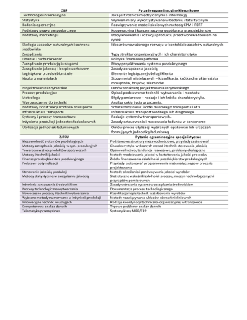 ZiIP Technologie informacyjne Statystyka Badania operacyjne Podstawy prawa gospodarczego Podstawy marketingu Ekologia zasobów naturalnych i ochrona środowiska Zarządzanie Finanse i rachunkowość Zarządzanie produkcją i usługami Zarządzanie jakością i bezpieczeństwem Logistyka w przedsiębiorstwie Nauka o materiałach Projektowanie inżynierskie Procesy produkcyjne Metrologia Wprowadzenie do techniki Podstawy konstrukcji środków transportu Infrastruktura transportu Systemy i procesy transportowe Inżynieria produkcji jednostek ładunkowych Utylizacja jednostek ładunkowych ZJPiU Niezawodność systemów produkcyjnych Metody zarządzania jakością w syst. produkcyjych Towaroznawstwo produktów spożywczych Metody i techniki jakości Finanse przedsiębiorstwa produkcyjnego Podstawy optymalizacji Sterowanie jakością produkcji Metody statystyczne w zarządzaniu jakością Inżynieria zarządzania środowiskiem Procesy technologiczne wytwarzania Nowoczesne procesy i techniki wytwarzania Wybrane metody numeryczne w inżynierii produkcji Innowacyjne techniki w usługach Komputerowa analiza danych Telematyka przemysłowa Pytanie egzaminacyjne kierunkowe Jaka jest różnica między danymi a informacją Wymień miary wykorzystywane w badaniu statystycznym Rozwiązywanie modeli sieciowych metodą CPM i PERT Kooperacyjna i koncentracyjna współpraca przedsiębiorstw Etapy kreowania i rozwoju produktu przed wprowadzeniem na rynek Idea zrównoważonego rozwoju w kontekście zasobów naturalnych Typy struktur organizacyjnych i ich charakterystyka Polityka finansowa państwa Etapy projektowania systemu produkcyjnego Zasady zarządzania jakością Elementy logistycznej obsługi klienta Stopy metali nieżelaznych – klasyfikacja, krótka charakterystyka mosiądzów, brązów, siluminów Omów strukturę projektowania inżynierskiego Opisać podstawowe techniki wytwarzania i montażu Błędy pomiarowe – rodzaje i ich krótka charakterystyka. Analiza cyklu życia urządzenia. Scharakteryzować środki masowego transportu ludzi. Infrastruktura transport wodnego lub drogowego Rodzaje systemów transportowych. Zasady sztauowania i mocowania ładunku w kontenerze Omów proces utylizacji wybranych opakowań lub urządzeń formujących jednostkę ładunkową. Pytanie egzaminacyjne specjalistyczne Podstawowe struktury niezawodnościowe, przykłady zastosowań Charakterystyka wybranych metod i technik sterowania jakością Opakowalnictwo, tendencje rozwojowe, problemy ekologiczne Metody modelowania jakości w kształtowaniu jakości procesów Źródła finansowania działalności przedsiębiorstw produkcyjnych Przykłady zastosowań programowania matematycznego w procesie projektowania Metody określania i porównywania jakości wyrobów Statystyczne wskaźniki zdolności procesu, maszyn technologicznych i przyrządów pomiarowych Zasady wdrażania systemów zarządzania środowiskiem Dokumentacja procesu technologicznego Klasyfikacja i opis technik kształtowania wyrobów Metody rozwiązywania układów równań nieliniowych Rodzaje koordynacji techniczno-organizacyjnej w transporcie Typowe problemy analizy danych Systemy klasy MRP/ERP