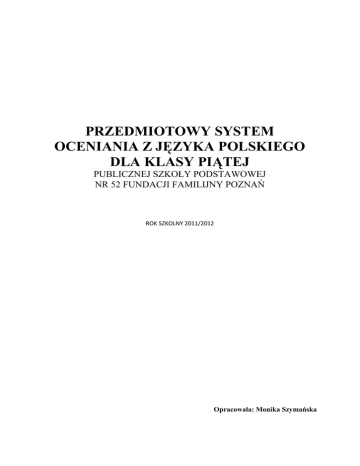 PRZEDMIOTOWY SYSTEM OCENIANIA Z JĘZYKA POLSKIEGO DLA KLASY PIĄTEJ PUBLICZNEJ SZKOŁY PODSTAWOWEJ NR 52 FUNDACJI FAMILIJNY POZNAŃ ROK SZKOLNY 2011/2012 Opracowała: Monika Szymańska 1. SZCZEGÓŁOWE KRYTERIA OCEN Ocena niedostateczna Ocenę niedostateczną otrzymuje uczeń, który nie spełnia wymagań kryterialnych na ocenę dopuszczającą. Ocena dopuszczająca MÓWIENIE: Ocenę dopuszczającą otrzymuje uczeń, który: § formułuje pytania i odpowiedzi odpowiednie do sytuacji komunikacyjnej, § potrafi samodzielnie połączyć kilka zdań w logiczna wypowiedź, § potrafi zastosować słownictwo wyrażające prośbę i polecenie, zaproszenie, przeprosiny, § potrafi opanować pamięciowo tekst poetycki, § zna najważniejsze zasady poprawności językowej, dzięki którym jego wypowiedzi są zrozumiałe dla odbiorcy. CZYTANIE: Ocenę dopuszczającą otrzymuje uczeń, który: § czyta teksty cicho i rozumie ich ogólny sens, § czyta teksty głośno i z pomocą nauczyciela stara się poprawnie akcentować oraz artykułować wyrazy, § zna zasady intonacji zdaniowej, § zna podstawowe pojęcia związane ze światem przedstawionym utworu, § odczytuje dane z różnych środków przekazu informacji. SŁUCHANIE: Ocenę dopuszczającą otrzymuje uczeń, który: § słucha i rozumie sens poleceń oraz prostych instrukcji, § w słuchanym tekście wyodrębnia istotę treści, § potrafi sformułować pytania zamknięte do najważniejszych treści słyszanej wypowiedzi, § rozumie intencję nadawcy wypowiedzi. PISANIE: Ocenę dopuszczającą otrzymuje uczeń, który: § buduje proste wypowiedzenia na określony temat, § redaguje podstawowe formy wypowiedzi, § zna podstawowe cechy tekstów użytkowych, § w najprostszej formie zapisuje informacje wybrane z tekstu, § tworzy ramowy plan, a z pomocą nauczyciela dopisuje wydarzenia szczegółowe, § zna podstawowe zasady ortografii i interpunkcji, § stosuje zasady estetycznego zapisu, § zna podstawowe zasady organizacji i kompozycji wypowiedzi pisemnej. NAUKA O JĘZYKU: Ocenę dopuszczającą otrzymuje uczeń, który: § stosuje wiedzę językową w zakresie: - słownictwa (dobiera wyrazy bliskoznaczne i przeciwstawne, zna wybrane związki frazeologiczne, - składni ( z pomocą nauczyciela rozpoznaje rodzaje wypowiedzenia), - fleksji (z pomocą nauczyciela rozpoznaje formę i funkcję odmiennych i nieodmiennych części mowy), - fonetyki (zna alfabet, dzieli wyrazy na litery i głoski, sylaby). KORZYSTANIE ZE ŹRÓDEŁ INFORMACJI: Ocenę dopuszczającą otrzymuje uczeń, który: § z pomocą nauczyciela korzysta ze słowników i encyklopedii. Ocena dostateczna MÓWIENIE: Ocenę dostateczną otrzymuje uczeń, który: § uczestniczy w sytuacji komunikacyjnej, § angażuje się w rozmowę na określony temat, § buduje kilkuzdaniowe wypowiedzi ustne, § opowiada, streszcza, opisuje, używając odpowiednio dobranego słownictwa, § buduje wypowiedzi o charakterze prośby, polecenia, § używa odpowiedniego słownictwa, § wygłasza z pamięci teksty prozatorskie lub poetyckie, § pracuje nad poprawnością językową wypowiedzi. CZYTANIE: Ocenę dostateczną otrzymuje uczeń, który: § rozumie ogólny sens tekstów czytanych cicho, zauważa ich sens metaforyczny (z pomocą nauczyciela), § płynnie czyta teksty głośno, poprawnie artykułuje i akcentuje wyrazy, § stosuje zasady intonacji zdaniowej, § rozróżnia teksty artystyczne i użytkowe, prozatorskie i poetyckie, § zna podstawowe pojęcia związane ze światem przedstawionym utworu fabularnego oraz ze stylistyką i rytmizacją tekstu poetyckiego, § wyszukuje i rozpoznaje informacje z instrukcji, zaproszenia, schematu, notatki, artykułu, wykresu. SŁUCHANIE: Ocenę dostateczną otrzymuje uczeń, który: § potrafi sformułować pytania zamknięte do najważniejszych treści słyszanej wypowiedzi, § potrafi zrekonstruować sens słyszanych wypowiedzi, § wykorzystuje usłyszane informacje w samodzielnym tekście. PISANIE: Ocenę dostateczną otrzymuje uczeń, który: § redaguje formy literackie i użytkowe, § streszcza teksty fabularne, § zapisuje informacje w formie tabeli, na schemacie, wykresie, § zna i stosuje zasady ortografii i interpunkcji, § stosuje zasady estetycznego zapisu, organizacji i kompozycji wypowiedzi pisemnej. NAUKA O JĘZYKU: Ocenę dostateczną otrzymuje uczeń, który: § stosuje wiedzę językową w zakresie: - słownictwa (dopisuje wyrazy bliskoznaczne i przeciwstawne, wyjaśnia wybrane związki frazeologiczne), - składni (rozpoznaje rodzaje wypowiedzenia, rysuje wykres graficzny zdania pojedynczego, zna zasady interpunkcji zdania pojedynczego i wypowiedzenia złożonego), - fleksji (zna odmienne i nieodmienne części mowy), - fonetyki (posługuje się alfabetem, dzieli wyrazy na litery i głoski, sylaby, zna sposoby oznaczania miękkości głosek, uwzględnia różnice w wymowie i pisowni nosówek). KORZYSTANIE ZE ŹRÓDEŁ INFORMACJI: Ocenę dostateczną otrzymuje uczeń, który: § korzysta ze słowników i encyklopedii. Ocena dobra MÓWIENIE: Ocenę dobrą otrzymuje uczeń, który: § podtrzymuje sytuację komunikacyjną, § aktywnie uczestniczy w dyskusji na określony temat, § argumentuje odwołując się do doświadczeń lub tekstu, § wypowiada się używając odpowiednio dobranego słownictwa, § posługuje się komunikatami różnego typu, § wygłasza z pamięci teksty literackie, § stosuje się do norm językowych. CZYTANIE: Ocenę dobrą otrzymuje uczeń, który: § rozumie na poziomie semantycznym sens tekstów czytanych cicho, zauważa ich sens metaforyczny, § płynnie czyta teksty głośno, § rozróżnia teksty artystyczne i użytkowe, prozatorskie i poetyckie, wskazuje ich cechy charakterystyczne, § rozpoznaje i omawia elementy świata przedstawionego w utworze, § wyszukuje i wykorzystuje informacje z instrukcji, zaproszenia, schematu, notatki, artykułu, wykresu. SŁUCHANIE: Ocenę dobrą otrzymuje uczeń, który: § słuchaj