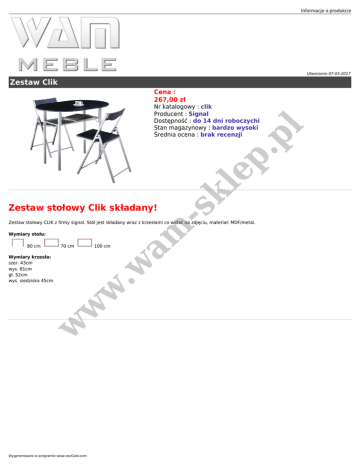 Informacje o produkcie Utworzono 07-03-2017 Zestaw Clik Cena : 267,00 zł Zestaw stołowy Clik składany! -s k le p. pl Nr katalogowy : clik Producent : Signal Dostępność : do 14 dni roboczychi Stan magazynowy : bardzo wysoki Średnia ocena : brak recenzji Wymiary stołu: 80 cm 70 cm 100 cm w w w .w Wymiary krzesła: szer. 43cm wys. 81cm gł. 52cm wys. siedziska 45cm am Zestaw stołowy CLIK z firmy signal. Stół jest składany wraz z krzesłami co widać na zdjęciu, materiał: MDF/metal. Wygenerowano w programie www.oscGold.com