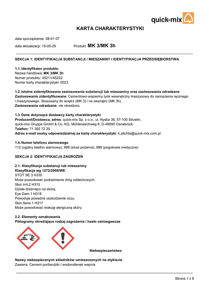 KARTA CHARAKTERYSTYKI Produkt: MK 3/MK 3h - quick-mix