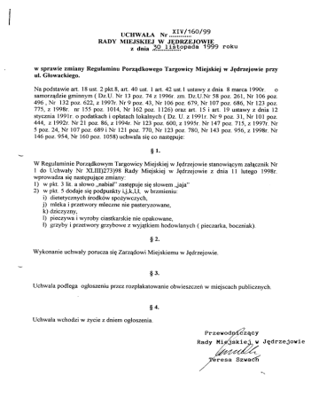 ucHwALA N. ..*Y/.1.6o/ee RADY MMJSKIEJ W JEDRZEJOWIE z dnia á9...L.i.i.Ippada 1999 roku w sprawiezmiany RegulaminuPorz4dkowegoTargowicyMiejskiej w Jpdrzejowiepruy ul. Glowackiego. Napodstawieart. 18ust.2pkt.8,arl.40ust.I art. 42ust.lustawyzdnia 8 marca1990r. o gminnym( Dz.U.Nr 13 poz.74z 1996r.zm.Dz.U.Nr58 poz.261,Nr 106poz. samorzqdzie 496 , Nr 132poz.622,z 1997r.Nr 9 poz.43,Nr 106po2.679,Nr lO7 poz.686,Nr 123 poz. 775,z 1998r. nr 155poz. 1014,Nr 162poz. 7126)orazart. 15 i art. 19 ustawyz dnia12 stycznia1991r.o podatkach i oplatachlokalnych( Dz. U. zl99lr. Nr 9 poz.31,Nr l0l poz. 4 4 4 ,z l 9 9 2 r.N r2 l p o 2 .8 6 ,2 1 9 9 4Nr r . 123po2.600, zT995rNr . 147poz.7L5, z 1997rNr . 5 poz.24,Nr 107poz.689i Nr l2l po2.770,Nr 123po2.780,Nr 143poz.956,z 1998r.Nr 146po2.954,Nr 160poz.1058)uchwalasigco nastgpuje: s1. W Regulaminie Porzqdkowym Targowicy Miejskiej w Jgdrzejowie stanowi4cym zal4cznik Nr 1 do Uchwaty Nr X-IIL)273)98 Rady Miejskiej w Jgdrzejowie z dnia 11 lutego 1998r. wprowadza sig nastppuj4cezmiany: l) w pl<t.3 lit. a slowo,,nabial"zastgpujesig slowem,jaja" 2) w pkt 5 dodajesig podpunktyij,k,l,l, w brzmieniu: i) dietetycznych Srodków spoZywczych, j) mleka i przetwory mlecznenie pasteryzowane, k) dziczyzny, l) pieczywai wyroby ciastkarskienie opakowane, l) grzyby i przetwory grzybowe z wyj4tkiem hodowlanych ( pieczarka,boczniak). s2. Wykonanie uchwalyporucza s\gZarzqdowi Miejskiemu w Jgdrzejowie. $3. Uchwalapodlega ogloszeniuprzezrozplakatowanieobwieszczeúw miejscachpublicznych. s4. Uchwalawchodzi w Zyciez dniem ogloszenia. Przewod Rady Mi zEcy v Jgdrzejovie 2 sa SzwaCh Zal4cznik Nr I v u;ü;;"n x. ..::Y..(.:.92!.2.e Radv Mieiskiei w Jedneiowie g r oku p.?.9 g..lL.?.? z ¡ i¡ a.?9.-.l.i.:.!.-". RegulaminPorzqdkowy TargowicyMiejskiej w Jgdrzejowie 1 . Targowicajest wlasnoSciqGminy w Jgdrzejowie. ) Cala targowica podzielonazostalana 4 sekfory. 3 . Handel winien odbywaósig w miejscachdo tego wyznaczonych tj. asortymentdanego towaru w odpowiednich sekforachi tak: a) sektornr I - handelkoszykowy izwózkow (ja:a, drób, nasiona,art. spozywcze), b) sektor w 2 - handel odziel4 obuwiem, galanteria, c) sektornr 3 - handelsprzQtem RTV, krawiectwo,war4twa,owoce,migso, d) sektornr 4 - handelart. przemystowymi,spo2ywczymi, meblami. 4. Zabrania sip: a) prowadzenianatargowicy sprzedu2y towaróww drodzepublicznychlosowaúlub przetargówz wyj4tkiemlosówloterii ksiq¿kowych, b) naje2díania,parkowania,zatrzymywania pojazdówmechanicznych oraz przyczep na kostcePOLBRUK. c) w sekforzeI i 2 parkowaniaorazhandluz pojazdówmechanicznych i przyczep, d)w sektorze 3 i 4 parkowania pojazdów mechanicznychoraz przyczep nie przeznaczo nych do prowadzenia dzialalnoéci handIowej, e) spozywania napojówalkoholowych, handlu art. spozywczo-przemyslowymi przy stoiskachmipsnych. 0 5. Na targowicymogebyó sprzedawane wszystkietowaryz wyjqtkiem: a) napojówalkoholowych, b) nafty, benzyny,spirytusu( denaturatu)skazonego, trucizn,SrodkówIeczniczych, érodkówochronyroÉlin kamieni i metali szlachetnychorazwykonanychz nich przedmiotów, zagranicznychbanknotów i monet, papierówwartoéciowych, broni, amunicji, materialów oraz artykulów pirotechnicznychi wybuchowych, przedmiotów ekwipunku wojskowego, innych artykulów, których sprzedaz jest zabroniona na podstawie odrgbnych przepisów, i) dietetycznychÉrodkówspoZywczych, j) mleka i przetwory mlecznenie pasteryzowane, k) dziczyzny, l) pieczywa i wyroby ciastkarskienie opakowane, c) d) e) 0 g) h) l) grzybyi przetworygrzybowez wyjqtkiemhodowlanych( pieczarka,boczniak). regulaminu do przestrzegania 6. Osobyprowadz4cehandelna targowiskus4 zobowiapane przeciwpozarowych. targowiskaoraz pr zepisów 7. Miejsce sprzedaíyWznaczakierowniktargowiska,bqdáosobaprzezniegoupowaZniona. Osoby frzycznei prawne dokonuj4cesprzedaZy na targowiskachmogq dokonywaó targowicytj. 1,2,3,4. rezerwacjimiejsc wykonywaniahandluwe wszystkichsektorach Rezerwacjamoze byó dokonana na okres od I m-ca do kwartatu za pobraniem dodatkowejoplaty w wysokoéci20,00 A za miesiqcuiszczonejdo r4k inkasenta za otrzymaniemdowoduwplaty. Rezerwacji nale|y dokonywaów 2 pierwsze dni targowe miesi4ca,badÉ kwartatu. brak rezerwacji przez Rezerwacjaobowi4¿ujedo godziny 7.w Nieusprawiedliwiony miejsca. 1 miesiqcpowodujeutratpzajmowanego nie mozebyó: 8. Miejscesprzedu2y a) :u4lznaczonena jezdniach, chodnikach, przejSciach pfzeznaczonych do ruchu lub w sposóbhamujqcy ruch, b) odstgpowanepÍzezosobg,hórej miejsceto wyznaczono. 9. Winni naruszeniapostgpowaóregulaminu porzqdkowegotargowicy podlegaj4 karze grrywny w wysokoéciod 5,00 zl do 500,00zl wymierzonejw trybie i na zasadach okreólonychw prawie o wykroczeniach.