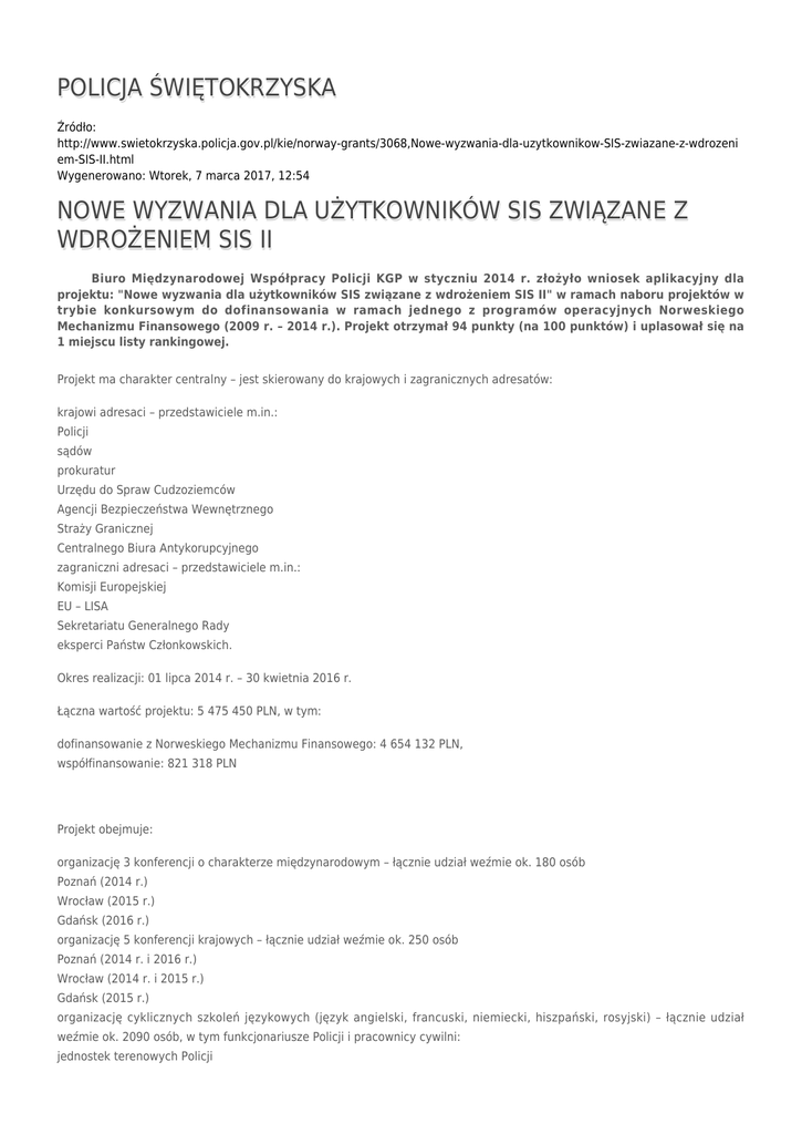 POLICJA ŚWIĘTOKRZYSKA Źródło: http://www.swietokrzyska.policja.gov.pl/kie/norway-grants/3068,Nowe-wyzwania-dla-uzytkownikow-SIS-zwiazane-z-wdrozeni em-SIS-II.html Wygenerowano: Wtorek, 7 marca 2017, 12:54 NOWE WYZWANIA DLA UŻYTKOWNIKÓW SIS ZWIĄZANE Z WDROŻENIEM SIS II Biuro Międzynarodowej Współpracy Policji KGP w styczniu 2014 r. złożyło wniosek aplikacyjny dla projektu: "Nowe wyzwania dla użytkowników SIS związane z wdrożeniem SIS II" w ramach naboru projektów w trybie konkursowym do dofinansowania w ramach jednego z programów operacyjnych Norweskiego Mechanizmu Finansowego (2009 r. – 2014 r.). Projekt otrzymał 94 punkty (na 100 punktów) i uplasował się na 1 miejscu listy rankingowej. Projekt ma charakter centralny – jest skierowany do krajowych i zagranicznych adresatów: krajowi adresaci – przedstawiciele m.in.: Policji sądów prokuratur Urzędu do Spraw Cudzoziemców Agencji Bezpieczeństwa Wewnętrznego Straży Granicznej Centralnego Biura Antykorupcyjnego zagraniczni adresaci – przedstawiciele m.in.: Komisji Europejskiej EU – LISA Sekretariatu Generalnego Rady eksperci Państw Członkowskich. Okres realizacji: 01 lipca 2014 r. – 30 kwietnia 2016 r. Łączna wartość projektu: 5 475 450 PLN, w tym: dofinansowanie z Norweskiego Mechanizmu Finansowego: 4 654 132 PLN, współfinansowanie: 821 318 PLN Projekt obejmuje: organizację 3 konferencji o charakterze międzynarodowym – łącznie udział weźmie ok. 180 osób Poznań (2014 r.) Wrocław (2015 r.) Gdańsk (2016 r.) organizację 5 konferencji krajowych – łącznie udział weźmie ok. 250 osób Poznań (2014 r. i 2016 r.) Wrocław (2014 r. i 2015 r.) Gdańsk (2015 r.) organizację cyklicznych szkoleń językowych (język angielski, francuski, niemiecki, hiszpański, rosyjski) – łącznie udział weźmie ok. 2090 osób, w tym funkcjonariusze Policji i pracownicy cywilni: jednostek terenowych Policji polskiego Biura SIRENE polskiego N-SIS organizację cyklicznych szkoleń specjalistycznych i warsztatów (pomoc prawna w sprawach karnych, praktyczne aspekty pracy z SIS II, ochrona danych osobowych, badania daktyloskopijne i biologiczne - łącznie udział weźmie ponad 2000 osób, w tym funkcjonariusze Policji i pracownicy cywilni: jednostek terenowych Policji polskiego Biura SIRENE Projekt przyczyni się do: wymiany wiedzy i doświadczeń w zakresie SIS II na poziomie europejskim i krajowym rozwoju umiejętności językowych i wiedzy specjalistycznej z zakresu SIS II funkcjonariuszy i pracowników Policji wzrostu poziomu świadomości obywateli Polski w zakresie przysługujących im praw związanych z funkcjonowaniem SIS II Fundusze norweskie: Poprzez fundusze norweskie Norwegia przyczynia się do zmniejszenia nierówności społecznych i ekonomicznych oraz wzmocnienia relacji dwustronnych z państwami beneficjentami w Europie. Norwegia blisko współpracuje z UE na podstawie Porozumienia o Europejskim Obszarze Gospodarczym (Porozumienie EOG). W okresie 2009-2014 wsparcie udzielone przez Norwegię wynosi 1,7 miliarda euro. Środki te są dostępne dla organizacji pozarządowych, instytucji badawczych i akademickich oraz sektora publicznego i prywatnego w 12 nowoprzyjętych państwach członkowskich UE oraz Grecji, Portugalii i Hiszpanii. Dzięki nim ma miejsce szeroka współpraca z podmiotami z Norwegii, a przedsięwzięcia mogą być wdrażane do 2016 r. Więcej na stronie: www.eog.gov.pl www.norwaygrants.org Ocena: 5/5 (1) Tweetnij