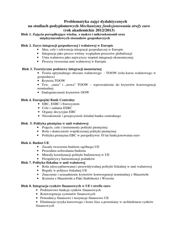 Problematyka zajęć dydaktycznych na studiach podyplomowych Mechanizmy funkcjonowania strefy euro (rok akademickie 2012/2013) Blok 1. Zajęcia porządkujące wiedzę z makro i mikroekonomii oraz międzynarodowych stosunków gospodarczych Blok 2. Zarys integracji gospodarczej i walutowej w Europie • Idea, cele i sekwencja integracji gospodarczej w Europie • Integracja jako proces wtórny względem procesów globalizacji • Unia walutowa jako najwyższy stopień integracji ekonomicznej • Procesy tworzenia unii walutowej w Europie Blok 3. Teoretyczne podstawy integracji monetarnej • Teoria optymalnego obszaru walutowego - TOOW (rola kursu walutowego w gospodarce) • Kryteria TOOW • Tzw. „stara” i „nowa” TOOW – wprowadzenie do kryteriów konwergencji nominalnej • Endogeniczność kryteriów OOW Blok 4. Europejski Bank Centralny • EBC, ESBC i Eurosystem • Cele i zadania ESBC • Organy decyzyjne EBC • Niezależność i przejrzystość działań banku centralnego Blok 5. Polityka pieniężna w unii walutowej • Pojęcie, cele i instrumenty polityki pieniężnej • Rola i skuteczność współczesnej polityki pieniężnej • Polityka pieniężna EBC w perspektywie 10 lat funkcjonowania euro Blok 6. Budżet UE • Zasady tworzenia budżetu ogólnego UE • Procedura uchwalania budżetu • Metody koordynacji polityki budżetowej w UE • Perspektywy harmonizacji podatków Blok 7. Polityka fiskalna w unii walutowej • Rola zdyscyplinowanej i przewidywalnej polityki fiskalnej w unii walutowej • Reguły w polityce fiskalnej UE • Znaczenie i uzasadnienie kryteriów konwergencji nominalnej z Maastricht • Kryteria z Maastricht a Pakt Stabilności i Wzrostu Blok 8. Integracja rynków finansowych w UE i strefie euro • Podstawowe funkcje rynków finansowych • Konwergencja systemów finansowych • Pośrednicy finansowi i instytucje finansowe UE • Eliminacja ryzyka kursowego i home bias a przemiany w architekturze rynków finansowych Blok 9. Euro w roli waluty międzynarodowej • Warunki konieczne dla kreacji pieniądza międzynarodowego • Funkcje pieniądza międzynarodowego • Korzyści i ryzyka wynikające z posiadania waluty międzynarodowej • Architektura międzynarodowego systemu finansowego a przyszłość unii walutowych Blok 10. Korzyści i szanse wynikające z uczestnictwa w unii walutowej na gruncie teorii i doświadczeń strefy euro • Korzyści krótko i średniookresowe • Integracja rynków finansowych, wzrost handlu i inwestycji • Czynniki determinujące skalę korzyści i kosztów oraz szans i zagrożeń Blok 11. Koszty i zagrożenia wynikające z uczestnictwa w unii walutowej na gruncie teorii i doświadczeń strefy euro • Porzucenie polityki pieniężnej • Ryzyko boomu i przegrzania gospodarki • Koszty dostosowań krótkookresowych (wymiana pieniądza, logistyki, efekty cenowe, etc.) Blok 12. Specyfika polskiej gospodarki a zdolność do czerpania korzyści i ekspozycji na koszty • Cechy strukturalne polskiej gospodarki • Postęp w zakresie konwergencji nominalnej • Dysparytet w zakresie konwergencji realnej • Czynniki determinujące wybór scenariusza integracji • Zaburzenia w międzynarodowym systemie finansowym a przystąpienia do strefy euro Blok 13. Perspektywy integracji walutowej w Europie • Kryzys finansowy a funkcjonowanie strefy euro • Zdolność nowych krajów członkowskich do integracji walutowej • Przypadki Danii, Szwecji i Wielkiej Brytanii • Dylematy okresu przedakcesyjnego (optymalna policy mix, wymogi proceduralne, konieczność przejścia przez ERM II, etc. ).