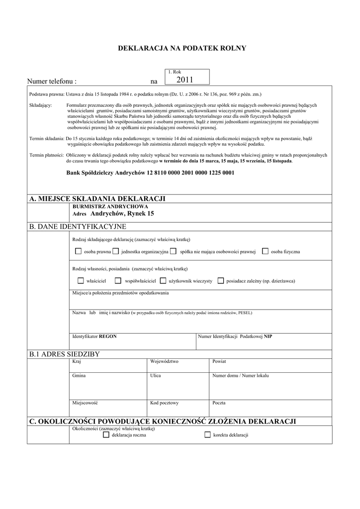 DEKLARACJA NA PODATEK ROLNY 1. Rok Numer telefonu : na 2011 Podstawa prawna: Ustawa z dnia 15 listopada 1984 r. o podatku rolnym (Dz. U. z 2006 r. Nr 136, poz. 969 z późn. zm.) Składający: Formularz przeznaczony dla osób prawnych, jednostek organizacyjnych oraz spółek nie mających osobowości prawnej będących właścicielami gruntów, posiadaczami samoistnymi gruntów, uŜytkownikami wieczystymi gruntów, posiadaczami gruntów stanowiących własność Skarbu Państwa lub jednostki samorządu terytorialnego oraz dla osób fizycznych będących współwłaścicielami lub współposiadaczami z osobami prawnymi, bądź z innymi jednostkami organizacyjnymi nie posiadającymi osobowości prawnej lub ze spółkami nie posiadającymi osobowości prawnej. Termin składania: Do 15 stycznia kaŜdego roku podatkowego; w terminie 14 dni od zaistnienia okoliczności mających wpływ na powstanie, bądź wygaśnięcie obowiązku podatkowego lub zaistnienia zdarzeń mających wpływ na wysokość podatku. Termin płatności: Obliczony w deklaracji podatek rolny naleŜy wpłacać bez wezwania na rachunek budŜetu właściwej gminy w ratach proporcjonalnych do czasu trwania tego obowiązku podatkowego w terminie do dnia 15 marca, 15 maja, 15 września, 15 listopada. Bank Spółdzielczy Andrychów 12 8110 0000 2001 0000 1225 0001 A. MIEJSCE SKŁADANIA DEKLARACJI BURMISTRZ ANDRYCHOWA Adres Andrychów, Rynek 15 B. DANE IDENTYFIKACYJNE Rodzaj składającego deklarację (zaznaczyć właściwą kratkę) osoba prawna jednostka organizacyjna spółka nie mająca osobowości prawnej osoba fizyczna Rodzaj własności, posiadania (zaznaczyć właściwą kratkę) właściciel współwłaściciel uŜytkownik wieczysty posiadacz zaleŜny (np. dzierŜawca) Miejsce/a połoŜenia przedmiotów opodatkowania Nazwa lub imię i nazwisko (w przypadku osób fizycznych naleŜy podać imiona rodziców, PESEL) Identyfikator REGON Numer Identyfikacji Podatkowej NIP B.1 ADRES SIEDZIBY Kraj Województwo Powiat Gmina Ulica Numer domu / Numer lokalu Miejscowość Kod pocztowy Poczta C. OKOLICZNOŚCI POWODUJĄCE KONIECZNOŚĆ ZŁOśENIA DEKLARACJI Okoliczności (zaznaczyć właściwą kratkę) deklaracja roczna korekta deklaracji Nie podlegające przeliczeniu na ha przeliczeniowe 1. 2. 3. D1 Grunty orne niezabudowane I 1,65 II 1,50 IIIa 1,40 IIIb 1,15 IVa 0,90 IVb 0,65 Podlegające przeliczeniu na hektary przeliczeniowe 4. Przelicznik (dla gruntów powyŜej 1ha fiz.) Klasy uŜytków wynikające z ewidencji gruntów i budynków 5. V 0,25 VI 0,10 VIz 0,10 D1.1 Razem D2 Grunty orne zabudowane I 1,65 D2.1 D3 Liczba hektarów przeliczeniowych (rubryka 4 x rubryka 5) 6. Stawka z 1 ha fizycznego w zł./gr Powierzchnia gruntu w hektarach fizycznych Uwaga! Wykazujemy z dokładnością do 1 m2 Stawka z 1 ha przeliczeniowego w zł./gr. D. Wyliczenie podatku rolnego ogółem 7. 8. 94,10 94,10 94,10 94,10 94,10 94,10 94,10 94,10 94,10 IVa 0,90 IVb 0,65 V 0,25 VI 0,10 94,10 94,10 94,10 94,10 94,10 94,10 94,10 94,10 VIz 0,10 94,10 Grunty zadrzewione i zakrzewione połoŜone na gruntach ornych I 1,65 II 1,50 IIIa 1,40 IIIb 1,15 IVa 0,90 IVb 0,65 II 1,50 IIIa 1,40 IIIb 1,15 Razem V 0,25 VI 0,10 VIz 0,10 94,10 94,10 94,10 94,10 94,10 94,10 94,10 94,10 94,10 1,65 94,10 D3.1 Razem D4 Sady na gruntach ornych I Kwota podatku rolnego w zł./gr. (rubryka 3 x rubryka 8 lub rubryka 6 x rubryka 7) 9. II 1,50 IIIa 1,40 IIIb 1,15 IVa 0,90 IVb 0,65 V 0,25 VI 0,10 VIz 0,10 D4.1 Razem D5 Sady na uŜytkach zielonych I 1,45 II 1,25 III 1,40 IV 0,90 V 0,15 VI 0,10 VIz 0,10 D5.1 Razem D6 UŜytki zielone D6.1 D7 D7.1 D8 D8.1 I 1,45 II 1,25 III 1,05 IV 0,60 V 0,15 VI 0,10 VIz 0,10 94,10 94,10 94,10 94,10 94,10 94,10 94,10 94,10 94,10 94,10 94,10 94,10 94,10 94,10 94,10 94,10 94,10 94,10 94,10 94,10 94,10 94,10 Razem Grunty zabudowane na uŜytkach zielonych I 1,45 II 1,25 III 1,05 IV 0,60 V 0,15 VI 0,10 94,10 94,10 94,10 94,10 94,10 94,10 VIz 0,10 94,10 Grunty zadrzewione i zakrzewione na uŜ. zielonych I 1,45 II 1,25 Razem III 1,05 IV 0,60 V 0,15 VI 0,10 94,10 94,10 94,10 94,10 94,10 94,10 VIz 0,10 94,10 Razem D9 Grunty pod stawami a) zarybione łososiem, trocią, głowacicą, palią i pstrągiem b) zarybione innymi gatunkami ryb niŜ w poz. a) c) grunty pod stawami niezarybionymi D9.1 Razem D10 Rowy ------------ ------------ ------------ ------------ E. Ogółem ( z pozycji razem „ D1.1 + D2.1 + D3.1 + D4.1 + D5.1 + D6.1 + D7.1 + D8.1 + D9.1 + D10” ) Nie podlegające przeliczeniu na ha przeliczeniowe 2. 3. Podlegające przeliczeniu na hektary przeliczeniowe 4. 5. Liczba hektarów przeliczeniowych (rubryka 4 x rubryka 5) 6. Stawka z 1 ha fizycznego w zł./gr Klasy uŜytków wynikające z ewidencji gruntów i budynków Stawka z 1 ha przeliczeniowego w zł./gr. 1. Powierzchnia gruntu w hektarach fizycznych Wykazujemy z dokładnością do 1 m2 Przelicznik (dla gruntów powyŜej 1ha fiz.) Pozycja zwolnienia z ustawy lub uchwały F. DANE DOTYCZĄCE PRZEDMIOTÓW ZWOLNIONYCH 7. 8. 94,10 94,10 94,10 94,10 94,10 94,10 94,10 94,10 94,10 Łączna kwota zwolnienia Kwota podatku rolnego w zł./gr. (rubryka 3 x rubryka 8 lub rubryka 6 x rubryka 7) 9. Przelicznik (dla gruntów powyŜej 1ha fiz.) Liczba hektarów przeliczeniowych (rubryka 4 x rubryka 5) Stawka z 1 ha przeliczeniowego w zł./gr. Stawka z 1 ha fizycznego w zł./gr Kwota podatku rolnego w zł./gr. (rubryka 3 x rubryka 8 lub rubryka 6 x rubryka 7) % ulgi kwota ulgi w zł/gr. (rubryka 9. x rubryka 10.) 2. Podlegające przeliczeniu na hektary przeliczeniowe Klasy uŜytków wynikające z ewidencji gruntów i budynków 1. Powierzchnia gruntu w hektarach fizycznych Wykazujemy z dokładnością do 1 m2 Nie podlegające przeliczeniu na ha przeliczeniowe Pozycja ulg z ustawy G. Ulgi w podatku rolnym 3. 4. 5. 6. 7. 8. 9. 10. 11. 94,10 94,10 94,10 94,10 94,10 Ulga inwestycyjna 94,10 _______ _______ _______ _______ _______ _______ _______ _______ _______ Łączna kwota ulg H. Łączna kwota podatku (róŜnica kwot z „E -