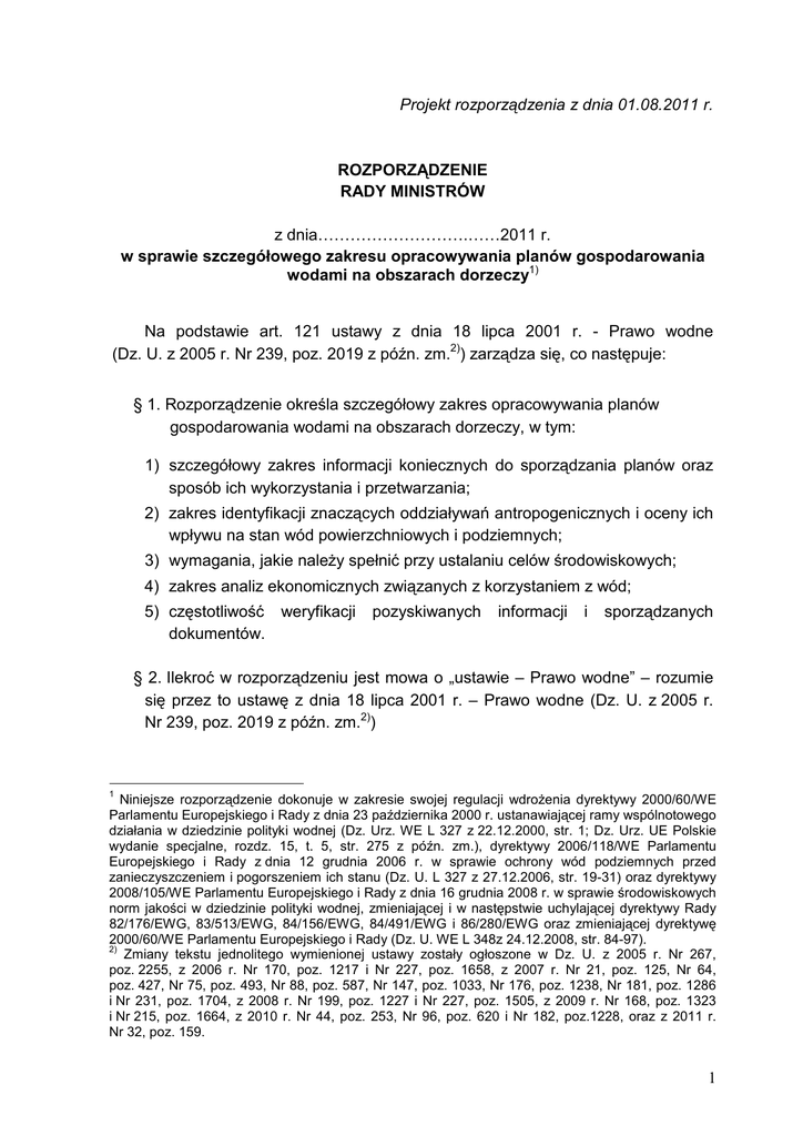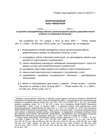Projekt rozporządzenia z dnia 01.08.2011 r. ROZPORZĄDZENIE RADY MINISTRÓW z dnia……………………….……2011 r. w sprawie szczegółowego zakresu opracowywania planów gospodarowania wodami na obszarach dorzeczy1) Na podstawie art. 121 ustawy z dnia 18 lipca 2001 r. - Prawo wodne (Dz. U. z 2005 r. Nr 239, poz. 2019 z późn. zm.2)) zarządza się, co następuje: § 1. Rozporządzenie określa szczegółowy zakres opracowywania planów gospodarowania wodami na obszarach dorzeczy, w tym: 1) szczegółowy zakres informacji koniecznych do sporządzania planów oraz sposób ich wykorzystania i przetwarzania; 2) zakres identyfikacji znaczących oddziaływań antropogenicznych i oceny ich wpływu na stan wód powierzchniowych i podziemnych; 3) wymagania, jakie należy spełnić przy ustalaniu celów środowiskowych; 4) zakres analiz ekonomicznych związanych z korzystaniem z wód; 5) częstotliwość weryfikacji dokumentów. pozyskiwanych informacji i sporządzanych § 2. Ilekroć w rozporządzeniu jest mowa o „ustawie – Prawo wodne” – rozumie się przez to ustawę z dnia 18 lipca 2001 r. – Prawo wodne (Dz. U. z 2005 r. Nr 239, poz. 2019 z późn. zm.2)) 1 Niniejsze rozporządzenie dokonuje w zakresie swojej regulacji wdrożenia dyrektywy 2000/60/WE Parlamentu Europejskiego i Rady z dnia 23 października 2000 r. ustanawiającej ramy wspólnotowego działania w dziedzinie polityki wodnej (Dz. Urz. WE L 327 z 22.12.2000, str. 1; Dz. Urz. UE Polskie wydanie specjalne, rozdz. 15, t. 5, str. 275 z późn. zm.), dyrektywy 2006/118/WE Parlamentu Europejskiego i Rady z dnia 12 grudnia 2006 r. w sprawie ochrony wód podziemnych przed zanieczyszczeniem i pogorszeniem ich stanu (Dz. U. L 327 z 27.12.2006, str. 19-31) oraz dyrektywy 2008/105/WE Parlamentu Europejskiego i Rady z dnia 16 grudnia 2008 r. w sprawie środowiskowych norm jakości w dziedzinie polityki wodnej, zmieniającej i w następstwie uchylającej dyrektywy Rady 82/176/EWG, 83/513/EWG, 84/156/EWG, 84/491/EWG i 86/280/EWG oraz zmieniającej dyrektywę 2000/60/WE Parlamentu Europejskiego i Rady (Dz. U. WE L 348z 24.12.2008, str. 84-97). 2) Zmiany tekstu jednolitego wymienionej ustawy zostały ogłoszone w Dz. U. z 2005 r. Nr 267, poz. 2255, z 2006 r. Nr 170, poz. 1217 i Nr 227, poz. 1658, z 2007 r. Nr 21, poz. 125, Nr 64, poz. 427, Nr 75, poz. 493, Nr 88, poz. 587, Nr 147, poz. 1033, Nr 176, poz. 1238, Nr 181, poz. 1286 i Nr 231, poz. 1704, z 2008 r. Nr 199, poz. 1227 i Nr 227, poz. 1505, z 2009 r. Nr 168, poz. 1323 i Nr 215, poz. 1664, z 2010 r. Nr 44, poz. 253, Nr 96, poz. 620 i Nr 182, poz.1228, oraz z 2011 r. Nr 32, poz. 159. 1 § 3. 1. Szczegółowy zakres informacji koniecznych do sporządzania planów gospodarowania wodami obejmuje: 1) ogólny opis charakterystyki obszaru dorzecza, w tym: a) dla wód powierzchniowych: – graficzne przedstawienie położenia i granic jednolitych części wód powierzchniowych zwanych dalej „JCWP”, – graficzne przedstawienie ekoregionów i typów JCWP, – określenie warunków referencyjnych dla typów JCWP, b) dla wód podziemnych – graficzne przedstawienie położenia i granic jednolitych części wód podziemnych, zwanych dalej „JCWPd”; 2) wykazy jednolitych części wód sporządzone na podstawie art. 113 ust. 2 pkt 1 ustawy – Prawo wodne; 3) szczegółowe uzasadnienie wyznaczenia JCWP jako sztucznych lub silnie zmienionych; 4) wykazy obszarów chronionych, o których mowa w art. 113 ust. 4 ustawy – Prawo wodne, wraz ze wskazaniem podstaw prawnych ich utworzenia i graficznym przedstawieniem przebiegu ich granic; 5) mapę sieci monitoringu ustalonego do celów oceny stanu wód; 6) wyniki państwowego monitoringu środowiska wraz z przedstawieniem ich w formie mapy dla określenia: a) stan ekologicznego i chemicznego wód powierzchniowych, b) stanu chemicznego i ilościowego wód podziemnych, c) stanu wód powierzchniowych w obszarach chronionych, o których mowa w pkt 4; 7) informacje o ustalonych wartościach progowych dla dobrego stanu chemicznego JCWPd i ich zmianach, wraz z podsumowaniem informacji określonych w załączniku do rozporządzenia; 8) informacje w jaki sposób w ocenie stanu chemicznego JCWPd uwzględniono przekroczenia norm jakości lub wartości progowych w poszczególnych punktach pomiarowych; 9) informacje związane z prezentowaniem szacunkowego poziomu ufności i dokładności wyników programów monitoringu, przy czym w przypadku wód powierzchniowych jedynie w odniesieniu do elementów biologicznych; 10) cele środowiskowe zidentyfikowane dla poszczególnych JCWP, JCWPd i obszarów chronionych, oraz informacje dotyczące odstępstw od ich realizacji, zgodnie z: art. 38i ust. 1 pkt 2 i pkt 5, art. 38j ust. 3 pkt 2 i art. 114a ust. 2 ustawy – Prawo wodne oraz art. 9 ust. 5 ustawy z dnia 5 stycznia 2011 r. o zmianie ustawy – Prawo wodne oraz niektórych innych ustaw (Dz. U. Nr 32, poz. 159); 11) informacje o wodach śródlądowych powierzchniowych i podziemnych z ich wstępną oceną przeprowadzoną pod kątem wykorzystania dla zaopatrzenia ludności w wodę przeznaczoną do spożycia; 2 12) identyfikację znaczących oddziaływań antropogenicznych i ocenę ich wpływu na stan wód powierzchniowych i podziemnych; 13) informacje dotyczące sposobu określenia dla JCWPd lub grup JCWPd znaczącej i utrzymującej się tendencji wzrostowej stężenia wszelkiego typu zanieczyszczeń lub odwrócenia tej tendencji; 14) informacje o analizie trendów wykrytych zanieczyszczeń, przeprowadzonej dla JCWPd na których obszarze znajdują się punktowe źródła zanieczyszczeń lub skażenia powierzchni terenu stanowiące zagrożenia dla osiągnięcia celów środowiskowych, dla potrzeb określenia, że zanieczyszczenia ze skażonych miejsc nie rozszerzają się, oraz nie stanowią zagrożenia dla zdrowia ludzkiego i środowiska; 15) informacje o przyczynach wyznaczenia punktu początkowego dla odwrócenia tendencji wzrostowych wszelkiego typu zanie