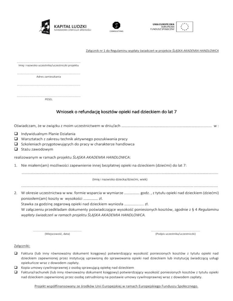 Załącznik nr 1 do Regulaminu wypłaty świadczeń w projekcie ŚLĄSKA AKADEMIA HANDLOWCA ……………………………………………………………………………… Imię i nazwisko uczestnika/uczestniczki projektu …………………………………………………………………………….. Adres zamieszkania …………………………………………………………………………….. ……………………………………………………………………………… PESEL Wniosek o refundację kosztów opieki nad dzieckiem do lat 7 Oświadczam, że w związku z moim uczestnictwem w dniu/ach ………………………………………………………………………………… w : Indywidualnym Planie Działania Warsztatach z zakresu technik aktywnego poszukiwania pracy Szkoleniach przygotowujących do pracy w charakterze handlowca Stażu zawodowym realizowanym w ramach projektu ŚLĄSKA AKADEMIA HANDLOWCA: 1. Nie miałem(am) możliwości zapewnienie innej bezpłatnej opieki na dzieckiem (dziećmi) do lat 7: …………………………………………………………………………………………………………………………………………………………………………………. (Imię i nazwisko dziecka/dziećmi, wiek) ........................................................................................................................................................................................... 2. W okresie uczestnictwa w ww. formie wsparcia w wymiarze ……………. godz. , z tytułu opieki nad dzieckiem (dziećmi) poniosłem(am) koszty w wysokości …………… zł. Stawka za godzinę zegarową opieki nad dzieckiem wyniosła ……………….. zł. W załączeniu przedkładam dokumenty poświadczające wysokość poniesionych kosztów, zgodnie z § 4 Regulaminu wypłaty świadczeń w ramach projektu ŚLĄSKA AKADEMIA HANDLOWCA. ………………………………………………………….. (Miejscowość, data) …………………………………………………………… (Podpis uczestnika/uczestniczki) Załączniki: Faktura (lub inny równoważny dokument księgowy) potwierdzający wysokość poniesionych kosztów z tytułu opieki nad dzieckiem zapewnionej przez instytucję uprawioną do sprawowania opieki nad dzieckiem lub instytucję świadczącą usługi opiekuńcze wraz z dowodem zapłaty. Kopia umowy cywilnoprawnej z osobą sprawującą opiekę nad dzieckiem Faktura/rachunek (lub inny równoważny dokument księgowy) potwierdzający wysokość poniesionych kosztów z tytułu opieki nad dzieckiem zapewnionej przez osobę zatrudnioną na postawie umowy cywilnoprawnej wraz z dowodem zapłaty. Projekt współfinansowany ze środków Unii Europejskiej w ramach Europejskiego Funduszu Społecznego.