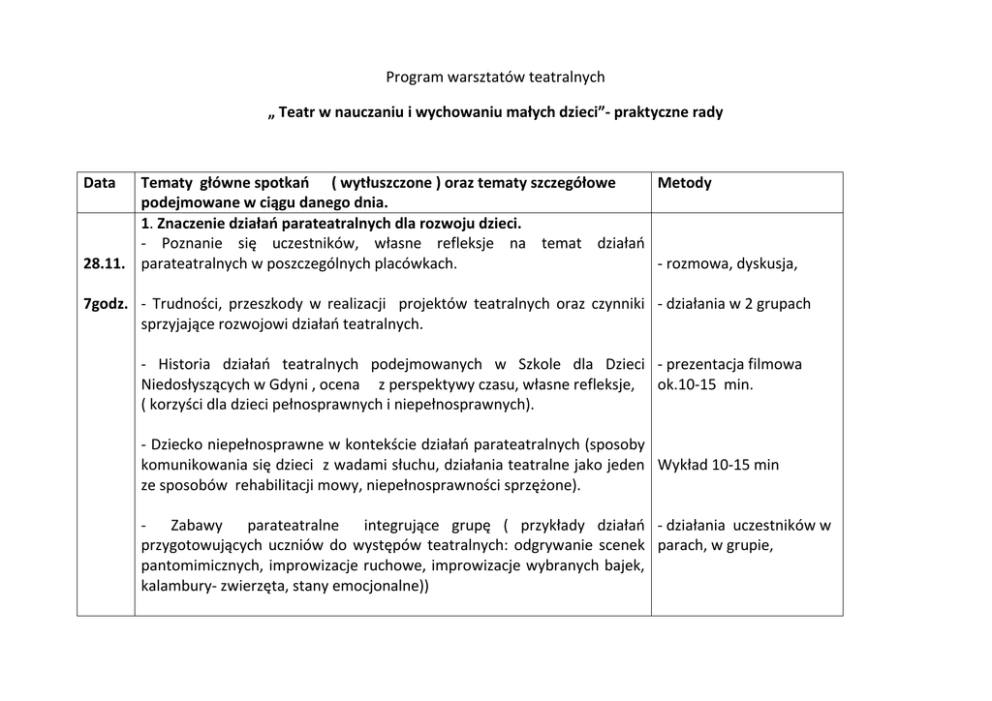Program warsztatów teatralnych „ Teatr w nauczaniu i wychowaniu małych dzieci”- praktyczne rady Data Tematy główne spotkań ( wytłuszczone ) oraz tematy szczegółowe Metody podejmowane w ciągu danego dnia. 1. Znaczenie działań parateatralnych dla rozwoju dzieci. - Poznanie się uczestników, własne refleksje na temat działań - rozmowa, dyskusja, 28.11. parateatralnych w poszczególnych placówkach. 7godz. - Trudności, przeszkody w realizacji projektów teatralnych oraz czynniki - działania w 2 grupach sprzyjające rozwojowi działań teatralnych. - Historia działań teatralnych podejmowanych w Szkole dla Dzieci - prezentacja filmowa Niedosłyszących w Gdyni , ocena z perspektywy czasu, własne refleksje, ok.10-15 min. ( korzyści dla dzieci pełnosprawnych i niepełnosprawnych). - Dziecko niepełnosprawne w kontekście działań parateatralnych (sposoby komunikowania się dzieci z wadami słuchu, działania teatralne jako jeden Wykład 10-15 min ze sposobów rehabilitacji mowy, niepełnosprawności sprzężone). Zabawy parateatralne integrujące grupę ( przykłady działań - działania uczestników w przygotowujących uczniów do występów teatralnych: odgrywanie scenek parach, w grupie, pantomimicznych, improwizacje ruchowe, improwizacje wybranych bajek, kalambury- zwierzęta, stany emocjonalne)) 2. Etapy przygotowania spektaklu : Spotkanie przed występami -Rola zespołu samokształceniowego nauczycieli w przygotowaniu ciekawego przedstawienia, szukanie -prezentacja ciekawych odpowiedzi na pytanie: Jak stworzyć własny warsztat teatralny? Na rekwizytów , strojów, co należy zwrócić uwagę, aby przedstawienie budziło emocje i było dyskusja, praktyczne rady pozytywnie odebrane? ( omówienie warsztatu teatralnego – dotyczące scenografii wybór scenariusza dostosowanego do danej grupy dzieci, stroje, rekwizyty, scenografia, muzyka, nagłośnienie, oświetlenie, najczęściej popełniane błędy podczas przygotowania przedstawienia, gra aktorska- ruch sceniczny), Znaczenie prób w przygotowaniu spektaklu. - rozmowa kierowana Przygotowanie krótkich przedstawień pantomimicznych w oparciu o krótkie scenariusze oraz dostępne rekwizyty. - działania w grupach. Prezentacja przedstawienia, omówienie, dyskusja. - działania w grupach - Podsumowanie- ustalenie korzyści dla uczniów , nauczycieli, rodziców oraz szkoły płynących z podejmowania działań parateatralnych. ( zapis na dużych kartach szarego papieru) 29.11 3. Całoroczny i wieloletni projekt działań teatralnych. 5godz. - Prezentacja projektu działań teatralnych podejmowanych w SP nr 49. - wykład, slajdy ok.20 min. - Rola zespołu samokształceniowego, grupy współpracujących nauczycieli - dyskusja. w realizacji projektu. - Opracowanie harmonogramu działań parateatralnych na dany rok szkolny (wyjścia do teatru, teatrzyki dziecięce, krótkie inscenizacje, jasełka, wspólne przedstawienia z rodzicami, jako sposób wykorzystania działań teatralnych w realizacji programu wychowawczego szkoły, przedszkola). - pomysły na wykorzystanie działań parateatralnych na lekcjach, burza mózgów, rozmowa kierowana, działania w parach - Zabawy integrujące grupę [ zgadnij jaki to znak?,- prezentacja znaków - zabawy integrujące migowych , odgadywanie ich znaczenia, stojąc w kręgu powtarzanie imion, uczestników, jako nast. znaków migowych, gestów, prezentowanie ruchem, mimiką postaci z przykłady zabaw dla dzieci bajek ) - W jaki sposób przygotować projekt, aby realizował ideę integracji dzieci - wskazówki i praktyczne pełnosprawnych i niepełnosprawnych, środowiska? [Organizacja rady przeglądów teatralnych( wyjścia do innych szkół, zapraszanie przedszkoli, szkół] - Opracowanie w parach projektów w oparciu o zgromadzone informacje - Prezentacja projektów, omówienie, dyskusja, wnioski