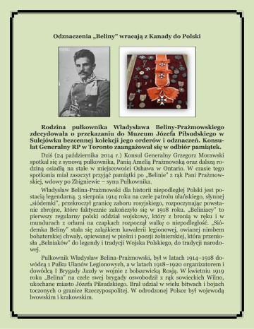 Odznaczenia „Beliny” wracają z Kanady do Polski Rodzina pułkownika Władysława Beliny-Prażmowskiego zdecydowała o przekazaniu do Muzeum Józefa Piłsudskiego w Sulejówku bezcennej kolekcji jego orderów i odznaczeń. Konsulat Generalny RP w Toronto zaangażował się w odbiór pamiątek. Dziś (24 października 2014 r.) Konsul Generalny Grzegorz Morawski spotkał się z synową pułkownika, Panią Amelią Prażmowską oraz dalszą rodziną osiadłą na stałe w miejscowości Oshawa w Ontario. W czasie tego spotkania miał zaszczyt przyjąć pamiątki po „Belinie” z rąk Pani Prażmowskiej, wdowy po Zbigniewie – synu Pułkownika. Władysław Belina-Prażmowski dla historii niepodległej Polski jest postacią legendarną. 3 sierpnia 1914 roku na czele patrolu ułańskiego, słynnej „siódemki”, przekroczył granicę zaboru rosyjskiego, rozpoczynając powstanie zbrojne, które faktycznie zakończyło się w 1918 roku. „Beliniacy” to pierwszy regularny polski oddział wojskowy, który z bronią w ręku i w mundurach z orłami na czapkach rozpoczął walkę o niepodległość. „Siódemka Beliny” stała się zalążkiem kawalerii legionowej, owianej nimbem bohaterskiej chwały, opiewanej w pieśni i poezji żołnierskiej, która przeniosła „Belniaków” do legendy i tradycji Wojska Polskiego, do tradycji narodowej. Pułkownik Władysław Belina-Prażmowski, był w latach 1914–1918 dowódcą 1 Pułku Ułanów Legionowych, a w latach 1918–1920 organizatorem i dowódcą I Brygady Jazdy w wojnie z bolszewicką Rosją. W kwietniu 1919 roku „Belina” na czele swej brygady oswobodził z rąk sowieckich Wilno, ukochane miasto Józefa Piłsudskiego. Brał udział w wielu bitwach i bojach toczonych o granice Rzeczypospolitej. W odrodzonej Polsce był wojewodą lwowskim i krakowskim. Pułkownika Władysława Belinę-Prażmowskiego wiązała z Marszałkiem nie tylko podległość służbowa, ale również szczera przyjaźń, scementowana wspólną walką, przyjaźń, która przerodziła się w serdeczne więzi wiążące obie rodziny. Z rąk Marszałka otrzymał „Belina” większość odznaczeń, m.in.: Krzyż Virtuti Militari – za szczególne męstwo na polu walki, Krzyż Niepodległości z mieczami, Order Odrodzenia Polski, kilkakrotnie nadany Krzyż Walecznych. Zbiór zawiera ponadto około 20 innych orderów, odznaczeń i odznak honorowych, nie tylko polskich, lecz także łotewskich, estońskich i węgierskich. Muzeum Józefa Piłsudskiego w Sulejówku zostało powołane w 2008 roku przez Ministra Kultury i Dziedzictwa Narodowego oraz Fundację Rodziny Józefa Piłsudskiego. Jego sercem jest Dworek Milusin. Celem muzeum jest gromadzenie i ochrona pamiątek związanych z Marszałkiem i jego współpracownikami, walką o niepodległość i odbudową Państwa Polskiego. W 2017 roku zbiory Muzeum będą eksponowane na wystawie stałej w nowoczesnym budynku, zbudowanym nieopodal dworku w Sulejówku. Obecnie trwają prace projektowe nad ekspozycją stałą oraz kompletowanie zbiorów. Pani Amelia Prażmowska i Grzegorz Morawski, konsul RP w Toronto. Fot. Grzegorz Jopkiewicz Ordery słynnego Beliny już w Muzeum Józefa Piłsudskiego w Sulejówku http://wiekdwudziesty.pl/ordery-slynnego-beliny-w-zbiorach-muzeum-jozefa-pilsudskiego-w-sulejowku/