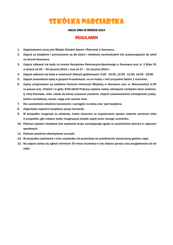 SZKÓŁKA NARCIARSKA AKCJA ZIMA W MIEŚCIE 2014 REGULAMIN 1. Organizatorem kursu jest Miejski Ośrodek Sportu i Rekreacji w Sosnowcu. 2. Zajęcia są bezpłatne i przeznaczone są dla dzieci i młodzieży zamieszkałych lub uczęszczających do szkół na terenie Sosnowca. 3. Zajęcia odbywać się będą na terenie Kompleksu Rekreacyjno-Sportowego w Sosnowcu przy ul. 3 Maja 51 w dniach od 20 – 24 stycznia 2014 r. oraz od 27 – 31 stycznia 2014 r. 4. Zajęcia odbywać się będą w ustalonych blokach godzinowych: 9:30 - 10:30, 12:30 - 13:30, 14:00 - 15:00. 5. Zajęcia prowadzone będą w grupach 6-osobowych, na na każdą z nich przypadać będzie 1 instruktor. 6. Zapisy przyjmowane są osobiście Centrum Informacji Miejskiej w Sosnowcu przy ul. Warszawskiej 3/20 (w pasażu przy „Patelni”) w godz. 8:00-18:00 Podczas zapisów należy udostępnić niezbędne dane osobowe, tj. Imię Nazwisko, wiek, szkoła do której uczęszcza uczestnik, stopień zaawansowania (umiejętności jazdy), telefon kontaktowy, wzrost, wagę oraz rozmiar buta. 7. Dla uczestników szkolenia korzystanie z wyciągów na stoku oraz jest bezpłatne. 8. Organizator zapewnia bezpłatny sprzęt narciarski. 9. W przypadku rezygnacji ze szkolenia, kwota uiszczona za wypożyczenie sprzętu zostanie zwrócona tylko w przypadku, gdy miejsce osoby rezygnującej zostało zajęte przez nowego uczestnika. 10. Podczas zapisów niezbędne jest wypisanie druku wyrażającego zgodę na uczestnictwo dziecka w zajęciach sportowych. 11. Podczas szkolenia obowiązkowe są kaski. 12. W przypadku spóźnienia z winy uczestnika nie przewiduję się przedłużenia wyznaczonej godziny zajęć. 13. Na zajęcia należy się zgłosić minimum 30 minut wcześniej w celu doboru sprzętu oraz przygotowaniu się do zajęć.