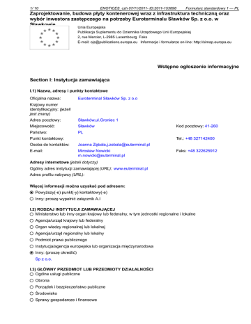 1/ 10 ENOTICES_czh 07/11/2011- ID:2011-153898 Formularz standardowy 1 — PL Zaprojektowanie, budowa płyty kontenerowej wraz z infrastruktura techniczną oraz wybór inwestora zastępczego na potrzeby Euroterminalu Sławków Sp. z o.o. w Sławkowie. Unia Europejska Publikacja Suplementu do Dziennika Urzędowego Unii Europejskiej 2, rue Mercier, L-2985 Luxembourg Faks E-mail: [email protected] Informacje i formularze on-line: http://simap.europa.eu Wstępne ogłoszenie informacyjne Section I: Instytucja zamawiająca I.1) Nazwa, adresy i punkty kontaktowe Oficjalna nazwa: Euroterminal Sławków Sp. z o.o Krajowy numer identyfikacyjny: (jeżeli jest znany) _____ Adres pocztowy: Sławków,ul.Groniec 1 Miejscowość: Sławków Państwo: PL Punkt kontaktowy: _____ Osoba do kontaktów: Joanna Zębala,[email protected] E-mail: Mirosław Nowicki [email protected] Kod pocztowy: 41-260 Tel.: +48 327142400 Faks: +48 322625912 Adresy internetowe (jeżeli dotyczy) Ogólny adres instytucji zamawiającej (URL): www.euterminal.pl Adres profilu nabywcy (URL): _____ Więcej informacji można uzyskać pod adresem: Powyższy(-e) punkt(-y) kontaktowy(-e) Inny: proszę wypełnić załącznik A.I I.2) RODZAJ INSTYTUCJI ZAMAWIAJĄCEJ Ministerstwo lub inny organ krajowy lub federalny, w tym jednostki regionalne i lokalne Agencja/urząd krajowy lub federalny Organ władzy regionalnej lub lokalnej Agencja/urząd regionalny lub lokalny Podmiot prawa publicznego Instytucja/agencja europejska lub organizacja międzynarodowa Inny: (proszę określić) Sp z o.o. I.3) GŁÓWNY PRZEDMIOT LUB PRZEDMIOTY DZIAŁALNOŚCI Ogólne usługi publiczne Obrona Porządek i bezpieczeństwo publiczne Środowisko Sprawy gospodarcze i finansowe 2/ 10 ENOTICES_czh 07/11/2011- ID:2011-153898 Formularz standardowy 1 — PL Zaprojektowanie, budowa płyty kontenerowej wraz z infrastruktura techniczną oraz wybór inwestora zastępczego na potrzeby Euroterminalu Sławków Sp. z o.o. w Sławkowie. Zdrowie Budownictwo i obiekty komunalne Ochrona socjalna Rekreacja, kultura i religia Edukacja Inny: (proszę określić) Handel, usługi I.4) UDZIELENIE ZAMÓWIENIA W IMIENIU INNYCH INSTYTUCJI ZAMAWIAJĄCYCH Instytucja zamawiająca dokonuje zakupu w imieniu innych instytucji zamawiających: tak nie (jeżeli tak, więcej informacji o tych instytucjach/podmiotach zamawiających można podać w załączniku A.) 3/ 10 ENOTICES_czh 07/11/2011- ID:2011-153898 Formularz standardowy 1 — PL Zaprojektowanie, budowa płyty kontenerowej wraz z infrastruktura techniczną oraz wybór inwestora zastępczego na potrzeby Euroterminalu Sławków Sp. z o.o. w Sławkowie. Sekcja II.A: OBJECT OF THE CONTRACT (Roboty budowlane) II.1) Nazwa nadana zamówieniu przez instytucję zamawiającą Zaprojektowanie, budowa płyty kontenerowej wraz z infrastruktura techniczną oraz wybór inwestora zastępczego na potrzeby Euroterminalu Sławków Sp. z o.o. w Sławkowie. II.2) Rodzaj zamówienia oraz lokalizacja robót budowlanych Kod NUTS: PL22B Główne miejsce lub lokalizacja robót budowlanych: Międzynarodowe Centrum Logistyczne Euro terminal Sławków Sp. z o.o. 41-260 Sławków ul.Groniec 1 II.3) niniejsze ogłoszenie dotyczy umowy ramowej tak nie II.4) Krótki opis rodzaju i zakresu robót budowlanych Zamówienie zawiera: Część I obejmującą zaprojektowanie i wybudowanie płyty kontenerowej do przeładunku i składowania kontenerów 20,30,40,45 stopowych nadwozi, naczep samochodowych. Płyta o wymiarach 44,9x350mb i pow. 15715 m kw. z odwodnieniem,zabezpieczeniem p/poż.i oświetleniem oraz z jezdnią podsuwnicową o długości 362mb z dwóch stron płyty.Nawierzchnia i konstrukcja płyty kontenerowej musi zabezpieczyć bezproblemowe składowanie 5 warstw kontenerów o wadze 38-40t każdy pionowo w górę. Infrastruktura płyty kontenerowej obejmuje budowę: -torów kolejowych normalnotorowych i szerokotorowych o długości 1600 mb wraz z SRK, -sieci kanalizacji deszczowej, -sieci elektroenergetycznej, -drogi z oświetleniem o pow.15351m kw. Część II.Wybór inwestora zastępczego dla przeprowadzenia nadzoru inwestorskiego dla: -zaprojektowania, budowy płyty kontenerowej, -zaprojektowania, wykonania, dostawy, montażu i dopuszczenia do eksploatacji przez UDT suwnicy kontenerowej bramowej Q=40/50t, jeżeli jest znany, Szacunkowa wartość bez VAT (jeżeli dotyczy, proszę podać wyłącznie dane liczbowe): _____ Waluta: albo Zakres: między 25000000.00 Waluta: PLN i 28000000.00 To zamówienie podzielone jest na części (w celu podania szczegółów o częściach zamówienia należy wykorzystać załącznik B tyle razy, ile jest części zamówienia) tak nie II.5) Wspólny Słownik Zamówień (CPV) Główny przedmiot Słownik główny 45213000 Słownik uzupełniający (jeżeli dotyczy) II.6) Planowana data rozpoczęcia procedury udzielania zamówienia oraz czas trwania zamówienia Planowana data (jeżeli jest znany) rozpoczęcia procedury 10/01/2012 (dd/mm/rrrr) udzielania zamówienia Okres w miesiącach: _____ albo Planowana data (jeżeli jest znany) albo w dniach: _____ (od udzielenia zamówienia) 4/ 10 ENOTICES_czh 07/11/2011- ID:2011-153898 Formularz standardowy 1 — PL Zaprojektowanie, budowa płyty kontenerowej wraz z infrastruktura techniczną oraz wybór inwestora zastępczego na potrzeby Euroterminalu Sławków Sp. z o.o. w Sławkowie. rozpoczęcia robót budowlanych 01/06/2012 (dd/mm/rrrr) zakończenia robót budowlanych 31/12/2013 (dd/mm/rrrr) II.7) Zamówienie jest objęte Porozumieniem w sprawie zamówień rządowych (GPA) tak nie II.8) Informacje dodatkowe (jeżeli dotyczy) _____ 5/ 10 ENOTICES_czh 07/11/2011- ID:2011-153898 Formularz standardowy 1 — PL Zaprojektowanie, budowa płyty kontenerowej wraz z infrastruktura techniczną oraz wybór inwestora zastępczego na potrzeby Euroterminalu Sławków Sp. z o.o. w Sławkowie. Sekcja II.B: OBJECT OF THE CONTRACT (dostawy lub usługi) (1) II.1) Nazwa nadana zamówieniu przez instytucję zamawiającą __