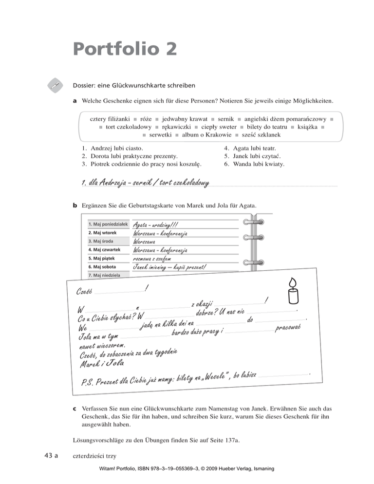 Portfolio 2 Dossier: eine Glückwunschkarte schreiben a Welche Geschenke eignen sich für diese Personen? Notieren Sie jeweils einige Möglichkeiten. cztery filiżanki 0 róże 0 jedwabny krawat 0 sernik 0 angielski dżem pomarańczowy 0 0 tort czekoladowy 0 rękawiczki 0 ciepły sweter 0 bilety do teatru 0 książka 0 0 serwetki 0 album o Krakowie 0 sześć szklanek 1. Andrzej lubi ciasto. 2. Dorota lubi praktyczne prezenty. 3. Piotrek codziennie do pracy nosi koszulę. 4. Agata lubi teatr. 5. Janek lubi czytać. 6. Wanda lubi kwiaty. 1. dla Andrzeja - sernik / tort czekoladowy ......................................................................................................................................................................................................... b Ergänzen Sie die Geburtstagskarte von Marek und Jola für Agata. Agata - urodziny!!! Warszawa - konferencja Warszawa Warszawa - konferencja rozmowa z szefem Janek imieniny – kupić prezent! Cześć ................. .............................. ! ! z okazji n . W U nas nic ? rze dob W . Co u Ciebie słychać? do ka dni na kil na ę jad ć pracowa We o pracy i duż dzo bar m ty Jola ma w nawet wieczorem. nie Cześć, do zobaczenia za dwa tygod Marek i Jola . bo lubisz , le” ese „W na ety bil : my ma już P.S. Prezent dla Ciebie ................. ................. .............................. ................. .............................. .............................. ..... .............................. ............ ................. .............................. ................. .............................. ..... .............................. ............ ................. .............................. ................. .............................. ................. .............................. ................. .............................. c Verfassen Sie nun eine Glückwunschkarte zum Namenstag von Janek. Erwähnen Sie auch das Geschenk, das Sie für ihn haben, und schreiben Sie kurz, warum Sie dieses Geschenk für ihn ausgewählt haben. Lösungsvorschläge zu den Übungen finden Sie auf Seite 137a. 43 a czterdzieści trzy Witam! Portfolio, ISBN 978–3–19–055369–3, © 2009 Hueber Verlag, Ismaning P2 Lernstrategien: Wie gehe ich mit schwierigen Hör- oder Lesetexten um? Sobald man sich mit authentischen Texten beschäftigt, ist man damit konfrontiert, dass man nicht auf Anhieb alles im Detail verstehen kann. Wie kommen Sie damit zurecht? Kreuzen Sie an. y Anhand des Titels überlege ich mir im Voraus, worum es in dem Text gehen könnte, und welcher Wortschatz dabei wahrscheinlich vorkommt. y Ich konzentriere mich auf die Schlüsselwörter und versuche so die Kerninformationen des Textes zu erfassen. y Ich nutze nicht-sprachliche Informationen: Beim Hören achte ich zum Beispiel auf Hintergrundgeräusche und den Ausdruck in der Stimme; beim Lesen sehe ich mir Bilder und Layout genau an. y Stellen, die ich einfach nicht verstehen kann, versuche ich auf der Basis meines Weltwissens zu erraten. y Ich spreche mit anderen darüber und wir versuchen den Text gemeinsam zu „knacken“. Welche Strategien erscheinen Ihnen besonders erfolgversprechend? Tauschen Sie sich mit den anderen im Kurs darüber aus, was Sie in Zukunft ausprobieren wollen. ☺ ✔ Resümee nach den Lektionen 4 – 6 Ich kann jetzt… Kursbuch … um etwas bitten. L4: Ü2 … etwas zum Essen und Trinken bestellen. L4: Ü1; L5: Ü2, 3 … sagen, was ich mag / nicht mag. L4: Ü3; L5: Ü3 … einen Tisch reservieren. L5: Ü1 … nach dem Befinden fragen. L6: Ü3 … jemandem gratulieren. L6: Ü2 … die Tageszeiten und Wochentage. L6: Ü4 … die Zahlen von 20 bis 100. L6: Ü5 Außerdem habe ich gelernt: ............................................................................................................................................................................................................. ............................................................................................................................................................................................................. ............................................................................................................................................................................................................. ............................................................................................................................................................................................................. czterdzieści trzy Witam! Portfolio, ISBN 978–3–19–055369–3, © 2009 Hueber Verlag, Ismaning 43 b