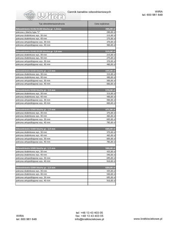 Cennik kanałów odwodnieniowych Typ odwodnienia/przykrycia Cena wyjściowa Odwodnienie S140/S150 blacha gr. 1,5mm 405,00 zł pokrywa z blachy typu "C" 200,00 zł pokrywa drabinkowa wys. 30 mm 215,00 zł pokrywa drabinkowa wys. 40 mm 275,00 zł pokrywa antypoślizgowa wys. 30 mm 370,00 zł pokrywa antypoślizgowa wys. 40 mm 460,00 zł Odwodnienie S140/S150 blacha gr. 2,0 mm 515,00 zł pokrywa drabinkowa wys. 30 mm 215,00 zł pokrywa drabinkowa wys. 40 mm 275,00 zł pokrywa antypoślizgowa wys. 30 mm 370,00 zł pokrywa antypoślizgowa wys. 40 mm 460,00 zł Odwodnienie S220 blacha gr. 1,5 mm 445,00 zł pokrywa drabinkowa wys. 30 mm 315,00 zł pokrywa drabinkowa wys. 40 mm 400,00 zł pokrywa antypoślizgowa wys. 30 mm 500,00 zł pokrywa antypoślizgowa wys. 40 mm 660,00 zł Odwodnienie S220 blacha gr. 2,0 mm 570,00 zł pokrywa drabinkowa wys. 30 mm 315,00 zł pokrywa drabinkowa wys. 40 mm 400,00 zł pokrywa antypoślizgowa wys. 30 mm 500,00 zł pokrywa antypoślizgowa wys. 40 mm 660,00 zł Odwodnienie S260 blacha gr. 1,5 mm 471,00 zł pokrywa drabinkowa wys. 30 mm 375,00 zł pokrywa drabinkowa wys. 40 mm 465,00 zł pokrywa antypoślizgowa wys. 30 mm 605,00 zł pokrywa antypoślizgowa wys. 40 mm 785,00 zł Odwodnienie S260 blacha gr. 2,0 mm 600,00 zł pokrywa drabinkowa wys. 30 mm 375,00 zł pokrywa drabinkowa wys. 40 mm 465,00 zł pokrywa antypoślizgowa wys. 30 mm 605,00 zł pokrywa antypoślizgowa wys. 40 mm 785,00 zł Odwodnienie S300 blacha gr. 1,5 mm 500,00 zł pokrywa drabinkowa wys. 30 mm 425,00 zł pokrywa drabinkowa wys. 40 mm 540,00 zł pokrywa antypoślizgowa wys. 30 mm 695,00 zł pokrywa antypoślizgowa wys. 40 mm 910,00 zł Odwodnienie S300 blacha gr. 2,0 mm 650,00 zł pokrywa drabinkowa wys. 30 mm 425,00 zł pokrywa drabinkowa wys. 40 mm 540,00 zł pokrywa antypoślizgowa wys. 30 mm 695,00 zł pokrywa antypoślizgowa wys. 40 mm 910,00 zł WIRA tel: 600 981 648 WIRA tel: 600 981 648 tel: +48 13 43 403 05 fax: +48 13 43 403 05 [email protected] www.kratkisciekowe.pl Cennik kanałów odwodnieniowych Odwodnienie S350 blacha gr. 1,5 mm 525,00 zł pokrywa drabinkowa wys. 30 mm 500,00 zł pokrywa drabinkowa wys. 40 mm 625,00 zł pokrywa antypoślizgowa wys. 30 mm 810,00 zł pokrywa antypoślizgowa wys. 40 mm 1 075,00 zł Odwodnienie S350 blacha gr. 2,0 mm 675,00 zł pokrywa drabinkowa wys. 30 mm 500,00 zł pokrywa drabinkowa wys. 40 mm 625,00 zł pokrywa antypoślizgowa wys. 30 mm 810,00 zł pokrywa antypoślizgowa wys. 40 mm 1 075,00 zł Odwodnienie S400 blacha gr. 1,5 mm 575,00 zł pokrywa drabinkowa wys. 30 mm 565,00 zł pokrywa drabinkowa wys. 40 mm 705,00 zł pokrywa antypoślizgowa wys. 30 mm 925,00 zł pokrywa antypoślizgowa wys. 40 mm 1 230,00 zł Odwodnienie S400 blacha gr. 2,0 mm 725,00 zł pokrywa drabinkowa wys. 30 mm 565,00 zł pokrywa drabinkowa wys. 40 mm 705,00 zł pokrywa antypoślizgowa wys. 30 mm 925,00 zł pokrywa antypoślizgowa wys. 40 mm 1 230,00 zł WIRA tel: 600 981 648 WIRA tel: 600 981 648 tel: +48 13 43 403 05 fax: +48 13 43 403 05 [email protected] www.kratkisciekowe.pl