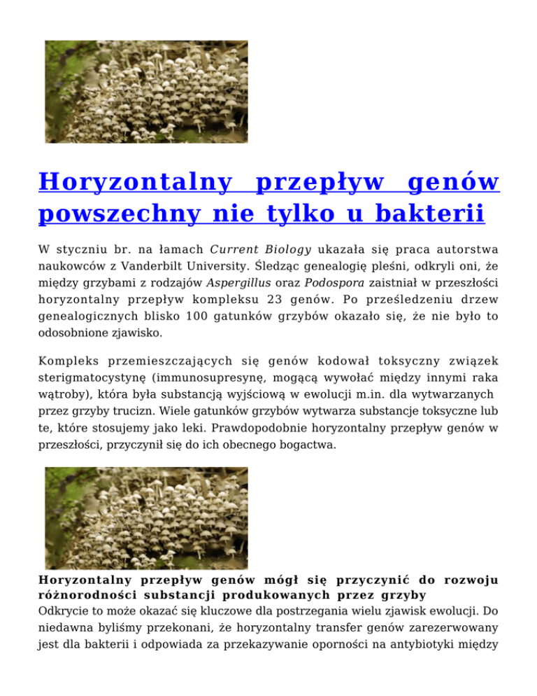 Horyzontalny przepływ genów powszechny nie tylko u bakterii W styczniu br. na łamach Current Biology ukazała się praca autorstwa naukowców z Vanderbilt University. Śledząc genealogię pleśni, odkryli oni, że między grzybami z rodzajów Aspergillus oraz Podospora zaistniał w przeszłości horyzontalny przepływ kompleksu 23 genów. Po prześledzeniu drzew genealogicznych blisko 100 gatunków grzybów okazało się, że nie było to odosobnione zjawisko. Kompleks przemieszczających się genów kodował toksyczny związek sterigmatocystynę (immunosupresynę, mogącą wywołać między innymi raka wątroby), która była substancją wyjściową w ewolucji m.in. dla wytwarzanych przez grzyby trucizn. Wiele gatunków grzybów wytwarza substancje toksyczne lub te, które stosujemy jako leki. Prawdopodobnie horyzontalny przepływ genów w przeszłości, przyczynił się do ich obecnego bogactwa. Horyzontalny przepływ genów mógł się przyczynić do rozwoju różnorodności substancji produkowanych przez grzyby Odkrycie to może okazać się kluczowe dla postrzegania wielu zjawisk ewolucji. Do niedawna byliśmy przekonani, że horyzontalny transfer genów zarezerwowany jest dla bakterii i odpowiada za przekazywanie oporności na antybiotyki między różnymi szczepami. Natomiast wśród organizmów wyższych postrzegany był jako zjawisko epizodyczne, bez większego znaczenia. Może się jednak okazać, że również u bardziej złożonych organizmów odegrał on kluczową rolę w ewolucji. Więcej czytaj: http://www.cell.com/current-biology/retrieve/pii/S0960982210016519 Palacze rozgryzieni Naukowcy z The Scripps Research Institute odkryli mutację odpowiedzialną za uzależnienie od nikotyny i sterujący nim mechanizm w organizmie. Podczas badań na myszach okazało się, że osobniki ze zmutowanym genem CHRNA5 kodującym podjednostkę a5 receptora nikotynowego wykazują znacznie wyższe spożycie pokarmu z dodatkiem nikotyny, od osobników bez mutacji. Badacze odkryli, że strukturą w mózgu, która odpowiada za regulację spożycia nikotyny jest uzdeczka oraz struktury, do których odbywa się projekcja w obrębie pęczka tyłozgiętego. Nikotyna aktywuje receptory nikotynowe w obrębie uzdeczki, która reguluje chęć spożycia substancji. W sytuacji, gdy mutacji podlega jedna z podjednostek receptora, ta regulacja zostaje zachwiana i osobnik zaczyna odczuwać głód nikotynowy. Horyzontalny przepływ genów mógł się przyczynić do rozwoju różnorodności substancji produkowanych przez grzyby Badania na ludziach wykazały, że większość przebadanych osób posiadała mutację właśnie w genie CHRNA5 . Ponadto okazało się, że wykazują oni zdecydowanie wyższą skłonność do zapadania na raka płuc i przewlekłą obturacyjną chorobę płuc. Naukowcy są zdania, że ich odkrycie przyczyni się do wynalezienia nowoczesnych leków, mogących pomóc rzucić palenie tym, którzy będą tego chcieli. Lek miałby stymulować działanie podjednostki a5 receptora nikotynowego w obrębie pęczka tyłozgiętego, a tym samym hamować głód nikotynowy. Nowotwór trzustki pod ostrzałem W ramach badań nad nowotworami trzustki naukowcy z Johns Hopkins University odkryli, że rozwój tego raka jest inny niż dotąd przypuszczano. Okazało się, że pierwsze mutacje, które w konsekwencji prowadzą do jego rozwinięcia, pojawiają się nawet na 15 lat przed wystąpieniem pierwszych objawów (występujących już w stadium naciekania i tworzenia przerzutów). Badacze zsekwencjonowali DNA wyizolowane z komórek przerzutów raka trzustki. Następnie wykorzystując metodę modelowania matematycznego, prześledzili rodowód mutacji występujących w jego regionach kodujących . Okazało się, że komórki rakowe powstają średnio 12 lat od pojawienia się pierwszych mutacji. Następnie przez ok. 7 lat „dojrzewają” i nabywają zdolności rozprzestrzeniania się. To daje medycynie wiele czasu na wykrycie wczesnych stadiów raka trzustki i całkowite jego wyleczenie przed powstaniem przerzutów. Horyzontalny przepływ genów mógł się przyczynić do rozwoju różnorodności substancji produkowanych przez grzyby Kiedy do tych odkryć dołączy się doniesienia z ostatnich lat o odkrytych czterech markerach RNA tego nowotworu oraz o optycznej metodzie rozróżniania stadiów jego rozwoju, to otrzymamy skuteczną diagnostykę, która może znacząco wpłynąć na zwiększenie przeżywalności pacjentów. Oznacza to ni mniej, ni więcej tylko to, że badanie przesiewowe w tym nowotworze mogą być równie skuteczne jak w przypadku każdego innego i równie istotne. Mimo, że te innowacyjne metody nie są jeszcze powszechnie dostępne, to wczesne stadium rozwoju raka można wykryć przy pomocy tomografii komputerowej czy rezonansu magnetycznego. Konieczne jest zatem uwrażliwianie pacjentów, szczególnie tych z grup podwyższonego ryzyka, jak istotne są regularne badania. Źródło: Scientific American Polska Kolejna nowelizacja uderza w najzdolniejszych Sejm przedstawił kolejny projekt nowelizacji ustawy Prawo o szkolnictwie wyższym oraz ustawy o stopniach i tytule naukowym. Wśród propozycji zmian pojawiła się między innymi ta, aby wprowadzić opłaty za drugi kierunek studiów. Posłowie wnoszący projekt tłumaczą, że zwiększy to szanse dla osób, które gorzej zdały maturę, aby dostać się na studia, gdyż zdecydowanie mniej osób będzie chciało studiować dwa kierunki. Zaznaczają jednocześnie, że najzdolniejsi otrzymają stypendia, które umożliwią naukę bezpłatnie. Horyzontalny przepływ genów mógł się przyczynić do rozwoju różnorodności substancji produkowanych przez grzyby Pojawiają się liczne obawy, że takie rozwiązanie ograniczy wielu osobom możliwość podnoszenia kwalifikacji i skutecznie uniemożliwi zdobycie wymarzonej pracy. Ponadto istnieje ryzyko, że koniecznym stanie się zamknięcie wielu kierunków, wybieranych do tej pory j