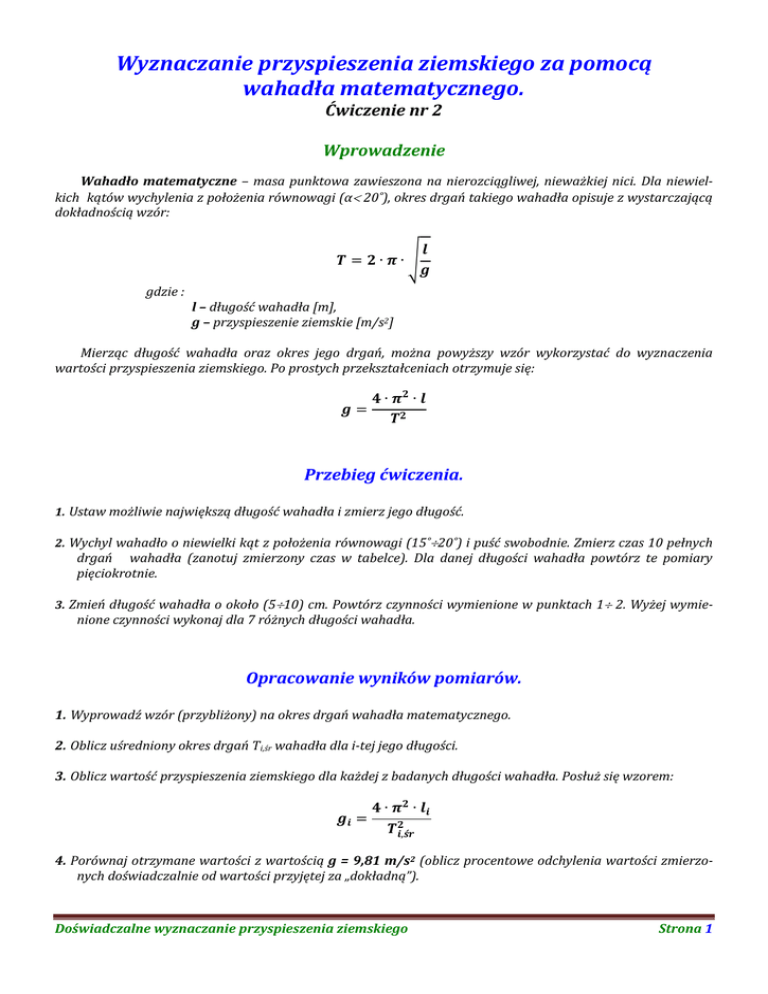ĆW. 1 Wyznaczanie przyspieszenia ziemskiego za pomocą