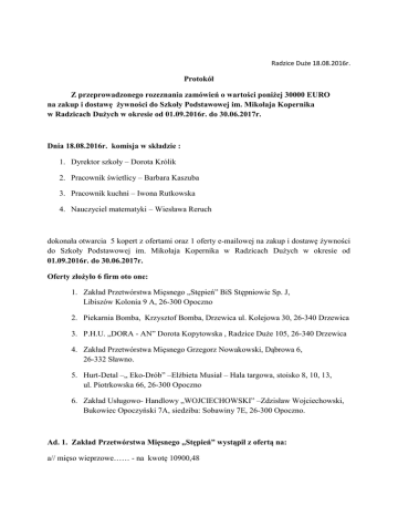 Radzice Duże 18.08.2016r. Protokół Z przeprowadzonego rozeznania zamówień o wartości poniżej 30000 EURO na zakup i dostawę żywności do Szkoły Podstawowej im. Mikołaja Kopernika w Radzicach Dużych w okresie od 01.09.2016r. do 30.06.2017r. Dnia 18.08.2016r. komisja w składzie : 1. Dyrektor szkoły – Dorota Królik 2. Pracownik świetlicy – Barbara Kaszuba 3. Pracownik kuchni – Iwona Rutkowska 4. Nauczyciel matematyki – Wiesława Reruch dokonała otwarcia 5 kopert z ofertami oraz 1 oferty e-mailowej na zakup i dostawę żywności do Szkoły Podstawowej im. Mikołaja Kopernika w Radzicach Dużych w okresie od 01.09.2016r. do 30.06.2017r. Oferty złożyło 6 firm oto one: 1. Zakład Przetwórstwa Mięsnego „Stępień” BiS Stępniowie Sp. J, Libiszów Kolonia 9 A, 26-300 Opoczno 2. Piekarnia Bomba, Krzysztof Bomba, Drzewica ul. Kolejowa 30, 26-340 Drzewica 3. P.H.U. „DORA - AN” Dorota Kopytowska , Radzice Duże 105, 26-340 Drzewica 4. Zakład Przetwórstwa Mięsnego Grzegorz Nowakowski, Dąbrowa 6, 26-332 Sławno. 5. Hurt-Detal –„ Eko-Drób” –Elżbieta Musiał – Hala targowa, stoisko 8, 10, 13, ul. Piotrkowska 66, 26-300 Opoczno 6. Zakład Usługowo- Handlowy „WOJCIECHOWSKI” –Zdzisław Wojciechowski, Bukowiec Opoczyński 7A, siedziba: Sobawiny 7E, 26-300 Opoczno. Ad. 1. Zakład Przetwórstwa Mięsnego „Stępień” wystąpił z ofertą na: a// mięso wieprzowe…… - na kwotę 10900,48 b/ artykuły spożywcze - na kwotę 8558,93 c/ produkty mleczarskie…. – na kwotę 3198,46 d/ ryby i przetwory…. – na kwotę 13679,82 e/ jaja – na kwotę 142,07.- Ad. 2. Piekarnia Bomba wystąpiła z ofertą na : a/ pieczywo - na kwotę 1884,38 Ad. 3 . P.H.U. „Dora-an” Dorota Kopytowska wystąpiła z ofertą na: a/ artykuły spożywcze – na kwotę 9436,48 b/ warzywa i owoce - na kwotę 9862,64 - c/ produkty mleczarskie….. na kwotę 3370,56 d/ ryby i przetwory … - 14843,22 e/ jaja - na kwotę 166,32 Ad. 4 Zakład Przetwórstwa Mięsnego Grzegorz Nowakowski, Dąbrowa złożył ofertę na: a/ mięso wieprzowe …- na kwotę 10694,25 b/ drób na kwotę - 3864,00 Ad. 5. Hurt-Detal –„ Eko-Drób” –Elżbieta Musiał – Hala targowa, stoisko 8, 10, 13, ul. Piotrkowska 66, 26-300 Opoczno złożył ofert na: a/ drób i produkty….. na kwotę 3735,17 - 100 pkt. Ad. 6. Zakład Usługowo- Handlowy „WOJCIECHOWSKI” –Zdzisław Wojciechowski, Bukowiec Opoczyński 7A, siedziba: Sobawiny 7E, 26-300 Opoczno. a/ mięso wieprzowe na kwotę – 10668.00 Zgodnie z regulaminem udzielania zamówień wyłoniono: - ofertę na pieczywo z piekarni BOMBA; - ofertę na warzywa i owoce, z P.H.U. „DORA- AN” Dorota Kopytowska - ofertę na mięso wieprzowe i wołowe - Zakład Usługowo- Handlowy „WOJCIECHOWSKI” –Zdzisław Wojciechowski, Bukowiec Opoczyński 7A, siedziba: Sobawiny 7E, 26-300 Opoczno. - ofertę na drób i produkty ..- Hurt-Detal –„ Eko-Drób” –Elżbieta Musiał – - ofertę na – artykuły spożywcze, produkty mleczarskie…, ryby i przetwory…, jaja Zakład Przetwórstwa Mięsnego „Stępień” BiS Stępniowie Sp. J, Libiszów Kolonia 9 A, 26-300 Opoczno Uzasadnienie: Postępowanie w sprawie udzielenia zamówienia publicznego przeprowadzono w sposób zapewniający zachowanie uczciwej konkurencji i równego traktowania wykonawców, bezstronnie i obiektywnie. Przy wyborze dostawcy komisja brała pod uwagę najkorzystniejszą ofertę cenową. Wykaz oferentów: Złącznik 2 A Chleb Lp. Oferent Kwota Punkty 1. Piekarnia BOMBA 1884,38 100 Załącznik 2 B Artykuły spożywcze Lp. Oferent Kwota Punkty 1. Zakład Przetwórstwa Mięsnego „Stępień” BiS Stępniowie Sp. J, Libiszów Kolonia 9 A, 26300 Opoczno 8558,93 100 2 P.H.U. „DORA AN” Dorota Kopytowska , Radzice Duże 105, 26-340 Drzewica 9436,48 90,70 Załącznik 2 C Mięso wieprzowe i wołowe oraz produkty wędliniarskie Lp. Oferent Kwota Punkty 1 Zakład UsługowoHandlowy „WOJCIECHOWSKI” – Zdzisław Wojciechowski, Bukowiec Opoczyński 7A, siedziba: Sobawiny 7E, 26-300 Opoczno 10668,00 100 2 Zakład Przetwórstwa Mięsnego Grzegorz Nowakowski , Dąbrowa 10694,25 99,75 3 Zakład Przetwórstwa Mięsnego „Stępień’ BiS Stępniowie Sp. J Libiszów Kolonia 10900,48 97,87 9A, 26-300 Opoczno Załącznik 2 D Drób i produkty drobiowe Lp. Oferent Kwota 1 Hurt-Detal –„ Eko-Drób” 3735,17 –Elżbieta Musiał – Hala targowa, stoisko 8, 10, 13, ul. Piotrkowska 66, 26-300 Opoczno 100 3. Zakład Przetwórstwa Mięsnego Grzegorz Nowakowski, Dąbrowa 6, 26-332 Sławno 96,67 3864,00 Punkty Załącznik 2 E Warzywa i owoce Lp. Oferent Kwota Punkty 1. P.H.U. „DORA-AN” Dorota Kopytowska 9862,64 100 Załącznik 2 F Produkty mleczarskie Lp. Oferent Kwota Punkty 1. Zakład Przetwórstwa Mięsnego „Stępień’ BiS Stępniowie Sp. J Libiszów Kolonia 9A, 26-300 Opoczno 3198,46 100 2 P.H.U. „DORA-AN” Dorota Kopytowska 3370,56 94,89 Załącznik 2 G Ryby i przetwory rybne… Lp. Oferent Kwota Punkty 1. Zakład Przetwórstwa Mięsnego „Stępień” BiS Stępniowie Sp. J, Libiszów Kolonia 9 A, 26300 Opoczno 13679,82 100 2 P.H.U. „DORA AN” Dorota Kopytowska , Radzice Duże 105, 26-340 Drzewica 14843,22 92,16 Załącznik 2 H Jaja Lp. Oferent Kwota Punkty 1. Zakład Przetwórstwa Mięsnego „Stępień” BiS Stępniowie Sp. J, Libiszów Kolonia 9 A, 26300 Opoczno 142,07 100 2 P.H.U. „DORA AN” Dorota Kopytowska , Radzice Duże 105, 26-340 Drzewica 166,32 85,42