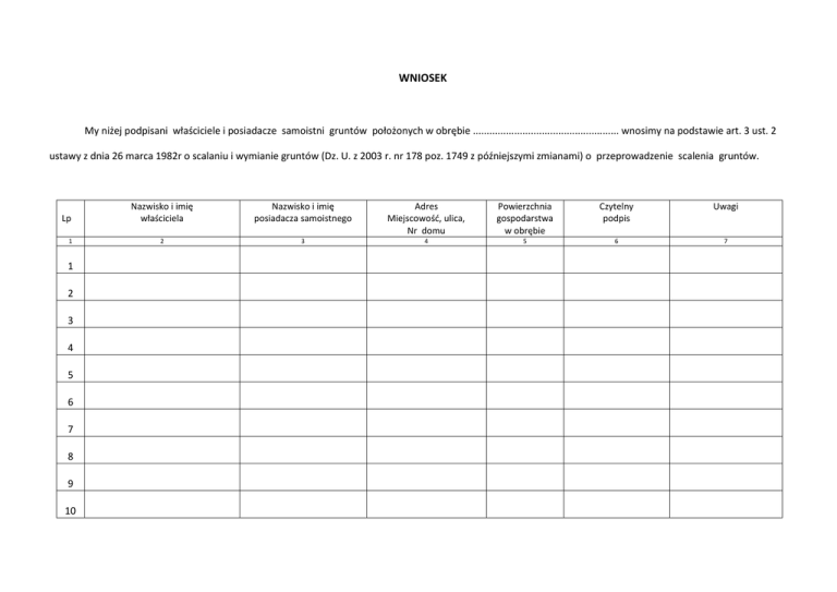 WNIOSEK My niżej podpisani właściciele i posiadacze samoistni gruntów położonych w obrębie ..................................................... wnosimy na podstawie art. 3 ust. 2 ustawy z dnia 26 marca 1982r o scalaniu i wymianie gruntów (Dz. U. z 2003 r. nr 178 poz. 1749 z późniejszymi zmianami) o przeprowadzenie scalenia gruntów. Lp 1 1 2 3 4 5 6 7 8 9 10 Nazwisko i imię właściciela Nazwisko i imię posiadacza samoistnego Adres Miejscowość, ulica, Nr domu Powierzchnia gospodarstwa w obrębie Czytelny podpis Uwagi 2 3 4 5 6 7 1 2 3 4 5 6 7 11 12 13 14 15 16 17 18 19 20 Własnoręczność podpisów osób wymienionych na powyższej liście stwierdzam. …………………………………………………………., dnia …………………………………………. podpis sołtysa wsi …………………………………………………………………