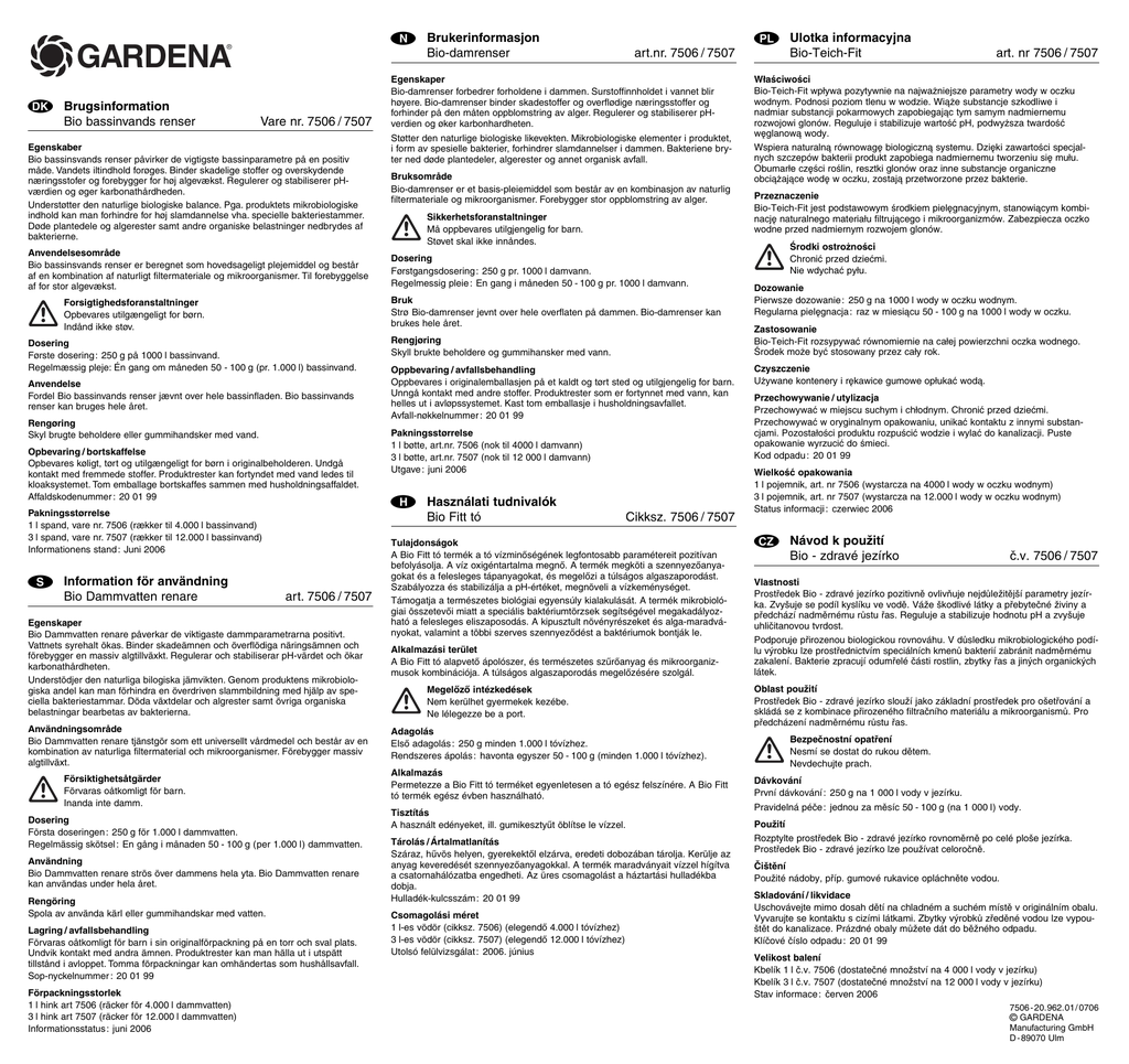 n ® GARDENA K Brugsinformation Bio bassinvands renser Vare nr. 7506 / 7507 Egenskaber Bio bassinsvands renser påvirker de vigtigste bassinparametre på en positiv måde. Vandets iltindhold forøges. Binder skadelige stoffer og overskydende næringsstofer og forebygger for høj algevækst. Regulerer og stabiliserer pHværdien og øger karbonathårdheden. Understøtter den naturlige biologiske balance. Pga. produktets mikrobiologiske indhold kan man forhindre for høj slamdannelse vha. specielle bakteriestammer. Døde plantedele og algerester samt andre organiske belastninger nedbrydes af bakterierne. Anvendelsesområde Bio bassinsvands renser er beregnet som hovedsageligt plejemiddel og består af en kombination af naturligt filtermateriale og mikroorganismer. Til forebyggelse af for stor algevækst. Dosering Første dosering : 250 g på 1000 l bassinvand. Regelmæssig pleje: Én gang om måneden 50 - 100 g (pr. 1.000 l) bassinvand. Anvendelse Fordel Bio bassinvands renser jævnt over hele bassinfladen. Bio bassinvands renser kan bruges hele året. Rengøring Skyl brugte beholdere eller gummihandsker med vand. Opbevaring / bortskaffelse Opbevares køligt, tørt og utilgængeligt for børn i originalbeholderen. Undgå kontakt med fremmede stoffer. Produktrester kan fortyndet med vand ledes til kloaksystemet. Tom emballage bortskaffes sammen med husholdningsaffaldet. Affaldskodenummer : 20 01 99 Pakningsstørrelse 1 l spand, vare nr. 7506 (rækker til 4.000 l bassinvand) 3 l spand, vare nr. 7507 (rækker til 12.000 l bassinvand) Informationens stand : Juni 2006 Information för användning Bio Dammvatten renare art. 7506 / 7507 Egenskaper Bio Dammvatten renare påverkar de viktigaste dammparametrarna positivt. Vattnets syrehalt ökas. Binder skadeämnen och överflödiga näringsämnen och förebygger en massiv algtillväxkt. Regulerar och stabiliserar pH-värdet och ökar karbonathårdheten. Understödjer den naturliga bilogiska jämvikten. Genom produktens mikrobiologiska andel kan man förhindra en överdriven slammbildning med hjälp av speciella bakteriestammar. Döda växtdelar och algrester samt övriga organiska belastningar bearbetas av bakterierna. Användningsområde Bio Dammvatten renare tjänstgör som ett universellt vårdmedel och består av en kombination av naturliga filtermaterial och mikroorganismer. Förebygger massiv algtillväxt. Försiktighetsåtgärder Förvaras oåtkomligt för barn. Inanda inte damm. Dosering Första doseringen : 250 g för 1.000 l dammvatten. Regelmässig skötsel : En gång i månaden 50 - 100 g (per 1.000 l) dammvatten. Användning Bio Dammvatten renare strös över dammens hela yta. Bio Dammvatten renare kan användas under hela året. Rengöring Spola av använda kärl eller gummihandskar med vatten. Lagring / avfallsbehandling Förvaras oåtkomligt för barn i sin originalförpackning på en torr och sval plats. Undvik kontakt med andra ämnen. Produktrester kan man hälla ut i utspätt tillstånd i avloppet. Tomma förpackningar kan omhändertas som hushållsavfall. Sop-nyckelnummer : 20 01 99 Förpackningsstorlek 1 l hink art 7506 (räcker för 4.000 l dammvatten) 3 l hink art 7507 (räcker för 12.000 l dammvatten) Informationsstatus : juni 2006 art.nr. 7506 / 7507 Egenskaper Bio-damrenser forbedrer forholdene i dammen. Surstoffinnholdet i vannet blir høyere. Bio-damrenser binder skadestoffer og overflødige næringsstoffer og forhinder på den måten oppblomstring av alger. Regulerer og stabiliserer pHverdien og øker karbonhardheten. Støtter den naturlige biologiske likevekten. Mikrobiologiske elementer i produktet, i form av spesielle bakterier, forhindrer slamdannelser i dammen. Bakteriene bryter ned døde plantedeler, algerester og annet organisk avfall. Bruksområde Bio-damrenser er et basis-pleiemiddel som består av en kombinasjon av naturlig filtermateriale og mikroorganismer. Forebygger stor oppblomstring av alger. Sikkerhetsforanstaltninger Må oppbevares utilgjengelig for barn. Støvet skal ikke innåndes. Dosering Førstgangsdosering : 250 g pr. 1000 l damvann. Regelmessig pleie : En gang i måneden 50 - 100 g pr. 1000 l damvann. Bruk Strø Bio-damrenser jevnt over hele overflaten på dammen. Bio-damrenser kan brukes hele året. Forsigtighedsforanstaltninger Opbevares utilgængeligt for børn. Indånd ikke støv. S Brukerinformasjon Bio-damrenser Rengjøring Skyll brukte beholdere og gummihansker med vann. Oppbevaring / avfallsbehandling Oppbevares i originalemballasjen på et kaldt og tørt sted og utilgjengelig for barn. Unngå kontakt med andre stoffer. Produktrester som er fortynnet med vann, kan helles ut i avløpssystemet. Kast tom emballasje i husholdningsavfallet. Avfall-nøkkelnummer : 20 01 99 Pakningsstørrelse 1 l bøtte, art.nr. 7506 (nok til 4000 l damvann) 3 l bøtte, art.nr. 7507 (nok til 12 000 l damvann) Utgave : juni 2006 H Hasznбlati tudnivalуk Bio Fitt tу Cikksz. 7506 / 7507 Tulajdonsбgok A Bio Fitt tу termйk a tу vнzminхsйgйnek legfontosabb paramйtereit pozitнvan befolyбsolja. A vнz oxigйntartalma megnх. A termйk megkцti a szennyezхanyagokat йs a felesleges tбpanyagokat, йs megelхzi a tъlsбgos algaszaporodбst. Szabбlyozza йs stabilizбlja a pH-йrtйket, megnцveli a vнzkemйnysйget. Tбmogatja a termйszetes biolуgiai egyensъly kialakulбsбt. A termйk mikrobiolуgiai цsszetevхi miatt a speciбlis baktйriumtцrzsek segнtsйgйvel megakadбlyozhatу a felesleges eliszaposodбs. A kipusztult nцvйnyrйszeket йs alga-maradvбnyokat, valamint a tцbbi szerves szennyezхdйst a baktйriumok bontjбk le. Alkalmazбsi terьlet A Bio Fitt tу alapvetх бpolуszer, йs termйszetes szыrхanyag йs mikroorganizmusok kombinбciуja. A tъlsбgos algaszaporodбs megelхzйsйre szolgбl. Megelхzх intйzkedйsek Nem kerьlhet gyermekek kezйbe. Ne lйlegezze be a port. Adagolбs Elsх adagolбs : 250 g minden 1.000 l tуvнzhez. Rendszeres бpolбs : havonta egyszer 50 