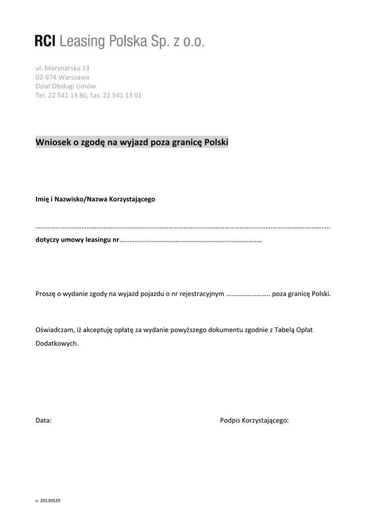ul. Marynarska 13 02-674 Warszawa Dział Obsługi Umów Tel. 22 541 13 80, fax. 22 541 13 01 Wniosek o zgodę na wyjazd poza granicę Polski Imię i Nazwisko/Nazwa Korzystającego ……………………………………………………………………………………………………………………………………………………….. dotyczy umowy leasingu nr………………………………………………………………………… Proszę o wydanie zgody na wyjazd pojazdu o nr rejestracyjnym …………………….. poza granicę Polski. Oświadczam, iż akceptuję opłatę za wydanie powyższego dokumentu zgodnie z Tabelą Opłat Dodatkowych. Data: v. 20130529 Podpis Korzystającego: