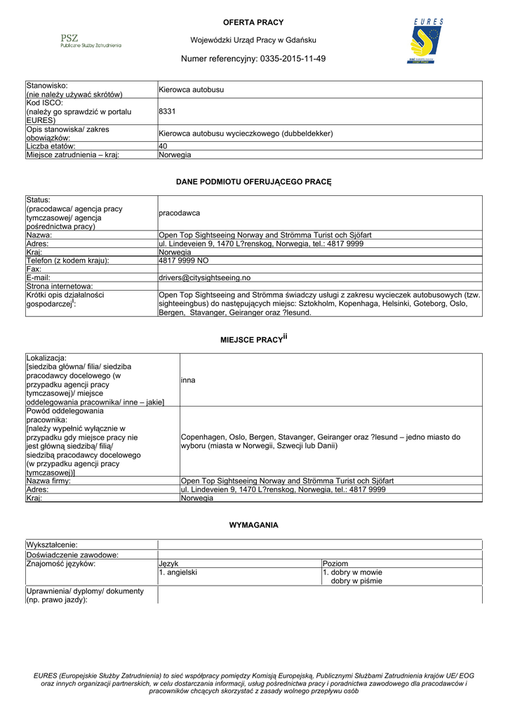 OFERTA PRACY Wojewódzki Urząd Pracy w Gdańsku Numer referencyjny: 0335-2015-11-49 Stanowisko: (nie należy używać skrótów) Kod ISCO: (należy go sprawdzić w portalu EURES) Opis stanowiska/ zakres obowiązków: Liczba etatów: Miejsce zatrudnienia – kraj: Kierowca autobusu 8331 Kierowca autobusu wycieczkowego (dubbeldekker) 40 Norwegia DANE PODMIOTU OFERUJĄCEGO PRACĘ Status: (pracodawca/ agencja pracy tymczasowej/ agencja pośrednictwa pracy) Nazwa: Adres: Kraj: Telefon (z kodem kraju): Fax: E-mail: Strona internetowa: Krótki opis działalności gospodarczeji: pracodawca Open Top Sightseeing Norway and Strömma Turist och Sjöfart ul. Lindeveien 9, 1470 L?renskog, Norwegia, tel.: 4817 9999 Norwegia 4817 9999 NO [email protected] Open Top Sightseeing and Strömma świadczy usługi z zakresu wycieczek autobusowych (tzw. sighteeingbus) do następujących miejsc: Sztokholm, Kopenhaga, Helsinki, Goteborg, Oslo, Bergen, Stavanger, Geiranger oraz ?lesund. MIEJSCE PRACYii Lokalizacja: [siedziba główna/ filia/ siedziba pracodawcy docelowego (w przypadku agencji pracy tymczasowej)/ miejsce oddelegowania pracownika/ inne – jakie] Powód oddelegowania pracownika: [należy wypełnić wyłącznie w przypadku gdy miejsce pracy nie jest główną siedzibą/ filią/ siedzibą pracodawcy docelowego (w przypadku agencji pracy tymczasowej)] Nazwa firmy: Adres: Kraj: inna Copenhagen, Oslo, Bergen, Stavanger, Geiranger oraz ?lesund – jedno miasto do wyboru (miasta w Norwegii, Szwecji lub Danii) Open Top Sightseeing Norway and Strömma Turist och Sjöfart ul. Lindeveien 9, 1470 L?renskog, Norwegia, tel.: 4817 9999 Norwegia WYMAGANIA Wykształcenie: Doświadczenie zawodowe: Znajomość języków: Język 1. angielski Poziom 1. dobry w mowie dobry w piśmie Uprawnienia/ dyplomy/ dokumenty (np. prawo jazdy): EURES (Europejskie Służby Zatrudnienia) to sieć współpracy pomiędzy Komisją Europejską, Publicznymi Służbami Zatrudnienia krajów UE/ EOG oraz innych organizacji partnerskich, w celu dostarczania informacji, usług pośrednictwa pracy i poradnictwa zawodowego dla pracodawców i pracowników chcących skorzystać z zasady wolnego przepływu osób Inne istotne wymagania: Przynajmniej 3 letnie, udokumentowane doświadczenie w pracy na podobnym stanowisku. Angielski w stopniu komunikatywnym; znajomość języka niemieckiego i hiszpańskiego będzie dodatkowym atutem. Inne wymagania: - prawo jazdy odpowiednie do zajmowanego stanowiska pracy - zaświadczenie o niekaralności - preferowana znajomość mechaniki samochodowej - dla osób, które będą chciały pracować w Sztokholmie wymagane „YKB education” WYNAGRODZENIE I WARUNKI ZATRUDNIENIA Wysokość pensji brutto: Wysokość pensji netto: Waluta, w jakiej wypłacana jest pensja: Rodzaj stawki wynagrodzenia: (godzinowa/ tygodniowa/ miesięczna/ roczna/ inna) Premie: Dodatkowe świadczenia (zakwaterowanie, wyżywienie, koszty związane ze zmianą miejsca zamieszkania, koszty podróży itp.): Nazwa firmy, z którą zostanie podpisana umowa: Rodzaj umowy: (umowa o pracę, umowa zlecenia, wolontariat, praktyka zawodowa/ staż, praca zdalna, agencja pracy tymczasowej, inne): Wymiar czasu pracy (praca na pełen etat/ część etatu): Czas trwania umowy: (nieokreślony/ określony) Liczba godzin tygodniowo: Zmiany i praca w dni wolne: Data rozpoczęcia: Inne informacje: 17,00 Euro Czasowy ze stawką godzinową brak danych Open Top Sightseeing Norway and Strömma Turist och Sjöfart inny Data wygaśnięcia umowy (w przypadku umowy na czas określony): określony brak danych 2016-04-01 Wynagrodzenie początkowe od 17 Euro brutto na godzinę. Data rozpoczęcia pracy: 01.04.16 – 01.10.16 (w zależności od wybranej lokalizacji wykonywanej pracy). SPOSÓB SKŁADANIA WNIOSKU Wymagane dokumenty (list motywacyjny, CV itp.): Język, w którym muszą być sporządzone przedkładane dokumenty: Do kogo należy wysłać dokumenty: (do pracodawcy/ doradcy EURES) Gdzie należy wysłać dokumenty: (adres, adres e-mail, nr faksu z kodem kraju itp.) Dane teleadresowe doradcy EURES lub przedstawiciela pracodawcy: (nazwisko, adres, telefon, fax, e-mail itp.) CV angielski do pracodawcy Osoby zainteresowane powyższą ofertą proszone są o przesłanie CV do pracodawcy na adres e-mail: [email protected] oraz do wiadomości do doradcy EURES w Wojewódzkim Urzędzie Pracy w Gdańsku Oddziale Zamiejscowym w Słupsku [email protected] W tytule maila proszę wpisać „busdrivers” [email protected] DODATKOWE INFORMACJE Osoba do kontaktu: Are Muzuri, tel. 0047 48179999, e-mail: [email protected] WAŻNOŚĆ 2015-11-18 Data publikacji: Termin przedkładania podań o pracę / 2015-12-31 zakończenia ważności oferty: Uprzejmie informujemy, że skontaktujemy się wyłącznie z wybranymi kandydatami. EURES (Europejskie Służby Zatrudnienia) to sieć współpracy pomiędzy Komisją Europejską, Publicznymi Służbami Zatrudnienia krajów UE/ EOG oraz innych organizacji partnerskich, w celu dostarczania informacji, usług pośrednictwa pracy i poradnictwa zawodowego dla pracodawców i pracowników chcących skorzystać z zasady wolnego przepływu osób UWAGA: 1. Umowa z zagranicznym pracodawcą jest zawierana, co do zasady, zgodnie z prawem kraju zatrudnienia. Oznacza to, że wszystkie roszczenia odnośnie warunków, które obejmuje umowa, można kierować wyłącznie do odpowiedniego sądu w kraju zatrudnienia. Publiczne służby zatrudnienia (EURES) nie mogą pośredniczyć ani reprezentować pracownika w sądzie kraju zatrudnienia w przypadku sporu z pracodawcą. 2. Publiczne służby zatrudnienia (EURES) dokładają wszelkich starań, aby zapewnić rzetelność i wiarygodność ofert pracy zgłoszonych w lokalnym urzędzie pracy. Należy wyjaśnić, że oferta pracy została zgłoszona przez stronę trzecią i EURES nie odpowiada za ewentualne rozbieżności między warunkami pracy określonymi w ofercie pracy i warunkami oferowanymi przez potencjalnego pracodawc