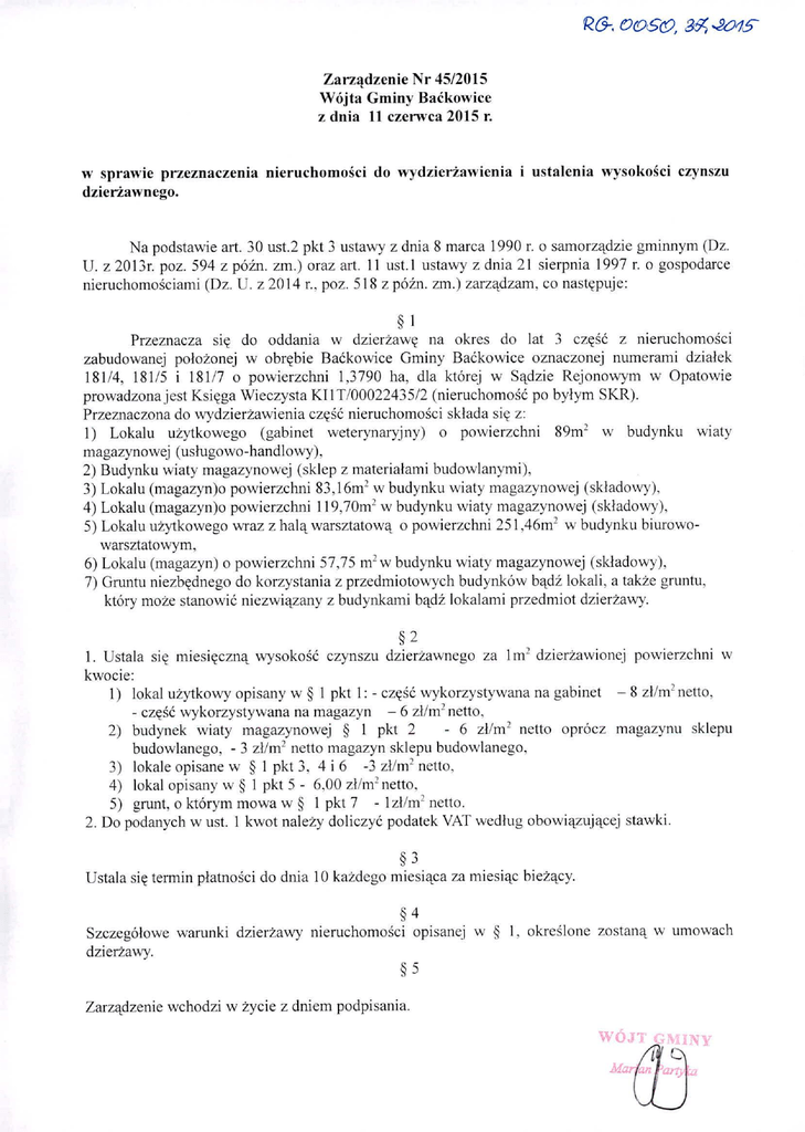 Zarz:jdzenie Nr 45/2015 Wójta Gminy Baćkowiee z dnia 11 ezenvea 2015 r. w sprawie przeznaczenia dzierLawnego. nieruchomości do wydzierżawienia ustalenia wysokości czynszu Na podstawie art. 30 ust.2 pkt 3 ustawy z dnia 8 marca 1990 r. o samorządzie gminnym (Dz. U. z 2013r. poz. 594 z późno zm.) oraz art. 11 ust.! ustawy z dnia 21 sierpnia 1997 r. o gospodarce nieruchomościami (Dz. U. z 2014 r.. poz. 518 z późno zm.) zarządzam. co następuje: Sl Przeznacza się do oddania w dzierżawę na okres do lat 3 część z nieruchomości zabudowanej położonej w obrębie Baćkowice Gminy Baćkowice oznaczonej numerami działek 181/4, 181/5 i 181/7 o powierzchni 1,3790 ha, dla której w Sądzie Rejonowym w Opatowi e prowadzona jest Księga Wieczysta KI IT/0002243512 (nieruchomość po byłym SKR). Przeznaczona do wydzierżawienia część nieruchomości składa się z: I) Lokalu użytkowego (gabinet weterynaryjny) o powierzchni 89m' w budynku wiaty magazynowej (usługowo-handlowy). 2) Budynku wiaty magazynowej (sklep z materiałami budowlanymi), 3) Lokalu (magazyn)o powierzchni 83, 16m' w budynku wiaty magazynowej (składowy). 4) Lokalu (magazyn)o powierzchni Il9,70m' w budynku wiaty magazynowcj (składowy). 5) Lokalu użytkowego \VTazz halą warsztatową o powicrzchni 251 ,46m' w budynku biurowowarsztatowym. 6) Lokalu (magazyn) o powicrzchni 57.75 m' w budynku wiaty magazynowej (składowy). 7) Gruntu niezbędncgo do korzystania z przedmiotowych budynków bądź lokali, a także gruntu. który może stanowić niezwiązany z budynkami bądź lokalami przedmiot dzierżawy. P l. Ustala się miesięczną 'wysokość czynszu dzicrżawnego za Im' dzierżawionej powierzchni w kwocie: l) lokal użytkowy opisany w S l pkt l: - część wykorzystywana na gabinet - 8 zł/m' netto, - część wykorzystywana na magazyn - 6 zł/m' netto. 2) budynek wiaty magazynowej S l pkt 2 - 6 zł/m' nctto oprócz magazynu sklepu budowlanego. - 3 zł/m' netto magazyn sklepu budowlanego. 3) lokale opisane w S l pkt 3. 4 i 6 -3 zł/m' netto. 4) lokal opisany w S l pkt 5 - 6.00 zł/m'netto. 5) gnmt, o którym mowa w S l pkt 7 - l zł/m' netto. 2. Do podanych w ust. l kwot należy doliczyć podatek VAT wcdług obowiązującej stawki. S3 Ustala się termin płatności do dnia 10 każdego miesiąca za miesiąc bieżący. S4 Szczegółowc warunki dzierżawy nieruchomości opisanej w dzierżawy. S5 S l. określone zostaną w umowach Zarządzenie wchodzi w życie z dniem podpisania. WÓJ!Jfa~NY MarQJa