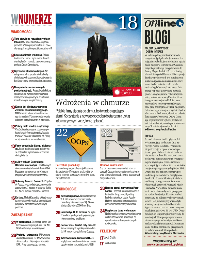 18 WNUMERZE WIADOMOŚCI stawia na rozwój na rynkach 6 Tieto lokalnych. Tieto Poland chce wejść do pierwszej trójki największych firm w Polsce oferujących usługi integracji i doradztwa w IT. gia Oracle w pigułce. Polska 8 Strate konferencja Oracle Day to okazja do omówienia planów i nowości zaprezentowanych podczas Oracle Open World. Wyzwanie: eksplozja danych. Nie 8 zatrzymamy ich przyrostu, a ludzie będą chcieli szybkich odpowiedzi z przetwarzania Big Data – mówi prezes Oracle Corporation. ofertę dostosowaną do 9 Mamy polskich potrzeb. Prezes Oracle Polska spodziewa się wzrostu zainteresowania maszynami zintegrowanymi, architekturą zorientowaną na usługi i chmurą. Kto się boi Międzynarodowego 10 Związku Telekomunikacyjnego. MAC zmieniło zdanie w kwestii rozszerzenia mandatu ITU na gospodarowanie adresami identyfikacyjnymi w internecie. mało wiedzą o cyfryzacji. 12 Polacy Choć działania związane z budową społeczeństwa informacyjnego i cyfryzacją trwają w Polsce już kilkanaście lat, Polacy wciąż niewiele na ten temat wiedzą. w centrum uwagi :GURĝHQLDZFKPXU]H Polskie firmy sięgają do chmur, bo twardo stąpają po ziemi. Korzystanie z nowego sposobu dostarczania usług informatycznych zaczęło się opłacać. 22 potrzebują dialogu z klienta13 Firmy mi. Social media oraz kanał mobilny nie są optymalnie wykorzystane w procesie obsługi klienta. w rękach Centralnego 14 pl.ID Ośrodka Informatyki. Projekt nowych dowodów osobistych wrócił do do MSW. Przestanie zajmować się nim Centrum Projektów Informatycznych przy MAC. Potrzebne procedury IT: nowe kontra stare Inżynieria wymagań obejmuje kluczowe dla projektów IT obszary: analizę biznesową, techniki sprzedaży, metodyki agile, zarządzanie itp. Czy od razu należy wymieniać starszy sprzęt? Czasami opłaca się go eksploatować, ale w taki sposób, by nie powodował dużych kosztów. TECHNOLOGIE dostał zadyszki na Face33 Hadoop booku. Facebook musi analizować 105 Asseco i Comarch. Przycho14 Sukcesy dy Asseco ze sprzedaży oprogramowania zapewniły mu 7 miejsce w rankingu Truffle 100. Na 50 miejscu znalazł się Comarch. Nowości rynkowe. NextiraOne oferuje face. Michał Karandziej o Quadrocop- 28 16 En VDI... 60-rdzeniowy procesor Intela... terze, o latających rojach, o komercjalizacji projektów, o robotach na światowym poziomie. ZARZĄDZANIE Baza danych in-memory w SQL Server… Macierz Storwize V3700 firmy IBM. zbliżyć IT do biznesu. Na styku 29 Jak IT z odbiorcą usług często pojawiają się nieporozumienia i problemy. sieci badań. Do obsługi ponad 100 24 Wlaboratoriów medycznych sieć DIAGNOSTYKA stworzyła autorski system. musi działać cały czas. Do 30 Serwer firm oczekujących wysokiej niezawodności HP kieruje nową platformę Odyssey. i wdrożenia. ERP wspiera 26 Projekty chemię budowlaną... CRM we wrocławskim urzędzie... Piękniejsze róże dzięki ERP... Prognoza pogody z chmury. terabajtów danych co pół godziny. To chyba największy klaster Apache Hadoop na świecie, który doszedł do granic możliwości oprogramowania. dane w chmurze. 34 Bezpieczne Niektóre usługi przechowywania danych w chmurze wyróżnia gwarancja, że operator nie ma dostępu do danych użytkownika. FELIETONY Sterowniki dla Windows RT. Ze 17 Jakub Chabik 33 względu na brak sterowników nie zawsze 17 Piotr Kowalski będzie można skorzystać z portu USB. BLOGI POLSKA JAKO WYBÓR I DOBRY INTERES W trakcie, gdy ogólnokrajowe media przygotowują się do relacjonowania żenującej nawalanki, jaka niechybnie będzie miała miejsce w Warszawie, w Gdańsku najspokojniej trwają przygotowania do Parady Niepodległości. Po raz dziesiąty ulicami Starego i Głównego Miasta przejdzie barwny korowód, a w nim bractwa kurkowe, rycerze, żołnierze, ułani, stare samochody, postaci z epoki i wielu zwykłych gdańszczan, którzy tego dnia zechcą wspólnie cieszyć się z niepodległości. To największa w Polsce impreza, której sukces bierze się głównie z faktu, że organizowana jest oddolnie, przez pasjonatów z sektora pozarządowego, choć przy przychylności władz miejskich. Patronem tegorocznej uroczystości będzie adm. Arend Dickmann, dowódca polskiej floty z czasów bitwy pod Oliwą. Gratuluję organizatorom wyboru postaci, bo świetnie nadaje się ona do prezentowania uwspółcześnionej wersji polskości. Rewers, blog Jakuba Chabika BOHICA Po raz kolejny w sieci krąży eksploit wykorzystujący podatność dnia zerowego Adobe Readera. Tym razem nie potrzebuje w ogóle włączonego Javascriptu, obchodzi również zabezpieczenie sandbox. Do wprowadzania złośliwego oprogramowania cyberprzestępcy używają nie tylko eksploitów wykorzystujące podatność Javy, ale także specjalnie przygotowanych plików PDF. Obchodzą one zabezpieczenia wprowadzone przez Adobe w przeglądarce Reader X i XI, umożliwiając instalację złośliwego oprogramowania mimo włączonych ustawień Protected Mode i Protected View, które dotąd w miarę skutecznie blokowały ataki polegające na kodzie JavaScript. Eksploit ten był omawiany na kilku rosyjskojęzycznych forach i jest już dostępny w zmodyfikowanej wersji narzędzia Blackhole. Jego szacowana cena na czarnym rynku oscyluje między 30 a 50 tys. USD. Obecnie eksploit ten jest wykorzystywany do instalacji złośliwego oprogramowania kierowanego przeciw użytkownikom bankowości elektronicznej. Mechanizm ataku zakłada zamknięcie przeglądarki po załadowaniu złośliwego kodu. Technoblog, blog Marcina Marciniaka Wszystkie blogi na: www.computerworld.pl/blogi