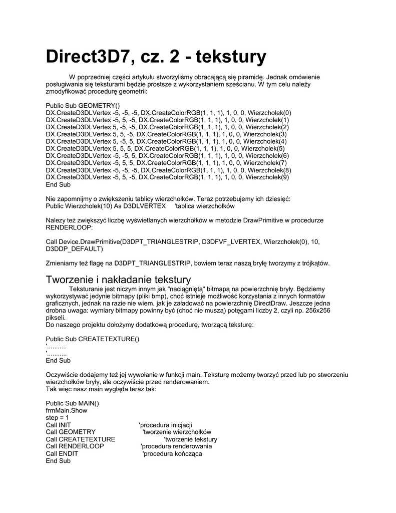 Direct3D7, cz. 2 - tekstury W poprzedniej części artykułu stworzyliśmy obracającą się piramidę. Jednak omówienie posługiwania się teksturami będzie prostsze z wykorzystaniem sześcianu. W tym celu należy zmodyfikować procedurę geometrii: Public Sub GEOMETRY() DX.CreateD3DLVertex -5, -5, -5, DX.CreateColorRGB(1, 1, 1), 1, 0, 0, Wierzcholek(0) DX.CreateD3DLVertex -5, 5, -5, DX.CreateColorRGB(1, 1, 1), 1, 0, 0, Wierzcholek(1) DX.CreateD3DLVertex 5, -5, -5, DX.CreateColorRGB(1, 1, 1), 1, 0, 0, Wierzcholek(2) DX.CreateD3DLVertex 5, 5, -5, DX.CreateColorRGB(1, 1, 1), 1, 0, 0, Wierzcholek(3) DX.CreateD3DLVertex 5, -5, 5, DX.CreateColorRGB(1, 1, 1), 1, 0, 0, Wierzcholek(4) DX.CreateD3DLVertex 5, 5, 5, DX.CreateColorRGB(1, 1, 1), 1, 0, 0, Wierzcholek(5) DX.CreateD3DLVertex -5, -5, 5, DX.CreateColorRGB(1, 1, 1), 1, 0, 0, Wierzcholek(6) DX.CreateD3DLVertex -5, 5, 5, DX.CreateColorRGB(1, 1, 1), 1, 0, 0, Wierzcholek(7) DX.CreateD3DLVertex -5, -5, -5, DX.CreateColorRGB(1, 1, 1), 1, 0, 0, Wierzcholek(8) DX.CreateD3DLVertex -5, 5, -5, DX.CreateColorRGB(1, 1, 1), 1, 0, 0, Wierzcholek(9) End Sub Nie zapomnijmy o zwiększeniu tablicy wierzchołków. Teraz potrzebujemy ich dziesięć: Public Wierzcholek(10) As D3DLVERTEX 'tablica wierzchołków Nalezy też zwiększyć liczbę wyświetlanych wierzchołków w metodzie DrawPrimitive w procedurze RENDERLOOP: Call Device.DrawPrimitive(D3DPT_TRIANGLESTRIP, D3DFVF_LVERTEX, Wierzcholek(0), 10, D3DDP_DEFAULT) Zmieniamy też flagę na D3DPT_TRIANGLESTRIP, bowiem teraz naszą bryłę tworzymy z trójkątów. Tworzenie i nakładanie tekstury Teksturanie jest niczym innym jak "naciągniętą" bitmapą na powierzchnię bryły. Będziemy wykorzystywać jedynie bitmapy (pliki bmp), choć istnieje możliwość korzystania z innych formatów graficznych, jednak na razie nie wiem, jak je załadować na powierzchnię DirectDraw. Jeszcze jedna drobna uwaga: wymiary bitmapy powinny być (choć nie muszą) potęgami liczby 2, czyli np. 256x256 pikseli. Do naszego projektu dołożymy dodatkową procedurę, tworzącą teksturę: Public Sub CREATETEXTURE() '........... '........... End Sub Oczywiście dodajemy też jej wywołanie w funkcji main. Teksturę możemy tworzyć przed lub po stworzeniu wierzchołków bryły, ale oczywiście przed renderowaniem. Tak więc nasz main wygląda teraz tak: Public Sub MAIN() frmMain.Show step = 1 Call INIT Call GEOMETRY Call CREATETEXTURE Call RENDERLOOP Call ENDIT End Sub 'procedura inicjacji 'tworzenie wierzchołków 'tworzenie tekstury 'procedura renderowania 'procedura kończąca Deklarujemy też dodatkową zmienną - powierzchnię, która będzie przechowywała teksturę: Public tekstura As DirectDrawSurface7 'powierzchnia tekstury Teraz zajmiemy się właściwym stworzeniem tekstury. W procedurze CreateTexture deklarujemy zmienną opisu powierzchni DirectDrawSurface7: Dim TekstDesc As DDSURFACEDESC2 Ustawiamy flagi tego opisu, tak, aby można było potem opisać pole DDSD_CAPS: TekstDesc.lFlags = DDSD_CAPS Należy zaznaczyć, że tworzona powierzchnia będzie teksturą - ustawiamy odpowiednią flagę: TekstDesc.ddsCaps.lCaps = DDSCAPS_TEXTURE Mamy już gotowy opis. Wywołujac metodę CreateSurfaceFromFile z obiektu DirectDraw tworzymy teksturę z pliku bitmapy: Set tekstura = DD.CreateSurfaceFromFile(App.path & "/" & "1TeksturaD3D.bmp", TekstDesc) Na koniec musimy jeszcze ustawić teksturę na urządzeniu renderującym. Służy do tego odpowiednia metodą obiektu Direct3DDevice7: Device.SetTexture 0, tekstura Jako drugi parametr należy przekazać nazwę powierzchni przechowującej teksturę, zaś jako pierwszy 0. Spójrzmy na efekt naszej pracy. Na razie nie wygląda zbyt ciekawie. Po prostu musimy odpowiednio naciągnąć teksturę na naszą bryłę. Zasady przedstawia poniższy rysunek: Do ustawiania współrzędnej tekstury na wierzchołku służą parametry tu (odpowiada współrzędnej poziomej) oraz tv (współrzędnej pionowej). Tak więc procedurę geometrii należy zmodyfikować np. w ten sposób: Public Sub GEOMETRY() DX.CreateD3DLVertex 0, 10, 0, DX.CreateColorRGBA(0, 1, 0, 1), 1, 0.5, 0, Wierzcholek(0) DX.CreateD3DLVertex 0, -5, 10, DX.CreateColorRGBA(1, 1, 1, 1), 1, 1, 1, Wierzcholek(1) DX.CreateD3DLVertex 10, -5, 0, DX.CreateColorRGBA(1, 1, 1, 1), 1, 0, 1, Wierzcholek(2) DX.CreateD3DLVertex 0, -5, -10, DX.CreateColorRGBA(1, 0, 0, 1), 1, 1, 1, Wierzcholek(3) DX.CreateD3DLVertex -10, -5, 0, DX.CreateColorRGBA(1, 1, 0, 1), 1, 0, 1, Wierzcholek(4) DX.CreateD3DLVertex 0, -5, 10, DX.CreateColorRGBA(1, 1, 1, 1), 1, 1, 1, Wierzcholek(5) End Sub Jedynka we współrzędnych oznacza wykorzystanie całej długości bądź szerokości tekstury. Jesli chcemy skorzystać tylko z jej części, to współrzędna musi być mniejsza od jednego. A oto efekt naszej dotychczasowej pracy: Rozciągnięcie tekstury możemy zmieniać poprzez modyfikację współrzędnych tu i tv dla poszczególnych wierzchołków. Dzięki temu, można używać tylko fragmentu tekstury lub nałożyć ją kilka razy. Poniżej mamy przykład: Przemnożyliśmy każdą współrzędną przez 0.5 - uzyskaliśmy nałożenie tylko fragmentu tekstury, a przez to jej rozciągnięcie. Tutaj przemnożyliśmy każdą współrzędną przez 2. Uzyskaliśmy dwukrotne wklejenie tekstury wzdłuż każdej z osi współrzędnych. Oczywiście wartości tu i tv mogą być przemnażane niezależnie dla każdego wierzchołka - radzę poeksperymetować. Tryby adresowe tekstury (Texture adressing modes) Przemnóżmy każdą współrzędną tu i tv dla każdego wierzchołka przez 3. - ęłęóD3DTADDRESS_WRAP - to tryb domyślny (owijanie). Jego efekt widzieliśmy powyżej. - D3DTADDRESS_MIRROR - to efekt lustra. Jego działanie widzimy poniżej:ęłęó Jak widać każde kolejne nałożenie tekstury na ścianę jest lustrzanym odbiciem poprzedniego. W pojedyńczym pasie używane jest odbicie względem pionowej osi. Poszczególne pasy są odbijane wzdłuż poziomej osi. - D3DTADRE