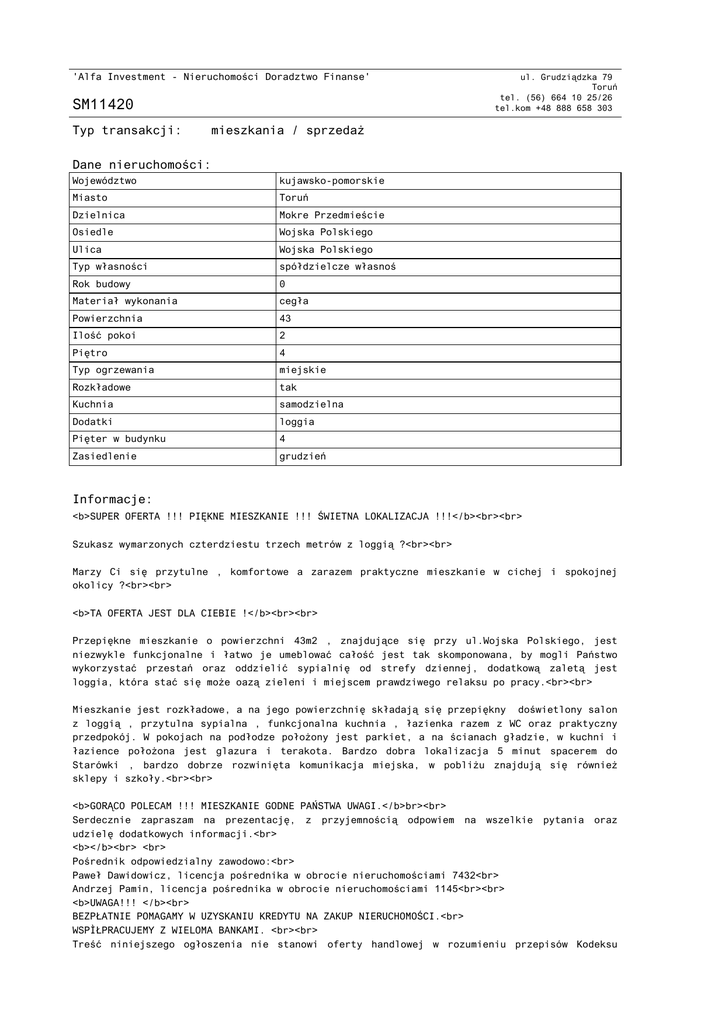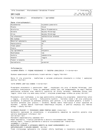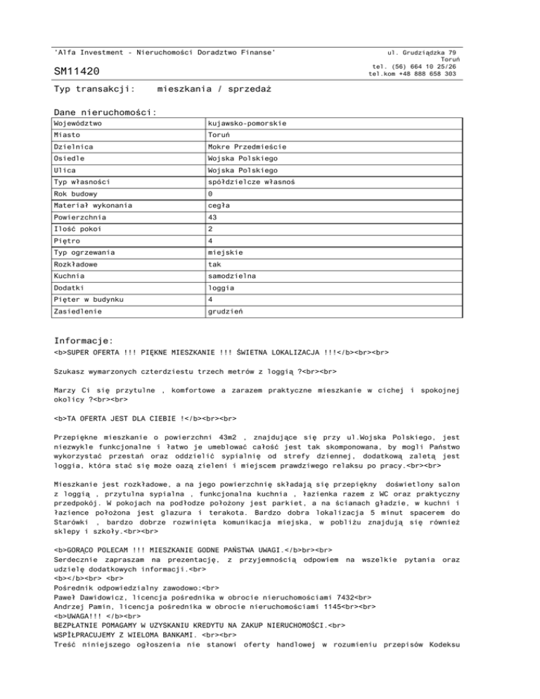 'Alfa Investment - Nieruchomości Doradztwo Finanse' SM11420 Typ transakcji: ul. Grudziądzka 79 Toruń tel. (56) 664 10 25/26 tel.kom +48 888 658 303 mieszkania / sprzedaż Dane nieruchomości: Województwo kujawsko-pomorskie Miasto Toruń Dzielnica Mokre Przedmieście Osiedle Wojska Polskiego Ulica Wojska Polskiego Typ własności spółdzielcze własnoś Rok budowy 0 Materiał wykonania cegła Powierzchnia 43 Ilość pokoi 2 Piętro 4 Typ ogrzewania miejskie Rozkładowe tak Kuchnia samodzielna Dodatki loggia Pięter w budynku 4 Zasiedlenie grudzień Informacje: <b>SUPER OFERTA !!! PIĘKNE MIESZKANIE !!! ŚWIETNA LOKALIZACJA !!!</b><br><br> Szukasz wymarzonych czterdziestu trzech metrów z loggią ?<br><br> Marzy Ci się przytulne , komfortowe a zarazem praktyczne mieszkanie w cichej i spokojnej okolicy ?<br><br> <b>TA OFERTA JEST DLA CIEBIE !</b><br><br> Przepiękne mieszkanie o powierzchni 43m2 , znajdujące się przy ul.Wojska Polskiego, jest niezwykle funkcjonalne i łatwo je umeblować całość jest tak skomponowana, by mogli Państwo wykorzystać przestań oraz oddzielić sypialnię od strefy dziennej, dodatkową zaletą jest loggia, która stać się może oazą zieleni i miejscem prawdziwego relaksu po pracy.<br><br> Mieszkanie jest rozkładowe, a na jego powierzchnię składają się przepiękny doświetlony salon z loggią , przytulna sypialna , funkcjonalna kuchnia , łazienka razem z WC oraz praktyczny przedpokój. W pokojach na podłodze położony jest parkiet, a na ścianach gładzie, w kuchni i łazience położona jest glazura i terakota. Bardzo dobra lokalizacja 5 minut spacerem do Starówki , bardzo dobrze rozwinięta komunikacja miejska, w pobliżu znajdują się również sklepy i szkoły.<br><br> <b>GORĄCO POLECAM !!! MIESZKANIE GODNE PAŃSTWA UWAGI.</b>br><br> Serdecznie zapraszam na prezentację, z przyjemnością odpowiem na wszelkie pytania oraz udzielę dodatkowych informacji.<br> <b></b><br> <br> Pośrednik odpowiedzialny zawodowo:<br> Paweł Dawidowicz, licencja pośrednika w obrocie nieruchomościami 7432<br> Andrzej Pamin, licencja pośrednika w obrocie nieruchomościami 1145<br><br> <b>UWAGA!!! </b><br> BEZPŁATNIE POMAGAMY W UZYSKANIU KREDYTU NA ZAKUP NIERUCHOMOŚCI.<br> WSPÓŁPRACUJEMY Z WIELOMA BANKAMI. <br><br> Treść niniejszego ogłoszenia nie stanowi oferty handlowej w rozumieniu przepisów Kodeksu Cywilnego.<br><br> Więcej ofert na <b>www.alfa-investment.pl</b><br><br> <b>ZAPRASZAMY!</b> Cena: 199 000 PLN Dokument wygenerowany ze strony www.alfa-investment.pl Strona 2