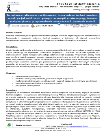 FRDL to 25 lat doświadczenia . Najlepsze praktyki. Renomowani eksperci. Tysiące szkoleń . Wiemy, dlaczego szkolimy! Zarządzanie ryzykiem oraz monitorowanie i ocena systemu kontroli zarządczej w praktyce jednostek samorządowych - obowiązki w zakresie przygotowania analizy ryzyka oraz przeprowadzenia samooceny funkcjonowania kontroli zarządczej miejsce: siedziba FRDL, budynek Europejskiego termin:22 października godziny: 10:00 – 15:00 Centrum Solidarności Adresaci szkolenia: Szkolenie skierowane jest do pracowników samorządowych jednostek organizacyjnych odpowiedzialnych za koordynację i zarządzanie systemem kontroli zarządczej w jednostce, jak również pracowników zaangażowanych w przeprowadzenie analizy ryzyka oraz oceny kontroli zarządczej w jednostce. Cel szkolenia: Ostatni kwartał każdego roku jest okresem, w którym poszczególne jednostki samorządowe szczególną uwagę i czas poświęcają na dopełnienie obowiązków związanych z procesem zarządzania ryzykiem oraz monitorowaniem i oceną funkcjonowania całego systemu kontroli zarządczej. Przygotowanie analizy ryzyka oraz określenie reakcji na ryzyko i sposobu zarządzania mechanizmami kontroli, jak również przygotowanie oceny funkcjonowania systemu kontroli zarządczej to działania, które w tym czasie podejmujemy. Dlatego też podstawowym założeniem szkolenia jest przedstawienie praktycznych aspektów dotyczących wskazanych procesów, ze szczególnym akcentem zajęć warsztatowych w zakresie przygotowania analizy ryzyka oraz przeprowadzenia corocznej oceny funkcjonowania kontroli zarządczej w jednostce. Otrzymasz: fachowe wsparcie od praktyka, możliwość rozwiązania problemów, poznania trudnych przypadków, możliwość przedyskutowania kwestii spornych i trudnych z prowadzącym i innymi uczestnikami, materiały szkoleniowe i imienne zaświadczenie udziału, poczęstunek kawowy i lunch. Prowadzący: Specjalizuje się w tematyce zamówień publicznych, kontroli projektów oraz funduszy unijnych, jak również kontroli zarządczej i funkcjonowania administracji publicznej. Aktywny doradca zamawiających i wykonawców w procesie udzielania zamówień publicznych oraz beneficjentów funduszy unijnych w zakresie realizacji projektów. Od 2008 r. trener prowadzący szkolenia z zakresu zamówień publicznych, kontroli zarządczej i zarządzania w administracji publicznej oraz finansów publicznych i funduszy unijnych, jak również wykładowca w ramach studiów podyplomowych dla administracji publicznej m.in. w zakresie zamówień publicznych, polityki regionalnej UE oraz audytu i kontroli. Przez 17 lat związany z administracją publiczną – doświadczenie na stanowisku audytora wewnętrznego, wieloletni kierownik komórek weryfikacji wniosków o dofinansowanie projektów oraz kontroli projektów w ramach funduszy unijnych (ZPORR, INTERREG III, POKL). Zarządzał procesami związanymi z kontrolą zarządczą oraz uczestniczył w tworzeniu procedur ZPORR i POKL. Współorganizator i koordynator systemów zarządzania w ramach funduszy unijnych. Absolwent Wydziału Prawa i Administracji Uniwersytetu Mikołaja Kopernika w Toruniu oraz Instytutu Ekonomii i Zarządzania Uniwersytetu Jagiellońskiego w Krakowie. Zapytaj o szkolenie Olga Zawojek 58 77 24 214, 509 498 613, [email protected] Pla c S ol id ar n o śc i 1, 8 0 – 86 3 w w w. gd an sk .f rd l .p l , b iu ro @gd a n sk. frd l.p l Program szkolenia: I. Zagadnienia ogólne: 1. Misja i cel – czas zacząć! 2. Umiejscowienie procesu zarządzania ryzykiem w systemie administracji publicznej. 3. Podstawowe pojęcia dotyczące ryzyka i procesu zarządzania nim. 4. Ryzyko i zarządzanie ryzykiem a kontrola zarządcza. 5. Jaki jest cel i sens wdrażania systemu zarządzania ryzykiem w jednostkach sektora publicznego? II. Proces zarządzania ryzykiem 1. Cechy skutecznego systemu zarządzania ryzykiem. 2. Właściciel ryzyka. 3. Procedura zarządzania ryzykiem: - identyfikacja ryzyka (techniki identyfikacji oraz właściwy opis ryzyka, dopuszczalna tolerancja), - ocena ryzyka (metody szacowania ryzyka – prawdopodobieństwo, skutek), - reakcja na ryzyko. 4. Dokumentacja procesu zarządzania ryzykiem. 5. Rejestr ryzyk. 6. Monitorowanie ryzyka. 7. Obszary funkcjonowania administracji publicznej szczególnie narażone na ryzyko. III. Przygotowanie analizy ryzyka – praktyczny warsztat: 1. Źródła informacji o ryzykach w działalności jednostki. 2. Mierniki w analizie ryzyka. 3. Jak przypisać istotność i prawdopodobieństwo. 4. Mechanizmy kontroli – jak zminimalizować ryzyko. 5. Szczegółowość rejestru ryzyk. IV. Wspomaganie systemu zarządzania ryzykiem poprzez wykorzystanie wewnętrznych mechanizmów organizacyjnych jednostki. 1. Audyt i kontrola wewnętrzna. 2. Rola i odpowiedzialność na poszczególnych szczeblach stanowisk w instytucji. 3. Mechanizmy kontroli zarządczej w zarządzaniu ryzykiem. V. Monitorowanie i ocena funkcjonowania systemu kontroli zarządczej – zapewnienie o stanie kontroli zarządczej: 1. Narzędzia monitorowania sytemu kontroli zarządczej. 2. Jakie obszary i procesy w administracji publicznej powinny być monitorowane. 3. Źródła zapewnienia o stanie kontroli zarządczej. 4. Kwestionariusz samooceny – praktyczny warsztat: - jak przygotować, aby faktycznie służył samoocenie, - jak formułować pytania, - w jaki sposób odczytać i jak kwantyfikować wyniki przedstawione w formularzu, - kto powinien uczestniczyć w procesie samooceny. 5. Oświadczenie o stanie kontroli zarządczej 6. Częstotliwość monitorowania i dokonywania oceny systemu kontroli zarządczej. VI. Efektywna komunikacja w kontroli zarządczej: 1. Jaki jest cel efektywnej komunikacji? 2. Modele i kanały komunikacji. 3. Narzędzia komunikacji 4. Język komunikacji. 5. Grupy docelowe - komunikacja wewnętrzna i zewnętrzna. 6. Bariery i przeszkody w komunikacji - przyczyny i skutki. 7. Informacja zwrotna – jako mechanizm usprawniaj