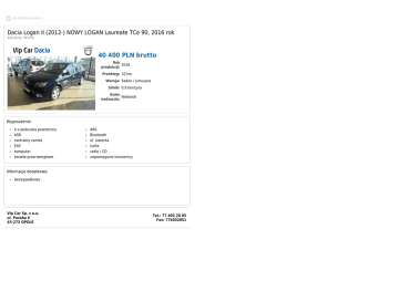 Dacia Logan II (2012-) NOWY LOGAN Laureate TCe 90, 2016 rok Kod oferty: VIP-236 40 400 PLN brutto Rok 2016 produkcji: Przebieg: 10 km Wersja: Sedan / Limuzyna Silnik: 0.9 benzyna Kolor Niebieski nadwozia: Wyposażenie: - 4 x poduszka powietrzna ASR centralny zamek ESP komputer światła przeciwmgłowe - ABS Bluetooth el. lusterka Isofix radio / CD wspomaganie kierownicy Informacje dodatkowe: - bezwypadkowy Vip Car Sp. z o.o. ul. Pużaka 6 45-273 OPOLE Tel.: 77 403 20 05 Fax: 774032051