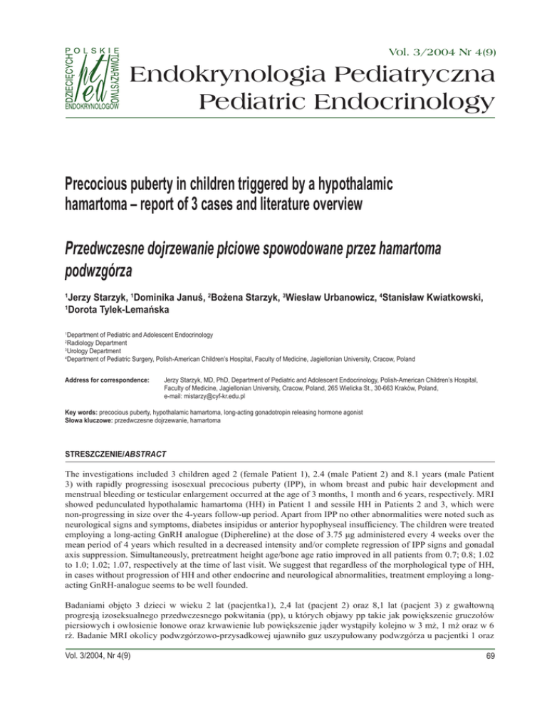 Vol. 3/2004 Nr 4(9) Endokrynologia Pediatryczna Pediatric Endocrinology Precocious puberty in children triggered by a hypothalamic hamartoma – report of 3 cases and literature overview Przedwczesne dojrzewanie płciowe spowodowane przez hamartoma podwzgórza Jerzy Starzyk, 1Dominika Januś, 2Bożena Starzyk, 3Wiesław Urbanowicz, 4Stanisław Kwiatkowski, 1 Dorota Tylek-Lemańska 1 Department of Pediatric and Adolescent Endocrinology Radiology Department 3 Urology Department 4 Department of Pediatric Surgery, Polish-American Children’s Hospital, Faculty of Medicine, Jagiellonian University, Cracow, Poland 1 2 Address for correspondence: Jerzy Starzyk, MD, PhD, Department of Pediatric and Adolescent Endocrinology, Polish-American Children’s Hospital, Faculty of Medicine, Jagiellonian University, Cracow, Poland, 265 Wielicka St., 30-663 Kraków, Poland, e-mail: [email protected] Key words: precocious puberty, hypothalamic hamartoma, long-acting gonadotropin releasing hormone agonist Słowa kluczowe: przedwczesne dojrzewanie, hamartoma STRESZCZENIE/ STRESZCZENIE/ABSTRACT The investigations included 3 children aged 2 (female Patient 1), 2.4 (male Patient 2) and 8.1 years (male Patient 3) with rapidly progressing isosexual precocious puberty (IPP), in whom breast and pubic hair development and menstrual bleeding or testicular enlargement occurred at the age of 3 months, 1 month and 6 years, respectively. MRI showed pedunculated hypothalamic hamartoma (HH) in Patient 1 and sessile HH in Patients 2 and 3, which were non-progressing in size over the 4-years follow-up period. Apart from IPP no other abnormalities were noted such as neurological signs and symptoms, diabetes insipidus or anterior hypophyseal insufficiency. The children were treated employing a long-acting GnRH analogue (Diphereline) at the dose of 3.75 μg administered every 4 weeks over the mean period of 4 years which resulted in a decreased intensity and/or complete regression of IPP signs and gonadal axis suppression. Simultaneously, pretreatment height age/bone age ratio improved in all patients from 0.7; 0.8; 1.02 to 1.0; 1.02; 1.07, respectively at the time of last visit. We suggest that regardless of the morphological type of HH, in cases without progression of HH and other endocrine and neurological abnormalities, treatment employing a longacting GnRH-analogue seems to be well founded. Badaniami objęto 3 dzieci w wieku 2 lat (pacjentka1), 2,4 lat (pacjent 2) oraz 8,1 lat (pacjent 3) z gwałtowną progresją izoseksualnego przedwczesnego pokwitania (pp), u których objawy pp takie jak powiększenie gruczołów piersiowych i owłosienie łonowe oraz krwawienie lub powiększenie jąder wystąpiły kolejno w 3 mż, 1 mż oraz w 6 rż. Badanie MRI okolicy podwzgórzowo-przysadkowej ujawniło guz uszypułowany podwzgórza u pacjentki 1 oraz Vol. 3/2004, Nr 4(9) 69 Praca kazuistyczna Endokrynol. Ped., 3/2004;4(9):69-74 guzy nieuszypułowane podwzgórza u pacjentów 2 i 3. Nie stwierdzono progresji zmian w okresie 4 lat obserwacji. Poza pp guzy nie powodowały zaburzeń neurologicznych, moczówki prostej ani niedoczynności przedniego płata przysadki. Leczenie zachowawcze długodziałającym analogiem GnRH w dawce 3,75 ug co 4 tygodnie w ciągu 4-letniego okresu leczenia spowodowało zmniejszenie lub całkowitą regresję cech przedwczesnego pokwitania. Obserwowano także poprawę prognozy wzrostu końcowego wyrażoną wskaźnikiem wiek wzrostowy/ wiek kostny, odpowiednio: 0,7; 0,8; 1,02 (przed leczeniem) do 1,0; 1,02; 1,07 (przy ostatniej wizycie). Wydaje się, że niezależnie od morfologicznego typu guza, w przypadku braku progresji zmiany oraz objawów neurologicznych i innych niż pp zaburzeń endokrynologicznych, stosowane leczenie zachowawcze analogiem GnRH jest uzasadnione. Introduction As a consequence of the use of new brain imaging techniques, hypothalamic hamartoma (HH) is now considered the most common cause of isosexual precocious puberty (IPP), especially in young children [1, 2]. HH is a congenital malformation, consisting of a tumor-like nodule mimicking a normal hypothalamus in the interpeduncular cistern, and usually demonstrating an anatomical connection to the hypothalamus [1, 3, 4]. It can be associated with gelastic seizures, petit-mal or generalized tonic/clonic seizures, developmental delay, behavioral disturbances and dysmorphic syndromes [5]. The indication for surgery of a HH associated with IPP is controversial. At present, both medical and surgical therapies are seen to variably influence precocious puberty and to slow progressive skeletal maturation [1, 6–9]. Current data support the effectiveness and safety of long-acting Gonadotropin Releasing Hormone (Gn-RH) analogue therapy for IPP due to HH [1, 3, 10–12], when the risk involved and the effect of surgery on endocrinological abnormalities is difficult to predict, even employing the recently refined microsurgical techniques. We present the auxological, hormonal and radiological outcome of long-acting Gn-RH analogue treatment in children with IPP due to pedunculated and sessile HH. Patients and methods The investigations included 3 children with rapidly progressing IPP aged 2 years (female Patient 1), 2.4 years (male Patient 2) and 8.1 years (male Patient 3), in whom breast enlargement and menarche were noted at 3 months of age (Patient 1), while testicular enlargement and pubic hair growth were respectively observed at 1 month of age and 6 years of life (Patient 2 and 3) (Table I). The diagnosis of GnRH-dependent IPP was confirmed in all patients by GnRH test (measuring luteinizing hormone (LH) and folliculo-stimulating hormone (FSH) levels before and 20, 30, and 60 min after the administration of 100 ug LHRH, (Ferring, Germany) in IV bolus. Magnetic resonance imaging (MRI) of the hypothalamic-hypophyseal region was performed employing a 1.5 Tesla MRI unit (Signa-Horizon, Hi-Speed, General Electric, USA), with 3-mm slices obtained on sag