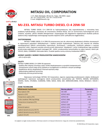 MJ-233. MITASU TURBO DIESEL CI-4 20W-50 MITASU TURBO DIESEL CI-4 20W-50 to hydrosyntetyczny olej wyprodukowany z mineralnej bazy poddanej hydrokrakingu, stosowany do smarowania silników Diesla. Jest on wzmocniony technologicznie przez unikalne, wysokiej jakości dodatki detergentowe i dyspergujące dla złagodzenia negatywnych skutków podczas spalania oleju napędowego zawierającego wysokie stężenie siarki i policykliczne węglowodory. ZASTOSOWANIE MITASU TURBO DIESEL CI-4 20W-50 przeznaczony jest do całorocznej eksploatacji silników stosowanych w ciężarowych pojazdach dalekobieżnych i ciężkim sprzęcie budowlanym. Zalecany jest również do silników wysokoprężnych lekkich samochodów ciężarowych, terenowych i autobusów, zasilanych paliwem o wyższej zawartości siarki. Zapewnia wysoką ochronę przed utlenianiem. Wydajność i cechy środowiskowe tego produktu przekraczają większość surowych wymagań API , ACEA i producentów samochodów na całym świecie, takich jak: VOLVO, Mack, CUMMINS i Mercedes-Benz. Produkt spełnia normy ochrony środowiska EURO-3. NORMY JAKOŚCI I NORMY PRODUCENTÓW SAMOCHODÓW - API CI-4/CH-4/SL ZALETY MITASU TURBO DIESEL CI-4 20W-50 zapewnia: - Stabilny film olejowy chroniący części silnika eksploatowane w wysokich temperaturach - Zmniejszenie zużycia oleju przez spalanie w szczególności w silnikach o dużym przebiegu - Wydłużenie okresu eksploatacji/ interwał wymiany oleju - Maksymalną stabilność termiczną - Doskonałą ochronę przed korozją Najnowsze technologie MITASU Oil Corporation, Japonia zapewniają produkowanie olejów silnikowych spełniających najnowsze wymagania takich producentów samochodów jak: TOYOTA, NISSAN, MITSUBISHI, MAZDA, ISUZU, HYUNDAI, CUMMINS, FORD, MACK, MAN, DAF, MERCEDES-BENZ, IVECO, RENAULT, VOLVO i innych. DANE TECHNICZNE Właściwości techniczne Normy jakości Klasa lepkości SAE SAE J300 20W-50 Gęstość w 15ºC ASTM D-4052 0,8750 Temperatura zapłonu [ºC] ASTM D-92 Liczba zasadowa TBN [mg KOH/g] ASTM D-2896 Temperatura krzepnięcia [ºC] ASTM D-97 Kolor ASTM D-1500 < 3,0 ASTM D-2270 135 ASTM D-445 175,90 ASTM D-445 19,93 ASTM D-5293 6350 Wskaźnik lepkości Lepkość dynamiczna przy 40 [ C] o Lepkość dynamiczna przy 100 Lepkość CCS [cP] [oC] Parametry 236 14,00 -24 Ze względu na ciągły rozwój produktu, informacje zawarte w niniejszym dokumencie mogą ulec zmianie bez powiadomienia. © 2016 Mitasu Oil Corporation, Japan.