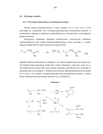 106 4.3. Dyskusja wyników 4.3.1. Wewnątrzcząsteczkowe przeniesienie protonu Wyniki badań przedstawionych w pracy (punkty 4.2.1, 4.2.2, 4.2.3, 4.2.4) pozwalają na wyjaśnienie roli wewnątrzcząsteczkowego przeniesienia protonu w mechanizmie utleniania rodnikiem wodorotlenkowym aminokwasów zawierających grupę tioeterową. Pierwotnym produktem utleniania aminokwasów tioeterowych rodnikiem wodorotlenkowym jest rodnik hydroksysulfuranylowy, który powstaje w wyniku addycji rodnika OH do siarki tioeterowej (reakcja [39]). R (CH2)n S CH CO2- + .OH k(OH + S) NH3+ R (CH2)n CO2- .S CH OH NH3+ [39] Rodniki hydroksysulfuranylowe zanikają w (i) reakcji spontanicznej dysocjacji (kd), (ii) katalizowanej protonami środowiska reakcji eliminacji cząsteczki wody (kH) i (iii) podstawienia anionu OH- przez drugą cząsteczkę aminokwasu (kS) (schemat 2) (podobnie jak to ma miejsce w modelowych kwasach alkilotiokarboksylowych punkt 4.2.1) oraz w (iv) reakcji wewnątrzcząsteczkowego przeniesienia protonu, w której bierze udział protonowana grupa aminowa (kNH) (schemat 2). Schemat 2 CO2H R .S OH kd _ OH- CH _H O NH3+ kH kNH CO2H 2 + + H3O _ 2H O 2 kS H2N. +. . S R S _ OHCO2H S R .S+ CH NH3+ R CO2H R S. . .+ S CH NH3+ CH NH3+ CO2H 107 W dotychczasowej literaturze (Hiller i in. 1981) udział tego ostatniego procesu w metioninie był brany pod uwagę tylko w roztworach słabo kwaśnych i obojętnych. Opierając się na widmach absorpcyjnych otrzymanych dla metioniny w roztworach silnie kwaśnych (rysunki 4.2.2_1 i 4.2.2_3) proces wewnątrzcząsteczkowego przeniesienia protonu od protonowanej grupy aminowej (kNH, schemat 2) może skutecznie konkurować z międzycząsteczkowym przeniesieniem protonów ze środowiska reakcji do rodnika hydroksysulfuranylowego (kH, schemat 2), nawet w warunkach wysokiego stężenia protonów w środowisku reakcji. W niskim pH (pH < 2) i przy stosunkowo niskim stężeniu aminokwasu (< 10-2 mol dm-3) udział spontanicznej dysocjacji rodnika hydroksysulfuranylowego oraz podstawienia anionu OH- przez drugą cząsteczkę aminokwasu (opisywanych odpowiednio stałymi szybkości kd i kS) jest do zaniedbania w procesie zaniku rodnika hydroksysulfuranylowego. W warunkach prowadzenia eksperymentu (pH 1, stężenie aminokwasu 2*10-3 mol dm-3) obserwowane procesy rodnikowe w metioninie sprowadzają się do konkurencji pomiędzy wewnątrzcząsteczkowym przeniesieniem protonu z protonowanej grupy aminowej (kNH) i katalizowaną protonami środowiska (kH) eliminacją cząsteczki wody. Wymienione procesy prowadzą do dwóch różnych rodnikowych produktów pośrednich (schemat 3), których identyfikacja i ilościowe oznaczenie umożliwiło wyznaczenie stałej szybkości wewnatrzcząsteczkowego przeniesienia protonu (kNH) w metioninie. Schemat 3 CH2 CH2 H3C H .S CH O NH2 + CO2H CO2H H kH H3O+ ( - 2 H2O) H3C S +. CH CH2 CH2 NH3+ S kNH - H2O + CO2H S∴ S S∴ NH2 H3C + Reakcja z udziałem protonów grupy aminowej prowadzi do powstawania kationorodników z wewnątrzcząsteczkowym wiązaniem trójelektronowym pomiędzy 108 siarką i azotem (kNH, schematy 2 i 3), które są jednym z prekursorów dekarboksylacji. Pasmo absorpcji z λmax ~ 390 nm można z całą pewnością przypisać kationorodnikowi z wiązaniem trójelektronowym (S∴N)1 ponieważ obserwowano je tylko w związkach dysponujących "kwasowymi" protonami wolnych (nieacylowanych) grup aminowych (Met i Met-OMe, rysunki 4.2.2_1 i 4.2.2_3). Konkurencyjna, wobec powstawania kationorodnika z wiązaniem S∴N, reakcja dehydratacji rodników hydroksysulfuranylowych z udziałem protonów środowiska (kH, schematy 2 i 3) prowadzi do monomerycznego kationorodnika >S.+. Kationorodnik ten znajduje się w zależnej od stężenia aminokwasu równowadze z kationorodnikiem dimerowym (S∴S)+ 2, którego powstawanie w metioninie i jej pochodnych obserwuje się w niskim pH, zarówno metodą radiolizy impulsowej jak i EPR. Przyjęcie założeń o konkurencyjności procesów przeniesienia protonów ze środowiska (kH) i z grupy aminowej (kNH) do rodnika hydroksysulfuranylowego (schemat 3), oraz że stałe szybkości przeniesienia protonów środowiska (kH) i molowe współczynniki kationorodników dimerowych z międzycząsteczkowym wiązaniem trójelektronowym S∴S w Met i Ac-Met nie powinny się zasadniczo różnić, pozwala obliczyć stałą szybkości (kNH) w metioninie ze wzoru (XXIII): 1 Molowy współczynnik absorpcji kationorodnika (S∴N)+ ε390 = 4600+/-200 dm3mol-1cm-1 wyznaczyłem z widma otrzymanego w roztworze Met-OMe (2*10-3 mol dm-3, pH 6,7) 2 µs po impulsie, przy założeniu 80% konwersji rodników OH, wygenerowanych podczas napromieniania, w kationorodniki (S∴N)+ (G((S∴N)+) = 0,8*G(OH)pH 6,7 = 4,6). Met-OMe został wybrany dlatego, że w wyniku zablokowania grupy karboksylowej przez estryfikację jest w nim zahamowana dekarboksylacja i w konsekwencji jest spowolniony zanik kationorodnika z wiązaniem S∴N. Połówkowy czas życia kationorodnika z wiązaniem S∴N w Met-OMe wynosi τ1/2 > 300 µs a w Met τ1/2 ~ 200 ns. Procent konwersji wynika z przyjęcia za Hiller i in. 1981, że około 20% wygenerowanych w układzie rodników hydroksylowych reaguje z aminokwasem poprzez oderwanie wodoru od węgla w pozycji α do siarki tioeterowej. 2 Molowy współczynnik absorpcji kationorodnika (S∴S)+ ε490 = 8600+/-200 dm3mol-1cm-1 wyznaczyłem z widma otrzymanego w roztworze Ac-Met-OMe (2*10-3 mol dm-3, pH 1) 2 µs po impulsie (rysunek 3.2.2_4 krzywa b), przy założeniu 80% konwersji rodników OH wygenerowanych podczas napromieniania w kationorodniki (S∴S)+ (G((S∴S)+) = 0,8*G(OH)pH 1 = 2,3). Ac-MetOMe został wybrany ponieważ nie występuje w nim reakcja prowadząca do kationorodnika z wiązaniem S∴N oraz reakcja dekarboksylacji. 109 k NH k NH G((S ∴ N ) + ) Met = + k H [ H3O + ] G((S ∴ N ) + ) Met + G((S ∴ S ) + ) Met (XXIII) gdzie: kNH - stała szybkości wewnątrzcząsteczkowego przeniesienia protonu z grupy aminowe
