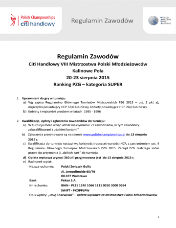 Regulamin Zawodów Regulamin Zawodów Ci1 Handlowy VIII Mistrzostwa Polski Młodzieżowców Kalinowe Pola 20-‐23 sierpnia 2015 Ranking PZG – kategoria SUPER 1. Uprawnieni do gry w turnieju: a) Wg zapisu Regulaminu Głównego Turniejów Mistrzowskich PZG 2015 – ust. 2 pkt a), mężczyźni posiadający HCP 18,0 lub niższy, kobiety posiadające HCP 24,0 lub niższy. b) Kobiety i mężczyźni urodzeni w latach 1985 -‐ 1996 2. Kwalifikacje, opłaty i zgłoszenia zawodników do turnieju: a) W turnieju może wziąć udział maksymalnie 72 zawodników, w tym zawodnicy zakwalifikowani z „dzikimi kartami”. b) Zgłoszenia przyjmowane są na stronie www.polishchampionships.pl do 13 sierpnia 2015 r. c) Kwalifikacja do turnieju nastąpi wg kolejności rosnącej wartości HCP, z zastrzeżeniem ust. 4 Regulaminu Głównego Turniejów Mistrzowskich PZG 2015. Zarząd PZG zastrzega sobie prawo do przyznania 3 „dzikich kart” do turnieju. d) Opłata wpisowa wynosi 360 zł i przyjmowana jest do 13 sierpnia 2015 r. e) Rachunek wpłat: Nazwa rachunku: Bank: Nr rachunku: Polski Związek Golfa Al. Jerozolimskie 65/79 00-‐697 Warszawa Pekao S.A. IBAN -‐ PL31 1240 1066 1111 0010 3000 0684 SWIFT -‐ PKOPPLPW Opis wpłaty: „Imię i nazwisko” – opłata wpisowa za Mistrzostwa Polski Młodzieżowców 1 Regulamin Zawodów 3. Potwierdzenie lub rezygnacja z uczestnictwa w turnieju: a) Zawodnik jest zobowiązany potwierdzić udział w turnieju do godziny 15:00 19 sierpnia 2015 r. W przypadku braku potwierdzenia uiszczona opłata wpisowa nie podlega zwrotowi. b) Zawodnik może potwierdzić udział w turnieju w następujący sposób: • telefonicznie pod nr 664-‐316-‐511 -‐ 17 i 18 sierpnia 2015 r. w godz. od 10:00 do 17:00, 19 sierpnia 2015 r. w godz. od 10:00 do 15:00, • osobiście w dniu treningowym od godziny 10:00 do 15:00 w Biurze Zawodów. c) Rezygnacja z uczestnictwa w turnieju następuje wg zapisu Regulaminu Głównego Turniejów Mistrzowskich PZG 2015 – ust. 5. d) Zawodnik niezrzeszony w PZG i biorący udział w turnieju, zobowiązany jest do przedstawienia certyfikatu wystawionego przez narodowy związek/federacje potwierdzający jego aktualny HCP w wersji papierowej do Biura Zawodów lub wysyłając e-‐mail na adres poczty elektronicznej [email protected] najpóźniej do godziny 15:00 19 sierpnia 2015 r. Osoba, która tego nie zrobi nie może wziąć udziału w turnieju. 4. Format turnieju; tees, klasyfikacje: a) Turniej rozgrywany będzie w formacie stroke play na 36 dołkach (2 rundy x 18 dołków): • 20 sierpnia – I runda, • 21 sierpnia – II runda, • CUT – wg zapisu Regulaminu Głównego Turniejów Mistrzowskich PZG 2015 – ust. 12, • 22 sierpnia rano – I runda match play bruho między zawodnikami w danej grupie, według tabeli z załącznika nr 1 do niniejszego regulaminu, • 22 sierpnia po południu – II runda match play bruho między zawodnikami w danej grupie według tabeli z załącznika nr 1 do niniejszego regulaminu, • 23 sierpnia rano – III runda dla mężczyzn – match play bruho między zawodnikami w danej grupie według tabeli z załącznika nr 1 do niniejszego regulaminu, • 23 sierpnia po południu – IV runda dla mężczyzn i III dla kobiet – match play bruho o miejsca 1-‐4. 2 Regulamin Zawodów b) Tee – turniejowe PZG: • długość pola dla mężczyzn -‐ (żółte) – z uwzględnieniem zmian długości dozwolonych przez Europejską Federację Golfa (EGA), • długość pola dla kobiet -‐ (czerwone) – z uwzględnieniem zmian długości dozwolonych przez Europejską Federację Golfa (EGA). c) Mecze match play rozgrywane są w systemie bruho bez uwzględniania HCP i muszą zakończyć się zwycięstwem jednego z zawodników. Jeżeli po rozegraniu 18 dołków mecz nie jest rozstrzygnięty, zawodnicy kontynuują grę na dołkach wyznaczonych przez Komitet turnieju. Po rozstrzygnięciu swojego meczu, zawodnicy nie mogą kontynuować gry i muszą zejść z pola pod rygorem dyskwalifikacji. d) Wynik zakończonego meczu musi być przekazany do Komitetu Turnieju przez zwycięzcę meczu niezwłocznie po jego zakończeniu pod rygorem kary dyskwalifikacji. 5. Zwycięzcy turnieju: Zwycięzcy turnieju Mistrzostw Polski Młodzieżowców otrzymują następujące tytuły: a) W kategorii mężczyzn: • I miejsce – Mistrz Polski kategorii Młodzieżowców, • II miejsce – I Wicemistrz Polski kategorii Młodzieżowców, • III miejsce – II Wicemistrz Polski kategorii Młodzieżowców. b) W kategorii kobiet: • I miejsce – Mistrzyni Polski kategorii Młodzieżowców, • II miejsce – I Wicemistrzyni Polski kategorii Młodzieżowców, • III miejsce – II Wicemistrzyni Polski kategorii Młodzieżowców. 6. Ranking PZG: Punkty do rankingu otrzymają członkowie PZG wg Regulaminu Rankingu PZG 2015. 3 Załącznik nr 1 Tabele meczów match play – mężczyźni Tabela dla mężczyzn I runda II runda III runda IV runda MECZ A 1 vs 16 MECZ I zwycięzcy A i B MECZ M zwycięzcy I i J 1 vs 2 zwycięzcy M i N MECZ B 8 vs 9 MECZ J zwycięzcy C i D MECZ N zwycięzcy K i L 3 vs 4 pokonani M i N MECZ C 5 vs 12 MECZ K zwycięzcy E i F MECZ D 4 vs 13 MECZ L zwycięzcy G i H MECZ E 3 vs 14 MECZ F 6 vs 11 MECZ G 7 vs 10 MECZ H 2 vs 15 Tabela dla Kobiet I runda II runda III runda MECZ A 1 vs 8 MECZ E zwycięzcy A i B 1 vs 2 zwycięzcy E i F MECZ B 4 vs 5 MECZ F zwycięzcy C i D 3 vs 4 pokonani E i F MECZ C 3 vs 6 4
