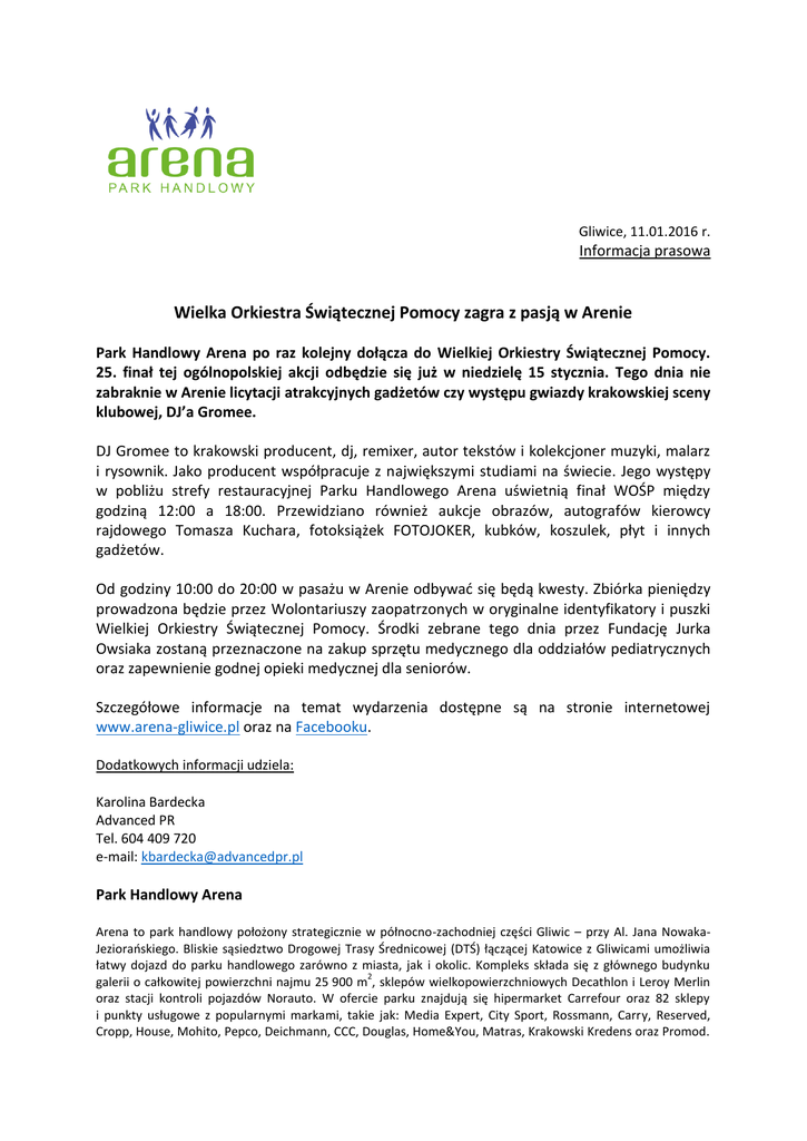 Gliwice, 11.01.2016 r. Informacja prasowa Wielka Orkiestra Świątecznej Pomocy zagra z pasją w Arenie Park Handlowy Arena po raz kolejny dołącza do Wielkiej Orkiestry Świątecznej Pomocy. 25. finał tej ogólnopolskiej akcji odbędzie się już w niedzielę 15 stycznia. Tego dnia nie zabraknie w Arenie licytacji atrakcyjnych gadżetów czy występu gwiazdy krakowskiej sceny klubowej, DJ’a Gromee. DJ Gromee to krakowski producent, dj, remixer, autor tekstów i kolekcjoner muzyki, malarz i rysownik. Jako producent współpracuje z największymi studiami na świecie. Jego występy w pobliżu strefy restauracyjnej Parku Handlowego Arena uświetnią finał WOŚP między godziną 12:00 a 18:00. Przewidziano również aukcje obrazów, autografów kierowcy rajdowego Tomasza Kuchara, fotoksiążek FOTOJOKER, kubków, koszulek, płyt i innych gadżetów. Od godziny 10:00 do 20:00 w pasażu w Arenie odbywać się będą kwesty. Zbiórka pieniędzy prowadzona będzie przez Wolontariuszy zaopatrzonych w oryginalne identyfikatory i puszki Wielkiej Orkiestry Świątecznej Pomocy. Środki zebrane tego dnia przez Fundację Jurka Owsiaka zostaną przeznaczone na zakup sprzętu medycznego dla oddziałów pediatrycznych oraz zapewnienie godnej opieki medycznej dla seniorów. Szczegółowe informacje na temat wydarzenia dostępne są na stronie internetowej www.arena-gliwice.pl oraz na Facebooku. Dodatkowych informacji udziela: Karolina Bardecka Advanced PR Tel. 604 409 720 e-mail: [email protected] Park Handlowy Arena Arena to park handlowy położony strategicznie w północno-zachodniej części Gliwic – przy Al. Jana NowakaJeziorańskiego. Bliskie sąsiedztwo Drogowej Trasy Średnicowej (DTŚ) łączącej Katowice z Gliwicami umożliwia łatwy dojazd do parku handlowego zarówno z miasta, jak i okolic. Kompleks składa się z głównego budynku 2 galerii o całkowitej powierzchni najmu 25 900 m , sklepów wielkopowierzchniowych Decathlon i Leroy Merlin oraz stacji kontroli pojazdów Norauto. W ofercie parku znajdują się hipermarket Carrefour oraz 82 sklepy i punkty usługowe z popularnymi markami, takie jak: Media Expert, City Sport, Rossmann, Carry, Reserved, Cropp, House, Mohito, Pepco, Deichmann, CCC, Douglas, Home&You, Matras, Krakowski Kredens oraz Promod. Dla klientów dostępny jest również bezpłatny parking, mieszczący 1 300 samochodów. Właścicielem Parku Handlowego Arena jest fundusz EPISO 3, zarządzany przez firmę Tristan Capital Partners.