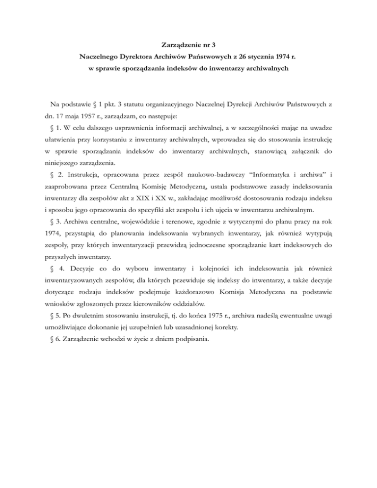 Zarządzenie nr 3 Naczelnego Dyrektora Archiwów Państwowych z 26 stycznia 1974 r. w sprawie sporządzania indeksów do inwentarzy archiwalnych Na podstawie § 1 pkt. 3 statutu organizacyjnego Naczelnej Dyrekcji Archiwów Państwowych z dn. 17 maja 1957 r., zarządzam, co następuje: § 1. W celu dalszego usprawnienia informacji archiwalnej, a w szczególności mając na uwadze ułatwienia przy korzystaniu z inwentarzy archiwalnych, wprowadza się do stosowania instrukcję w sprawie sporządzania indeksów do inwentarzy archiwalnych, stanowiącą załącznik do niniejszego zarządzenia. § 2. Instrukcja, opracowana przez zespół naukowo-badawczy “Informatyka i archiwa” i zaaprobowana przez Centralną Komisję Metodyczną, ustala podstawowe zasady indeksowania inwentarzy dla zespołów akt z XIX i XX w., zakładając możliwość dostosowania rodzaju indeksu i sposobu jego opracowania do specyfiki akt zespołu i ich ujęcia w inwentarzu archiwalnym. § 3. Archiwa centralne, wojewódzkie i terenowe, zgodnie z wytycznymi do planu pracy na rok 1974, przystąpią do planowania indeksowania wybranych inwentarzy, jak również wytypują zespoły, przy których inwentaryzacji przewidzą jednoczesne sporządzanie kart indeksowych do przyszłych inwentarzy. § 4. Decyzje co do wyboru inwentarzy i kolejności ich indeksowania jak również inwentaryzowanych zespołów, dla których przewiduje się indeksy do inwentarzy, a także decyzje dotyczące rodzaju indeksów podejmuje każdorazowo Komisja Metodyczna na podstawie wniosków zgłoszonych przez kierowników oddziałów. § 5. Po dwuletnim stosowaniu instrukcji, tj. do końca 1975 r., archiwa nadeślą ewentualne uwagi umożliwiające dokonanie jej uzupełnień lub uzasadnionej korekty. § 6. Zarządzenie wchodzi w życie z dniem podpisania. 2 Załącznik do Zarządzenia nr 3 Naczelnego Dyrektora Archiwów Państwowych z 26 stycznia 1974 r. w sprawie sporządzania indeksów do inwentarzy archiwalnych Instrukcja w sprawie sporządzania indeksów do inwentarzy archiwalnych I. Uwagi ogólne Indeksy do inwentarzy mają na celu poprawę jakości informacji archiwalnej oraz skrócenie czasu poszukiwań. Są to alfabetycznie usystematyzowane wykazy osób i nazw geograficznych do tytułów poszczególnych pozycji wpisanych do inwentarza oraz wykazy haseł sygnalizujących przedmiot spraw w nich zawartych. Indeksy według załączonej instrukcji należy sporządzać do inwentarzy zespołów akt wytworzonych w zasadzie w XIX i XX w., które w registraturach twórców zespołów narastały w sposób rzeczowy lub chronologiczno-rzeczowy. Inwentarze do zespołów, których jednostki łączono w sposób numeryczny, mogą być brane pod uwagę jedynie wtedy, gdy w poszczególnych pozycjach inwentarza – poza numerami spraw – podano również regesty tych spraw. Indeksowaniem należy w pierwszej kolejności objąć zespoły objętościowo duże, zawierające materiały o bardzo zróżnicowanej treści, szczególnie cenne dla badań naukowych i potrzeb gospodarki narodowej, pod warunkiem że są one ostatecznie opracowane i posiadają bądź inwentarz kartkowy, bądź książkowy oraz stałą (ostateczną) sygnaturę. Ponadto należy indeksować inwentarze tych zespołów akt, przy których porządkowaniu odtworzono w sposób nie dość przejrzysty układy kancelaryjne lub popełniono błędy, powodujące trudności w dotarciu do poszukiwanych materiałów. Podstawą do sporządzania indeksów są w zasadzie tytuły poszczególnych jednostek wpisanych do inwentarza lub regesty spraw w nich zawartych. W przypadkach wątpliwych należy przewidzieć możliwość sprawdzenia zawartości źródłowej jednostki inwentarzowej. Nie należy natomiast indeksować inwentarzy, które w sposób co najmniej dostateczny nie informują badacza o treści materiałów. Do inwentarzy zespołów akt, zwłaszcza wytworzonych przez organy ogólnej administracji państwowej (tzw. bezpośredniej), należy w zasadzie przewidzieć opracowanie następujących indeksów: a) nazw osobowych; b) nazw geograficznych (topograficznych i podziału administracyjnego kraju); 3 c) przedmiotowego. Nie wszystkie jednak inwentarze zespołów akt wymagają opracowania trzech wyżej wymienionych rodzajów indeksów. Dla szeregu inwentarzy wystarczą bądź tylko indeksy osób, bądź miejscowości, bądź przedmiotowe. Można również w uzasadnionych przypadkach sporządzać jeden indeks mieszany. Wybór właściwego rodzaju indeksu (lub indeksów) danego inwentarza powinien być dostosowany do rodzaju i treści materiałów, a także potrzeb użytkownika. Wiążące decyzje w tej kwestii podejmuje każdorazowo Komisja Metodyczna. Indeksowaniu podlegają w zasadzie wszystkie pozycje inwentarza. W uzasadnionych przypadkach można wyłączyć od indeksowania tytuły określonych grup akt. Instrukcja, zwłaszcza w odniesieniu do indeksu przedmiotowego, ustala przede wszystkim ogólne zasady. Przy sporządzaniu indeksów do konkretnych inwentarzy zaleca się stosowanie pewnej elastyczności w postępowaniu. Wybór właściwej metody winien być uzależniony od treści materiałów wchodzących w skład zespołu. Indeksujący powinien wydobyć – zwłaszcza w indeksie przedmiotowym – wszystkie te dane, które stanowią specyfikę materiałów danego zespołu. Sporządzanie indeksów do inwentarzy należy w miarę możliwości powierzać tym archiwistom, którzy porządkowali i inwentaryzowali dany lub podobny zespół akt. Przed przystąpieniem do prac nad indeksowaniem należy zapoznać się z literaturą przedmiotu, której spis załączono do instrukcji1 oraz z projektem wytycznych w sprawie sporządzania indeksów stanowiącym załącznik nr 2 do pisma okólnego nr 3 NDAP z dnia 28 II 1961 r.2 II. Indeks osobowy 1. Indeksem osobowym należy objąć nazwy własne osób fizycznych wymienionych w poszczególnych tytułach lub regestach jednostek wpisanych do inwentarza. Mogą to być: a) nazwiska