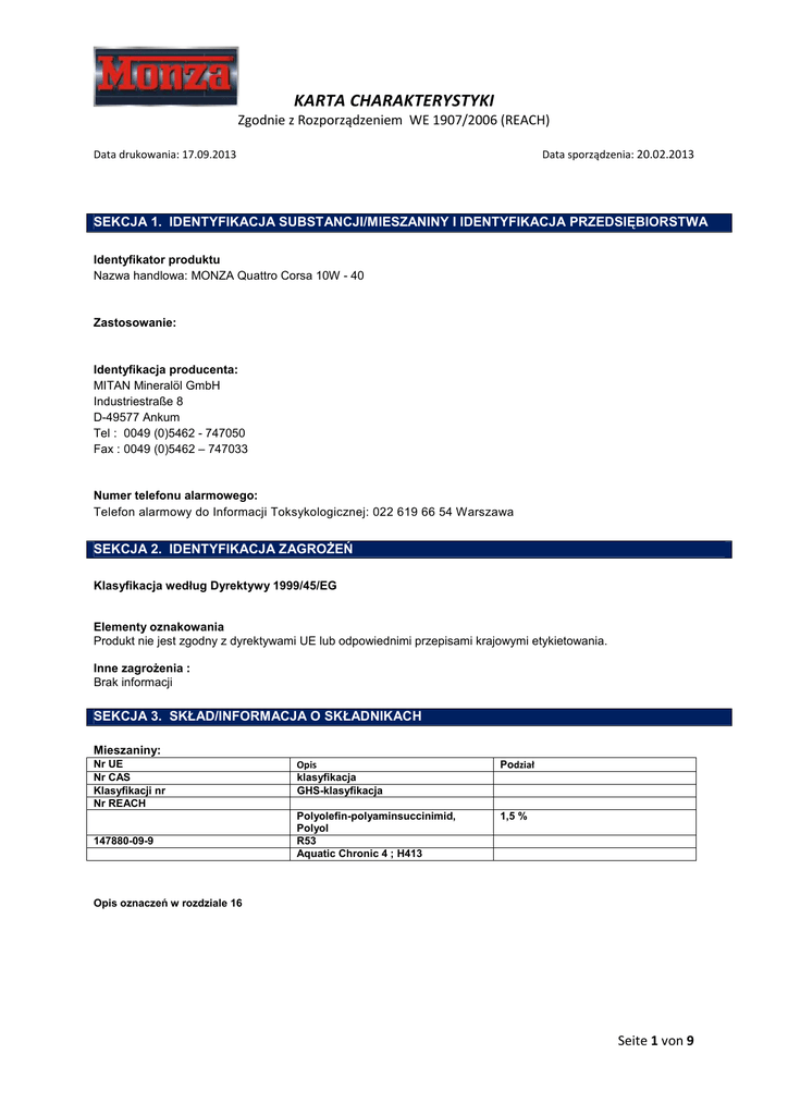 KARTA CHARAKTERYSTYKI Zgodnie z Rozporządzeniem WE 1907/2006 (REACH) Data sporządzenia: 20.02.2013 Data drukowania: 17.09.2013 SEKCJA 1. IDENTYFIKACJA SUBSTANCJI/MIESZANINY I IDENTYFIKACJA PRZEDSIĘBIORSTWA Identyfikator produktu Nazwa handlowa: MONZA Quattro Corsa 10W - 40 Zastosowanie: Identyfikacja producenta: MITAN Mineralöl GmbH Industriestraße 8 D-49577 Ankum Tel : 0049 (0)5462 - 747050 Fax : 0049 (0)5462 – 747033 Numer telefonu alarmowego: Telefon alarmowy do Informacji Toksykologicznej: 022 619 66 54 Warszawa SEKCJA 2. IDENTYFIKACJA ZAGROŻEŃ Klasyfikacja według Dyrektywy 1999/45/EG Elementy oznakowania Produkt nie jest zgodny z dyrektywami UE lub odpowiednimi przepisami krajowymi etykietowania. Inne zagrożenia : Brak informacji SEKCJA 3. SKŁAD/INFORMACJA O SKŁADNIKACH Mieszaniny: Nr UE Nr CAS Klasyfikacji nr Nr REACH 147880-09-9 Opis klasyfikacja GHS-klasyfikacja Podział Polyolefin-polyaminsuccinimid, Polyol R53 Aquatic Chronic 4 ; H413 1,5 % Opis oznaczeń w rozdziale 16 Seite 1 von 9 KARTA CHARAKTERYSTYKI Zgodnie z Rozporządzeniem WE 1907/2006 (REACH) Data drukowania: 17.09.2013 Data sporządzenia: 20.02.2013 SEKCJA 4. ŚRODKI PIERWSZEJ POMOCY Informacje ogólne Pierwsza pomoc : Zmienić zabrudzone ubrania. Nie nosić ściereczek czyszczących produktów impregnowanych w kieszeniach spodni. W przypadku wdychania : W przypadku wdychania aerozolu / mgły / odpryskowych: skonsultować się z lekarzem. Zapewnić świeże powietrze poszkodowanemu. / Nie wdychać pyłu / dymu / gazu / mgły pary / rozpylonej cieczy. Zapewnić warunki do odpoczynku w pozycji umożliwiającej swobodne oddychanie. W przypadku wdychania aerozolu / mgły / odpryskowych: skonsultować się z lekarzem. Po kontakcie ze skórą Po kontakcie ze skórą, natychmiast zdjąć całą zanieczyszczoną odzież. Myć wodą z mydłem. W przypadku wystąpienia podrażnienia skóry lub wysypki: Zasięgnąć porady / pomocy lekarskiej. Po kontakcie z oczami Natychmiast dokładnie płukać wodą. W przypadku wystąpienia dolegliwości, - skonsultować się z lekarzem. Po połknięciu : Natychmiast wypłukać usta i popić dużą ilością wody. W razie połknięcia nie wywoływać wymiotów. Niezwłocznie zasięgnąć porady lekarza i Pokazując opakowanie i etykietę. 4.2. Ostre i opóźnione objawy oraz skutki Brak danych 4.3. Wskazania dotyczące wszelkiej natychmiastowej pomocy lekarskiej i szczególnego postępowania w przypadku gdy poszkodowany wymiotuje – Ryzyko zachłyśniecia – Skontaktować się z lekarzem. Zagrożenia dla układu oddechowego: Skontaktować się z lekarzem. SEKCJA 5. POSTĘPOWANIE W PRZYPADKU POŻARU 5.1. Środki gaśnicze Odpowiednie środki gaśnicze : Użycie środków gaśniczych dostosować do otoczenia. Dwutlenek węgla (CO2). Pralnia chemiczna. Piana. Ze względów bezpieczeństwa Środki gaśnicze nieprzydatne : Silny strumień wody. 5.2. Szczególne zagrożenia związane z substancją lub mieszaniną Szczególne zagrożenia ze strony substancji - produktów spalania lub gazów powstałych w wyniku spalania : Dwutlenek węgla (CO2). Tlenek węgla. Tlenki siarki. Tlenki fosforu. Siarkowodór ( H2S ) 5.3. Informacje dla straży pożarnej Seite 2 von 9 KARTA CHARAKTERYSTYKI Zgodnie z Rozporządzeniem WE 1907/2006 (REACH) Data drukowania: 17.09.2013 Data sporządzenia: 20.02.2013 Występowanie sadzy w przypadku występowania pożaru Stosować niezależny aparat do oddychania. Nie wdychać gazów powstających podczas eksplozji i pożarów. W razie pożaru: Stosować niezależny aparat do oddychania. Dodatkowe informacje : Zbierania zanieczyszczonej wody gaśniczej oddzielnie. Nie odprowadzać do kanalizacji i zbiorników wodnych. Postępować zgodnie z obowiązującymi przepisami. W celu ochrony osób i dla schłodzenia pojemników w obszarze zagrożenia Stosować zraszanie wodą. SEKCJA 6. POSTĘPOWANIE W PRZYPADKU NIEZAMIERZONEGO UWOLNIENIA DO ŚRODOWISKA Indywidualne środki ostrożności Unikać zanieczyszczenia oczu, skóry i ubrania. Stosować środki ochrony indywidualnej. Uwaga: Rozlane oleje mogą powodować śliskość powierzchni. Środki ostrożności w zakresie ochrony środowiska Nie dopuścić do przedostania się produktu do studzienek ściekowych, wód i gleby. W przypadku dużych wycieków ograniczyć rozprzestrzenianie się rozlewiska przez obwałowanie terenu. Metody i materiały zapobiegające rozprzestrzenianiu się skażenia i czyszczenia Materiał wiążący ciecz (piasek, ziemia okrzemkowa, materiał wiążący kwasy, materiał wiążący uniwersalny) Metody i materiały zapobiegające rozprzestrzenianiu się skażenia i służące do usuwania skażenia Wycieki absorbować obojętnym, niepalnym materiałem chłonnym, zebrać do zamykanego, oznakowanego pojemnika wody na odpady. Unieszkodliwiać zgodnie z obowiązującymi przepisami. Odniesienia do innych sekcji : Powiadomić odpowiednie władze w przypadku wydostania się gazu lub dostania się cieczy do zbiorników wodnych , gruntu lub kanalizacji. Dodatkowe informacje Brak SEKCJA 7. POSTĘPOWANIE Z SUBSTANCJAMI I MIESZANINAMI ORAZ ICH MAGAZYNOWANIE 7.1. Środki ostrożności dotyczące bezpiecznego postępowania Wskazówki odnośnie bezpiecznego obchodzenia się Stosować krem ochronny skóry do ochrony skóry. Przed przerwą i po zakończeniu pracy umyć ręce. Warunki, których należy unikać: Tworzenie aerozolu lub mgły. Informacje o zagrożeniu pożarem lub wybuchem : Środki specjalne nie są konieczne. Nie palić tytoniu w czasie pracy. Klasa zagrożenia pożarem: B (DIN-/EN-Norma: EN2) Dodatkowe informacje : Brak danych 7.2. Warunki bezpiecznego magazynowania : Wymagania wobec pomieszczeń magazynowych i zbiorników Przechowywać pojemnik szczelnie zamknięty. Przechowywać z dala od źródeł ciepła. Trzymać / przechowywać tylko w oryginalnym opakowaniu. Seite 3 von 9 KARTA CHARAKTERYSTYKI Zgodnie z Rozporządzeniem WE 1907/2006 (REACH) Data sporządzenia: 20.02.2013 Data drukowania: 