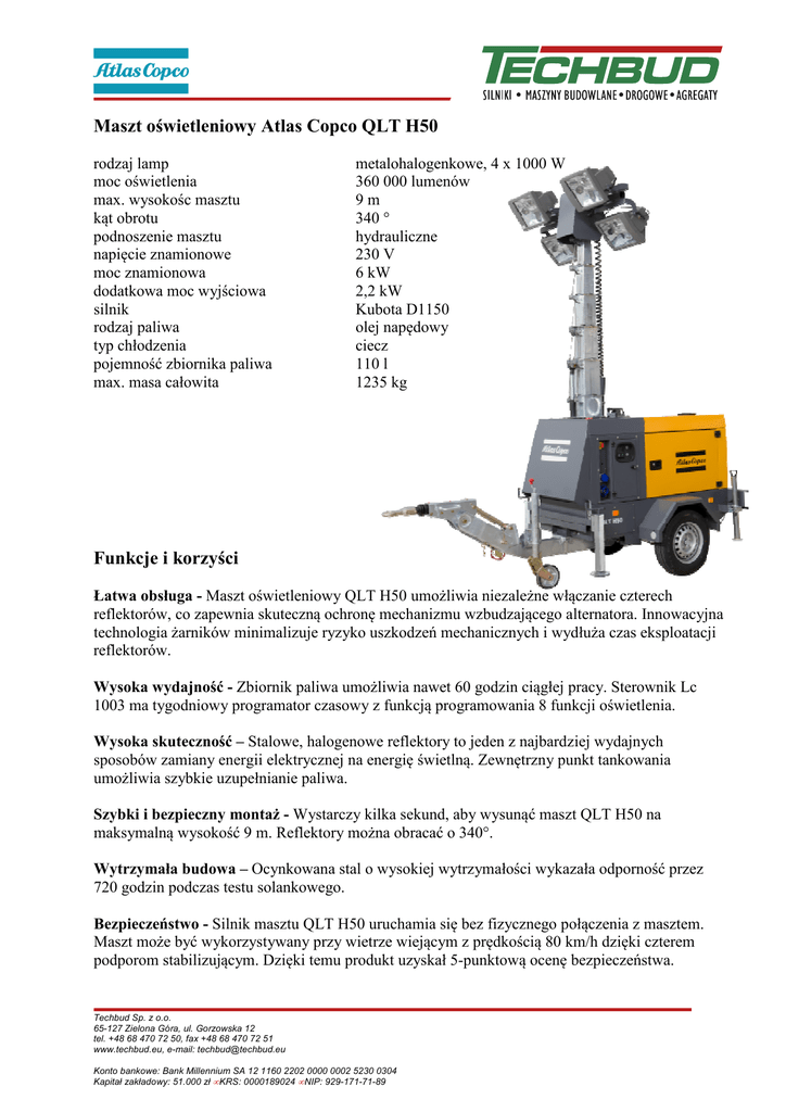 Maszt oświetleniowy Atlas Copco QLT H50 rodzaj lamp moc oświetlenia max. wysokośc masztu kąt obrotu podnoszenie masztu napięcie znamionowe moc znamionowa dodatkowa moc wyjściowa silnik rodzaj paliwa typ chłodzenia pojemność zbiornika paliwa max. masa całowita metalohalogenkowe, 4 x 1000 W 360 000 lumenów 9m 340 ° hydrauliczne 230 V 6 kW 2,2 kW Kubota D1150 olej napędowy ciecz 110 l 1235 kg Funkcje i korzyści Łatwa obsługa - Maszt oświetleniowy QLT H50 umożliwia niezależne włączanie czterech reflektorów, co zapewnia skuteczną ochronę mechanizmu wzbudzającego alternatora. Innowacyjna technologia żarników minimalizuje ryzyko uszkodzeń mechanicznych i wydłuża czas eksploatacji reflektorów. Wysoka wydajność - Zbiornik paliwa umożliwia nawet 60 godzin ciągłej pracy. Sterownik Lc 1003 ma tygodniowy programator czasowy z funkcją programowania 8 funkcji oświetlenia. Wysoka skuteczność – Stalowe, halogenowe reflektory to jeden z najbardziej wydajnych sposobów zamiany energii elektrycznej na energię świetlną. Zewnętrzny punkt tankowania umożliwia szybkie uzupełnianie paliwa. Szybki i bezpieczny montaż - Wystarczy kilka sekund, aby wysunąć maszt QLT H50 na maksymalną wysokość 9 m. Reflektory można obracać o 340°. Wytrzymała budowa – Ocynkowana stal o wysokiej wytrzymałości wykazała odporność przez 720 godzin podczas testu solankowego. Bezpieczeństwo - Silnik masztu QLT H50 uruchamia się bez fizycznego połączenia z masztem. Maszt może być wykorzystywany przy wietrze wiejącym z prędkością 80 km/h dzięki czterem podporom stabilizującym. Dzięki temu produkt uzyskał 5-punktową ocenę bezpieczeństwa. Techbud Sp. z o.o. 65-127 Zielona Góra, ul. Gorzowska 12 tel. +48 68 470 72 50, fax +48 68 470 72 51 www.techbud.eu, e-mail: [email protected] Konto bankowe: Bank Millennium SA 12 1160 2202 0000 0002 5230 0304 Kapitał zakładowy: 51.000 zł • KRS: 0000189024 • NIP: 929-171-71-89