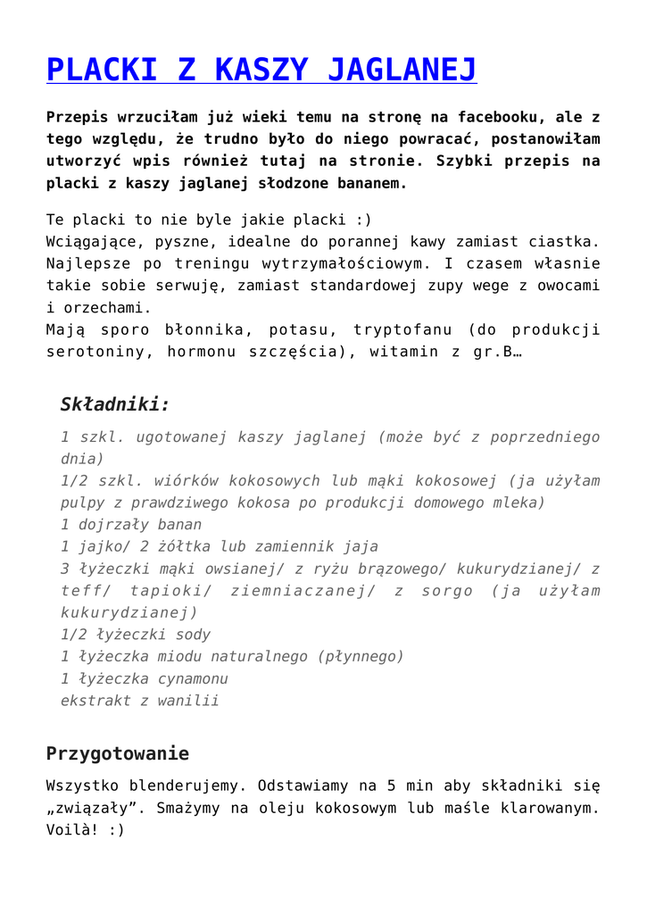 PLACKI Z KASZY JAGLANEJ Przepis wrzuciłam już wieki temu na stronę na facebooku, ale z tego względu, że trudno było do niego powracać, postanowiłam utworzyć wpis również tutaj na stronie. Szybki przepis na placki z kaszy jaglanej słodzone bananem. Te placki to nie byle jakie placki :) Wciągające, pyszne, idealne do porannej kawy zamiast ciastka. Najlepsze po treningu wytrzymałościowym. I czasem własnie takie sobie serwuję, zamiast standardowej zupy wege z owocami i orzechami. Mają sporo błonnika, potasu, tryptofanu (do produkcji serotoniny, hormonu szczęścia), witamin z gr.B… Składniki: 1 szkl. ugotowanej kaszy jaglanej (może być z poprzedniego dnia) 1/2 szkl. wiórków kokosowych lub mąki kokosowej (ja użyłam pulpy z prawdziwego kokosa po produkcji domowego mleka) 1 dojrzały banan 1 jajko/ 2 żółtka lub zamiennik jaja 3 łyżeczki mąki owsianej/ z ryżu brązowego/ kukurydzianej/ z teff/ tapioki/ ziemniaczanej/ z sorgo (ja użyłam kukurydzianej) 1/2 łyżeczki sody 1 łyżeczka miodu naturalnego (płynnego) 1 łyżeczka cynamonu ekstrakt z wanilii Przygotowanie Wszystko blenderujemy. Odstawiamy na 5 min aby składniki się „związały”. Smażymy na oleju kokosowym lub maśle klarowanym. Voilà! :) uwaga: aby zachować właściwości miodu, lepiej placki nim posmarować, niż dodawać do ciasta. Smacznego!